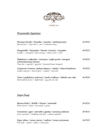 Przystawki/Appetizer Pieczone buraki / bryndza / orzechy / miód gryczany Roasted beets / sheep cheese / nuts / buckwheat honey 32 PLN Przegrzebki / kaszanka / kawior z ł ososia / szczypior Scallops / „kaszanka” black sausage / salmon caviar / chive 49 PLN Polędwica z tuńczyka / warzywa / jajko poche/ winegret z fermentowanej cytryny Tuna loin / vegetable / egg poche / fermented lemon vinaigrette 54 PLN Carpaccio z ł ososia /palone kapary / rukola / oliwa bazyliowa Salmon carpaccio / burned capers / arugula / basil olive 39 PLN Tatar z polędwicy woł owej / masł o truflowe / żół tko sous vide Beef tenderloin tartar / truffle butter / egg yolk sous vide 46 PLN Zupa/Soup Barszcz biał y / królik / chrzan / ziemniak White borsch / rabbit / horseradish / potato 29 PLN Consomme z gęsi / pierożki z gęsiną / warzywa julienne Goose consomme / dumplings with goose / julienne vegetables 29 PLN Zupa rybna / owoce morza / szafran / trawa cytrynowa Fish soup / seafood / saffron / lemon grass 36 PLN Danie gł ówne/Main Course Linguini sepia / krewetki / chorizo / prosecco / kolendra Linguini sepia / shrimps / chorizo / prosecco / coriander 48 PLN Sandacz/soczewica beluga / mał że nowozelandzkie/ mikro warzywa 64 PLN Pikeperch /beluga lentils / New Zealand mussels / micro vegetables Ryba dnia Fish of the day _ PLN Pierogi z cielęciną i borowikami /chrupiący bekon /szalotka Dumplings with veal and boletus /crispy bacon / shallot 42 PLN Kaczka confit /śliwkowe purée /fondant ziemniaczany /buraczki Duck confit / plum purée / potato fondant / beetroot 68 PLN Zając / suszone borowiki /purée selerowe /brukselka Hare / dried boletus / celery puree / brussel 86 PLN Antrykot woł owy dojrzewający / konfitowane marchwki /ziemniak z popioł u / szpinakowy majonez Maturing beef entrecote / confit carrots /ember potatoe / spinach mayonnaise 96 PLN Desery/Desserts Śliwki / czekolada / wiśniówka Plum / chocolate / cherry liqueur 28 PLN Sernik / biał a czekolada / malina Cheesecake / white chocolate / raspberry 29 PLN Beza / krem waniliowy / żurawina Meringue / vanilla cream / cranberry 29 PLN Lody/ sorbety rzemieślnicze Hand made ice creams / sorbets 27 PLN