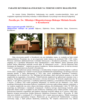 PARAFIE RZYMSKO-KATOLICKIE NA TERENIE GMINY BIAŁOŚLIWIE Na terenie Gminy Białośliwie funkcjonują trzy parafie rzymsko-katolickie, które pod względem organizacji kościelnej wchodzą w skład dekanatu wyrzyskiego oraz diecezji bydgoskiej. Parafia pw. Św. Mikołaja i Błogosławionego Biskupa Michała Kozala w Krostkowie Data erygowania parafii: XIII/XIV w. Miejscowości należące do parafii: Bąkowo, Dębówko Nowe, Dębówko Stare, Komorowo, Krostkowo. Data utworzenia parafii w Krostkowie nie jest dokładnie znana, ze względu na brak źródeł dokumentalnych. Przyjmuje się, że jej erygowanie miało miejsce na przełomie XIII i XIV wieku. Pierwsze natomiast udokumentowane wzmianki historyczne o Krostkowie pochodzą z 1493 roku i znajdują się w łacińskim dokumencie braci Danaborskich z rodu Pałuków, którzy dokonali przed królem Janem Olbrachtem podziału swoich dóbr. W dokumencie owym – „Divisio Bonorum Inter Germanos de Damaborz” – pojawia się nazwa Crosthkowo. Można domniemywać, że ród ten również wzniósł i wyposażył pierwszy kościół w Krostkowie. Pierwsze zachowane pisane informacje o krostkowskiej świątyni pochodzą dopiero z połowy XVII wieku i znajdują się w aktach wizytacyjnych archidiakonatu kamieńskiego, do którego wówczas należała parafia. Z opisu dokonanego w 1653 roku, przez archidiakona Stanisława Trzebnica, dowiadujemy się że kościół pw. Św. Mikołaja był drewniany, dach miał pokryty gontem, a na nim znajdowała się sygnaturka z dzwonkiem. Wokół kościoła znajdował się opłotowany cmentarz wraz z kostnicą. Nieopodal stała drewniana dzwonnica z dwoma dzwonami. W kościele znajdowały się trzy ołtarze, w tym główny murowany z rzeźbioną malowaną nadstawą z wizerunkiem Chrystusa zdjętego z krzyża. Z połowy XIX wieku pochodzą informacje, że kościół był już obiektem z tzw. muru pruskiego (konstrukcja drewniano-belkowa wypełniona czerwoną cegłą scalaną zaprawą wapienną), a we wnętrzu znajdowały się cztery ołtarze drewniane, ambona, dwa konfesjonały i chór. W 1849 roku pojawiają się informacje o staraniach związanych z budową nowego murowanego kościoła, gdyż poprzedni obiekt został ze względu na stan techniczny zamknięty przez władze pruskie. Uroczystość poświęcenia kamienia węgielnego pod budowę obecnego kościoła odbyła się 8 czerwca 1864 roku. Budowa świątyni powierzona została Mistrzowi Mularstwa Ernestowi Opitz z Wyrzyska. W 1866 roku nowy kościół, o wymiarach 25 x 10 metrów, był w stanie surowym gotowy. Obiekt wzniesiony został na miejscu poprzedniej świątyni. Zbudowano go na granitowych fundamentach, z palonej czerwonej cegły, a dach pokryto dachówką ceramiczną. We wnętrzu umieszczono trzy ołtarze „drewniane i wypokostowane na kolor brunatny, nieznacznie tylko pozłacając” Rok 1869 można uznać za czas zakończenia budowy i zasadniczego wyposażenia współcześnie istniejącego kościoła. Do najstarszych i ciekawszych obiektów wyposażenia świątyni należy zaliczyć: granitową kropielnicę datowaną na przełom XIII/XIV wieku znajdującą się u wejścia do kościoła, późnogotycką rzeźbę Madonny z Dzieciątkiem usytuowaną na płycinie empory organowej, XIV-wieczną rzeźbę św. Anny Samotrzeciej, monstrancję wieżyczkową z II ćwierci XVII wieku, krucyfiks z przełomu XVII/XVIII wieku znajdujący się w kruchcie kościoła, ołtarz główny z II poł. XIX wieku z obrazem Niepokalanie Poczętej namalowanym przez nieznanego artystę wzorowanym według oryginału obrazu B.E.Murilla z 1678 roku, ołtarze boczne z obrazami św. Mikołaja i bł. Michała Kozala, kilka rzeźb z okresu XVII-XIX wiek (św. Piotr i św. Mikołaj – w ołtarzu głównym, św. Stanisław i św. Jan Ewangelista – w ołtarzach bocznych, Czterech Ewangelistów – pochodzące z dawnej ambony, figury aniołów – umocowane na tle empory organowej), 22 srebrne wota gromadzone od XVII do XX wieku, oraz dwa dzwony z 1641 i 1756 roku znajdujące się w drewnianej dzwonnicy. Na wyposażeniu kościoła znajdują się organy pochodzące z warsztatu Eduarda Witteka z Elbląga z 1911 roku. Cały kościół, jego wyposażenie i otoczenie w 1992 roku wpisane zostało do rejestru zabytków. Parafia od początków swego istnienia, pod względem organizacji kościelnej, wchodziła w skład archidiecezji gnieźnieńskiej. W latach 1839-1923 połączona była unią personalną z parafią pw. Św. Anny w Kosztowie. Od 2004 roku wchodzi w skład diecezji bydgoskiej i dekanatu wyrzyskiego. W latach 1920-23 administratorem parafii w Krostkowie był ks. Michał Kozal (1893-1943), późniejszy biskup włocławski i męczennik obozu koncentracyjnego w Dachau. W 1987 roku papież Jan Paweł II dokonał w Warszawie beatyfikacji „krostkowskiego Dobrodzieja”, w których to uroczystościach uczestniczyła grupa parafian z Krostkowa. W 1988 roku biskupowi Michałowi Kozalowi poświęcono ołtarz boczny oraz zainaugurowano nowo ustanowiony odpust ku czci Błogosławionego. W obrębie parafii znajduje się założony w poł. XIX wieku cmentarz (ok. 300 metrów od kościoła) o łącznej powierzchni 1,44 ha, który w 1982 roku został gruntownie odnowiony. Pierwotny cmentarz zlokalizowany był wokół budowli kościoła, a jedyną dzisiaj jego pozostałością jest grobowiec dziedzica dóbr krostkowskich – Ignacego Sikorskiego. Parafia pw. Najświętszego Serca Pana Jezusa w Białośliwiu Data erygowania parafii: 1 lipca 1923 r. Miejscowości należące do parafii: Białośliwie, Dworzakowo, Otylin, Pobórka Mała, Pobórka Wielka, Wymysłowo, Jańczyn. Pierwsze informacje o istnieniu Białośliwia pochodzą z 1216 roku. Jednak pod względem organizacji kościelnej Białośliwie, do 1923 roku, należało do pobliskiej parafii pw. Św. Mikołaja w Krostkowie. Dopiero po odzyskaniu w 1918 roku niepodległości, grupa parafian rozpoczęła starania o utworzenie nowej odrębnej