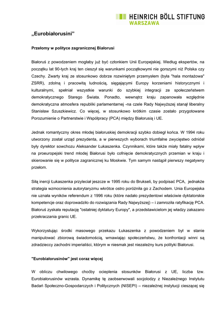 „Eurobiałorusini” Przełomy w polityce zagranicznej Białorusi Białoruś z powodzeniem mogłaby już być członkiem Unii Europejskiej. Według ekspertów, na początku lat 90-tych kraj ten cieszył się warunkami początkowymi nie gorszymi niż Polska czy Czechy. Zwarty kraj ze stosunkowo dobrze rozwiniętym przemysłem (była "hala montażowa" ZSRR), zdolną i pracowitą ludnością, sięgającymi Europy korzeniami historycznymi i kulturalnymi, spełniał demokratycznego wszystkie Starego warunki Świata. do Ponadto, szybkiej wewnątrz integracji kraju ze społeczeństwem zapanowała względnie demokratyczna atmosfera republiki parlamentarnej -na czele Rady Najwyższej stanął liberalny Stanisław Szuszkiewicz. Co więcej, w stosunkowo krótkim czasie zostało przygotowane Porozumienie o Partnerstwie i Współpracy (PCA) między Białorusią i UE. Jednak romantyczny okres młodej białoruskiej demokracji szybko dobiegł końca. W 1994 roku utworzony został urząd prezydenta, a w pierwszych wyborach triumfalne zwycięstwo odniósł były dyrektor sowchozu Aleksander Łukaszenka. Czynnikami, które także miały fatalny wpływ na proeuropejski trend młodej Białorusi było cofnięcie demokratycznych przemian w kraju i skierowanie się w polityce zagranicznej ku Moskwie. Tym samym nastąpił pierwszy negatywny przełom. Siłą inercji Łukaszenka przyleciał jeszcze w 1995 roku do Brukseli, by podpisać PCA, jednakże strategia wzmocnienia autorytaryzmu wkrótce ostro poróżniła go z Zachodem. Unia Europejska nie uznała wyników referendum z 1996 roku (które nadało prezydentowi właściwie dyktatorskie kompetencje oraz doprowadziło do rozwiązania Rady Najwyższej) – i zamroziła ratyfikację PCA. Białoruś zyskała reputację "ostatniej dyktatury Europy", a przedstawicielom jej władzy zakazano przekraczania granic UE. Wykorzystując środki masowego przekazu Łukaszenka z powodzeniem był w stanie manipulować zbiorową świadomością, wmawiając społeczeństwu, że konfrontacji winni są zdradzieccy zachodni imperialiści, którym w niesmak jest niezależny kurs polityki Białorusi. "Eurobiałorusinów" jest coraz więcej W obliczu chwilowego choćby ocieplenia stosunków Białorusi z UE, liczba tzw. Eurobiałorusinów wzrasta. Dynamikę tę zaobserwowali socjolodzy z Niezależnego Instytutu Badań Społeczno-Gospodarczych i Politycznych (NISEPI) – niezależnej instytucji cieszącej się autorytetem, która regularnie przeprowadza narodowe badania opinii publicznej. Jedno z tradycyjnych pytań brzmi następująco: "Jeżeli obecnie na Białorusi odbyłoby się referendum dotyczące wstąpienia do Unii Europejskiej, jaka byłaby Pastwa odpowiedź?”. I tak, we wrześniu 2008 roku za hipotetycznym wstąpieniem do UE opowiedziało się 26,7%, przeciw zaś 51,9%. We wrześniu 2009 roku "Eurobiałorusinów" było już 44,1% (przeciw opowiedziało się 32,8%). Eksperci przestrzegają jednak przed wpadaniem w euforię. "Eurobiałorusin" to termin umowny. Profesor Oleg Manajew, znany profesor socjologii z Mińska, zaznacza, że dla znacznej większości respondentów "zdecydowanie ważniejszy jest dobrobyt panujący w UE, niż demokracja czy wolność przemieszczania się”. Profesor Manajew twierdzi również, iż orientacja proeuropejska nie jest w białoruskiej świadomości zbiorowej nazbyt głęboka czy silna. Obecną tendencję wyjaśnić można odwołując się do radykalnej zmiany retoryki władzy. Jeżeli wcześniej była ona otwarcie antyzachodnia, to teraz dominuje hasło "pragmatycznego dialogu" z Europą. Łukaszenka niejednokrotnie dziękował UE, Międzynarodowemu Funduszowi Walutowemu i USA za wsparcie w sytuacji światowego kryzysu. Białoruscy politolodzy podkreślają jednak, że jeżeli znów dojdzie do pogorszenia stosunków pomiędzy władzą w Mińsku a Unią Europejską, propagandowe „pranie mózgu” może z powrotem ochłodzić wybuch euroentuzjazmu w społeczeństwie. Wystarczy zauważyć, że w grudniu 2002 roku liczba "Eurobiałorusinów" w takim samym badaniu NISEPI wynosiła prawie 61%. Fatalnymi w skutkach okazało się jednak kilka lat „zimnej wojny” Łukaszenki z Europą, która doprowadziła do nałożenia zakazu podróżowania do krajów UE na przedstawicieli władz Białorusi. Wierchuszka reżimu politycznego dysponuje więc wystarczająco silnymi narzędziami manipulowania świadomością Białorusinów. Władza autorytarna, pokorny parlament, podległe aparatowi państwowemu środki masowego przekazu, stagnacja w rozwoju społeczeństwa obywatelskiego – w takich warunkach kwestia opowiedzenia się za proeuropejskim kierunkiem w przeważającej mierze zależy od Aleksandra Łukaszenki i jego otoczenia. Wojna na Kaukazie i obcięcie grantu naftowo-gazowego Co zmusiło autorytarnego przywódcę, który przez długie lata manifestował "braterską integrację" z Rosją, do częściowej weryfikacji swojej orientacji geopolitycznej i rozpoczęcia gry o kierunku europejskim? W ostatnich latach Kreml, rozczarowany pustymi obietnicami ściślejszego zbliżenia, zwiększył naciski na Mińsk. Moskwa zażądała sprzedaży atrakcyjnych aktywów i zaczęła narzucać rubel rosyjski jako wspólną walutę. Łukaszenka poczuł, że jego władza jest zagrożona i zaczął stawiać opór. Odpowiedzią Moskwy były konsekwentne cięcia ulg energetycznych, którymi wcześniej szczodrze obdzielała swojego najbliższego sojusznika. Następnie, działania rosyjskie skierowane przeciwko Gruzji w sierpniu 2008 roku wywarły szczególnie niemiłe wrażenie na białoruskich władzach. Oczywistym stał się fakt, że podnoszące się z gruzów imperium nie zamierza bawić się w dyplomację z krnąbrnymi sąsiadami. Jeżeli wcześniej Mińsk czuł się wygodnie pod parasolem jądrowym Moskwy i z jej dotacjami, to obecnie palącą stała się kwestia poszukiwania wsparcia na Zachodzie, by uniknąć całkowitego uzależnienia od Kremla. Ponadto, wojna