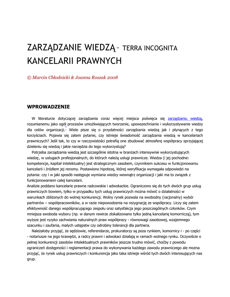 ZARZĄDZANIE WIEDZĄ – TERRA INCOGNITA KANCELARII PRAWNYCH © Marcin Chłodnicki & Joanna Roszak 2008 WPROWADZENIE W literaturze dotyczącej zarządzania coraz więcej miejsca poświęca się zarządzaniu wiedzą, rozumianemu jako ogół procesów umożliwiających tworzenie, upowszechnianie i wykorzystywanie wiedzy 1 dla celów organizacji. Wiele pisze się o przydatności zarządzania wiedzą jak i płynących z tego korzyściach. Pojawia się zatem pytanie, czy istnieje świadomość zarządzania wiedzą w kancelariach prawniczych? Jeśli tak, to czy w rzeczywistości potrafią one zbudować atmosferę współpracy sprzyjającej dzieleniu się wiedzą i jakie narzędzia do tego wykorzystują? Potrzeba zarządzania wiedzą jest szczególnie istotna w branżach intensywnie wykorzystujących i wiedzę , w usługach profesjonalnych, do których należą usługi prawnicze. Wiedza (i jej pochodne: kompetencje, kapitał intelektualny) jest strategicznym zasobem, czynnikiem sukcesu w funkcjonowaniu kancelarii i źródłem jej renomy. Postawiono hipotezę, której weryfikacja wymagała odpowiedzi na pytania: czy i w jaki sposób następuje wymiana wiedzy wewnątrz organizacji i jaki ma to związek z funkcjonowaniem całej kancelarii. Analizie poddano kancelarie prawne radcowskie i adwokackie. Ograniczono się do tych dwóch grup usług prawniczych bowiem, tylko w przypadku tych usług prawniczych można mówić o działalności w warunkach zbliżonych do wolnej konkurencji. Wolny rynek pozwala na swobodny (racjonalny) wybór partnerów – współpracowników, a w razie niepowodzenia na rezygnację ze współpracy. Liczy się zatem efektywność danego współpracującego zespołu oraz satysfakcja jego poszczególnych członków. Czym mniejsza swoboda wyboru (np. w danym rewirze zlokalizowano tylko jedną kancelarię komorniczą), tym wyższe jest ryzyko zachwiania naturalnych praw współpracy - równowagi zasobowej, wzajemnego szacunku i zaufania, małych ustępstw czy odrobiny tolerancji dla partnera. Należałoby przyjąć, że sędziowie, referendarze, prokuratorzy są poza rynkiem, komornicy i - po części - notariusze na jego krawędzi, a radcy prawni i adwokaci działają w ramach wolnego rynku. Oczywiście o pełnej konkurencji zasobów intelektualnych prawników jeszcze trudno mówić, choćby z powodu ograniczeń dostępności i reglamentacji prawa do wykonywania każdego zawodu prawniczego ale można przyjąć, że rynek usług prawniczych i konkurencja jako taka istnieje wśród tych dwóch interesujących nas grup. ZARZĄDZANIE WIEDZĄ JAKO METODA BUDOWANIA PRZEWAGI KONKURENCYJNEJ W ostatnich latach zaobserwować możemy, że zarządzanie wiedzą nabiera większego niż kiedykolwiek przedtem znaczenia i jest siłą napędową rozwoju i zmian, z czego niewielu właścicieli kancelarii zdaje sobie sprawę. Jak wynika z obserwacji wszystkie działania, które stwarzają możliwość rozwoju zdobywania wiedzy, budują opinię o kancelarii jako o dobrym miejscu pracy, a to skutkuje zainteresowaniem i pozyskiwaniem do pracy najzdolniejszych ludzi z branży. Logicznym jest, że wykształcona i doświadczona kadra pracowników przyciąga do kancelarii lepszych klientów. Wraz z nimi, nierzadko przychodzą większe, ciekawsze sprawy, a to daje możliwość dalszego uczenia się, poznawania kolejnych tematów, zbierania nowych doświadczeń i obliguje pracowników do samodoskonalenia. Dbanie o rozwój pracowników i umiejętne zarządzanie wiedzą, daje wymierne efekty w budowaniu wielkość, prestiżu kancelarii a więc w budowaniu przewagi konkurencyjnej. Bardzo obrazowo opisuje powyższą kwestię T. Peters mówiąc o dążeniu do stworzenia „Super Czadowego Miejsca Pracy” chodzi o stworzenia miejsca, gdzie chcą być czadowi ludzie, najlepsi, najlepiej wykształceni, najbardziej kreatywni, największe talenty. A jako jeden z ważnych elementów takiej firmy, będącej jak to On 2 nazywa Magnesem dla Talentu, to miejsce umożliwiające naukę nowych, czadowych rzeczy. DYFUZJA ZARZĄDZANIA WIEDZĄ I ZARZĄDZANIA ZASOBAMI LUDZKIMI Zarządzanie wiedzą jest ściśle powiązane z fluktuacją pracowników i z zarządzaniem zasobami ludzkimi. Zdając sobie sprawę z powyższego łatwiej będzie zatrzymać obecnych pracowników w firmie. Wraz z odejściem pracownika część wiedzy, którą posiadał tylko on, odchodzi z nim. Dla pracodawcy to także poważne koszty związane z procesem rekrutacyjnym, koszty związane z koniecznością nauki nowego pracownika, większe koszty nadzoru, kontroli nowych osób, a także koszty błędów. Nowi pracownicy popełniają więcej błędów, wolniej też wykonują swoją pracę itp. Ponadto, w ostatnich latach obserwujemy na rynku pracy nasilającą się walkę o dobrych pracowników. Coraz trudniej jest pozyskać do pracy wykształconych i utalentowanych ludzi, a tym bardziej prawdziwych profesjonalistów. Na rynku usług prawniczych toczy się nieustanna walka o najlepszych absolwentów, aplikantów, radców prawnych i adwokatów. Mimo, iż wstąpienie do Unii Europejskiej i wyjazdy wykształconych ludzi do pracy za granicę, to bolączki, które nie dotyczą raczej tego sektora, to wieloletnie ograniczanie przez korporacje dostępu do zawodu stanowią poważny zasobowy problem. Problem ten potęguje zauważalne w ostatnich latach, rosnące zapotrzebowanie na usługi prawnicze. Partnerzy kancelarii rzadko zdają sobie sprawę z tego, że ludzie (pracownicy) nie szukają w firmach profesjonalnych pracy, ale kariery. D. Maister już 10 lat temu zwracał uwagę - w książce pt. „Zarządzanie firmą usług profesjonalnych” – że kandydaci, a później "pracownicy oczekują, że będą awansować w strukturach organizacji w tempie, które zostało z góry określone otwarcie, czy to w sposób 3 dorozumiany". Nasza praktyka w procesie rekrutacji młodych prawników do pracy w kancelariach potwierdza, że niemal zawsze, podczas rozmów kwalifika