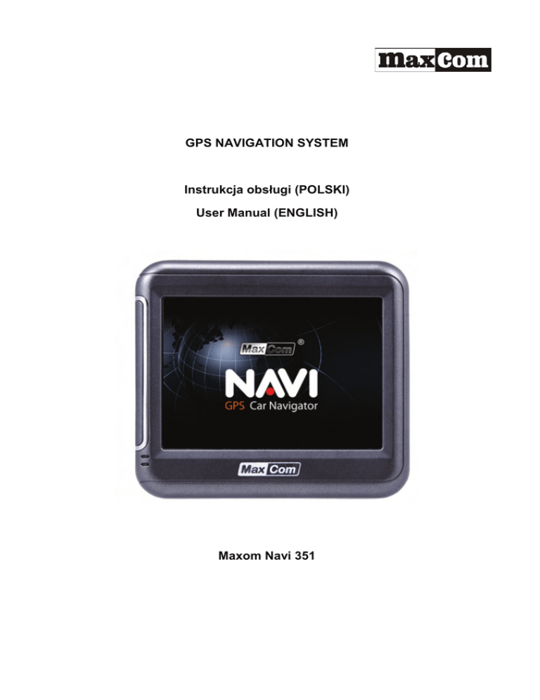 GPS NAVIGATION SYSTEM Instrukcja obsugi (POLSKI) User Manual (ENGLISH) Maxom Navi 351 POLSKI 1 ZAWARTO PUDEKA W pudeku znajduj si: Przenone urzdzenie nawigacyjne (PND) Karta pamici SD (w urzdzeniu)* adowarka sieciowa Uchwyt samochodowy Karta gwarancyjna Kabel komunikacyjny USB Instrukcja uytkownika * akcesoria opcjonalne Zanim zaczniesz korzysta z urzdzenia Navi 351 zapoznaj si z instrukcj obsugi. 2 WANA INFORMACJA! Global Positioning System (GPS) jest to system oparty o satelity nawigacyjne. Dostarcza on informacji o lokalizacji i czasie na caej Ziemi. System GPS jest kontrolowany wycznie przez rzd Stanów Zjednoczonych Ameryki, który równoczenie jest odpowiedzialny za jego dostpno i dokadno. Kada zmiana w systemie GPS dostpnoci i dokadnoci, oraz zmiany atmosferyczne, mog wpywa na funkcjonowanie Twojego urzdzenia. W zwizku z tym Maxcom nie jest odpowiedzialny za dostpno system GPS i nie ponosi w zwizku z tym adnej odpowiedzialnoci. Ostrzeenia i wane wiadomoci Nigdy nie zostawiaj urzdzenia samego w samochodzie. Wystawione na bezporednie dziaanie promieni sonecznych i wysokiej temperatury, moe ulec uszkodzeniu lub zniszczy wntrze samochodu Dla wasnego bezpieczestwa nie obsuguj nawigacji podczas prowadzenia pojazdu Urzdzenie Navi 351 jest przeznaczone do pomocy w nawigacji, nie do dokadnego pomiaru odlegoci, wysokoci, pozycji lub czasu Wyznaczone trasy naley traktowa wycznie jako uatwienie, pierwszestwo zawsze naley si przepisom drogowym Sygna GPS nie moe dziaa w miejscach zakrytych przez róne ciaa stae (oprócz szka). W tunelach lub budynkach sygna GPS jest niedostpny Minimalna liczba satelitów potrzebnych do okrelenia waciwej pozycji wynosi 4. Odbiór sygnau moe by zakócony przez ze warunki atmosferyczne lub wysokie przeszkody (np. drzewa i budynki) Bezprzewodowe urzdzenia mog zakóca odbiór sygnau GPS. W takich wypadkach zaleca si instalacj zewntrznej anteny GPS 3 POLSKI 3 PRZED PIERWSZYM URUCHOMIENIEM 1. Naaduj bateri cakowicie 2. Zainstaluj nawigacje w samochodzie 3. Wcz oprogramowanie nawigacyjne jak opisane w instrukcji 4.Upewnij si, e pojazd nie jest w garau oraz czy nie jest zasonity (przez drzewa, most, itd.) 5. Przy pierwszym uruchomieniu odebranie sygnau GPS trwa nieco duej. Jest to normalne. Czas ten si znaczco skraca przy kadym nastpnym uruchamianiu urzdzenia. Jeeli urzdzenie bez wczania zostanie przeniesione ponad 300km, moe potrzebowa wicej czasu aby zlokalizowa satelity Uwaga: Wybierz odpowiednie miejsce na zamontowanie nawigacji. Nigdy nie montuj jej w miejscach ograniczajcych widoczno kierowcy Zakócenia w odbiorze sygnau GPS mog by spowodowane bliskoci innych urzdze elektronicznych lub rodzajem przedniej szyby (szyba metalizowana lub podgrzewana). Naley wówczas wyposay odbiornik GPS w anten zewntrzn. W celu ochrony urzdzenia przed nagymi skokami napicia, podcz adowark samochodow dopiero po wczeniu silnika samochodu. 4 4.1 ZASADY UYTKOWANIA Zapoznanie z elementami produktu Front urzdzenia Ty urzdzenia Ekran dotykowy Gonik Wska nik adowania Góra urzdzenia Menu 4 Zasilanie ON/OFF POLSKI Lewa strona urzdzenia Slot na karty SD i Multimedia Card MMC zawierajce oprogramowanie oraz mapy niezbdne do funkcjonowania urzdzenia Gniazdo suchawek Port Mini-USB Uywany do transmisji danych z komputerem. Przycisk “Reset” Gdy system nie odpowiada i nie reaguje na przycisk ON/OFF lub ZASILANIE, nacinij ten przycisk za pomoc wska nika. Prawa strona urzdzenia Gniazdo anteny zewntrznej Potencjometr gonoci Wcznik zasilania baterii Gniazdo adowarki Instalacja karty pami ci SD x x x x x x Karta SD zawiera oprogramowanie i mapy niezbdne do funkcjonowania urzdzenia. Karta zazwyczaj znajduje si wewntrz urzdzenia. NIGDY nie wyjmuj karty SD podczas, gdy urzdzenie jest wczone. Jeeli musisz wyj kart SD – wycz najpierw urzdzenie i nastpnie wyjmij kart ze slotu Karta SD moe zosta umieszczona w slocie tylko w jeden sposób, konektorami do przodu i ciciem do dou. Wó kart do slotu i maksymalnie dopchnij, aby poprawnie j osadzi. Karta z mapami nie powinna zawiera plików multimedialnych . Sugerujemy uycie odrbnej karty do przechowywania plików multimedialnych. Dostarczona z urzdzeniem karta jest ustawiona jest zwykle w pozycji LOCK. Przed uyciem ustaw j w pozycj UNLOCK. 4.2 Menu Gówne (Main Menu) Aby wybra dan opcj naley nacisn odpowiedni ikon. Aby powróci do menu naley nacisn klawisz znajdujcy u góry si po prawej stronie ekranu 5 POLSKI Nawigacja (Navigation ) Prosz sprawd instrukcj obsugi oprogramowania nawigacyjnego. Muzyka (Music) Funkcja Music umoliwia odtwarzanie muzyki znajdujcej si na karcie SD. Funkcje: Odtwarzanie plików MP3, WMA oraz WAV Podstawowe funkcje odtwarzacza muzyki takie jak graj, pauza, stop, nastpny i poprzedni, obsuga playlisty Kino ( Movie) Funkcja Movie umoliwia odtwarzanie filmów znajdujcych si na karcie SD 6 POLSKI Wskazówka: podwójne kliknicie na ekran spowoduje wczenie trybu penoekranowego. Gówne funkcje: Odtwarzanie nastpujcych formatów MPEG-1, AVI, WMV, 3GP, Divx Podstawowe funkcje odtwarzacza takie jak graj, pauza, stop,nastpny i poprzedni Przeczaj swobodnie pomidzy standardowym ekranem a trybem penoekranowym Obsuga playlisty EBook Funkcj E-booka jest przegldanie plików tekstowych w formacie TXT Ebook obsuguje nastpujce formaty: ANSI, Unicode, Unicode big endian, UTF-8 Wskazówka: podwójne kliknicie na ekran spowoduje wczenie trybu penoekranowego. Foto (Photo) Funkcja Photo umoliwia odtwarzanie filmów znajdujcych si na karcie SD Urzdzenie obsuguje nastpujce format: JPEG, BMP, PNG Moliwo wczania pokazu slajdów, obracania oraz kasowania przegldanych zdj. Przejcie do nastpnego ekranu GRY(GAME) Urzdzenie posiada dwie wbudowane gry Kalkulator (Calkulator) Urzdzenie posiada wbudowany kalkulator Ustawienia (Settings) Moesz dostosowa urzdzenie Navi 351 po klikniciu w menu Settings. 7 POLSKI Wana informacja. Aby zapamita ustawienia mapy (m.in. ustawienia jzyka) naley powróci do Menu gownego korzystajc z ikony EXIT (Wyjcie) znajdujcej si w menu gównym map