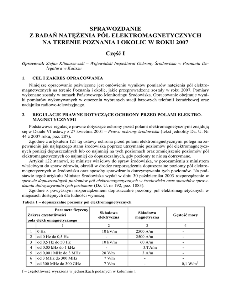 SPRAWOZDANIE Z BADAŃ NATĘŻENIA PÓL ELEKTROMAGNETYCZNYCH NA TERENIE POZNANIA I OKOLIC W ROKU 2007 Część I Opracował: Stefan Klimaszewski – Wojewódzki Inspektorat Ochrony Środowiska w Poznaniu Delegatura w Kaliszu 1. CEL I ZAKRES OPRACOWANIA Niniejsze opracowanie poświęcone jest omówieniu wyników pomiarów natężenia pól elektromagnetycznych na terenie Poznania i okolic, jakie przeprowadzone zostały w roku 2007. Pomiary wykonane zostały w ramach Państwowego Monitoringu Środowiska. Opracowanie obejmuje wyniki pomiarów wykonywanych w otoczeniu wybranych stacji bazowych telefonii komórkowej oraz nadajnika radiowo-telewizyjnego. 2. REGULACJE PRAWNE DOTYCZĄCE OCHRONY PRZED POLAMI ELEKTROMAGNETYCZNYMI Podstawowe regulacje prawne dotyczące ochrony przed polami elektromagnetycznymi znajdują się w Dziale VI ustawy z 27 kwietnia 2001 – Prawo ochrony środowiska (tekst jednolity Dz. U. Nr 44 z 2007 roku, poz. 287). Zgodnie z artykułem 121 tej ustawy ochrona przed polami elektromagnetycznymi polega na zapewnieniu jak najlepszego stanu środowiska poprzez utrzymanie poziomów pól elektromagnetycznych poniżej dopuszczalnych lub co najmniej na tych poziomach oraz zmniejszenie poziomów pól elektromagnetycznych co najmniej do dopuszczalnych, gdy poziomy te nie są dotrzymane. Artykuł 122 stanowi, że minister właściwy do spraw środowiska, w porozumieniu z ministrem właściwym do spraw zdrowia, określi w drodze rozporządzenia dopuszczalne poziomy pól elektromagnetycznych w środowisku oraz sposoby sprawdzania dotrzymywania tych poziomów. Na podstawie tegoż artykułu Minister Środowiska wydał w dniu 30 października 2003 rozporządzenie w sprawie dopuszczalnych poziomów pól elektromagnetycznych w środowisku oraz sposobów sprawdzania dotrzymywania tych poziomów (Dz. U. nr 192, poz. 1883). Zgodnie z powyższym rozporządzeniem dopuszczalne poziomy pól elektromagnetycznych w miejscach dostępnych dla ludności wynoszą: Tabela 1 – dopuszczalne poziomy pól elektromagnetycznych Parametr fizyczny Zakres częstotliwości pola elektromagnetycznego 1 1 0 Hz 2 od 0 Hz do 0,5 Hz 3 od 0,5 Hz do 50 Hz 4 od 0,05 kHz do 1 kHz 5 od 0,001 MHz do 3 MHz 6 od 3 MHz do 300 MHz 7 od 300 MHz do 300 GHz Składowa elektryczna Składowa magnetyczna 2 10 kV/m 10 kV/m 20 V/m 7 V/m 7 V/m 3 2500 A/m 2500 A/m 60 A/m 3/f A/m 3 A/m - f – częstotliwość wyrażona w jednostkach podanych w kolumnie 1 Gęstość mocy 4 0,1 W/m2 2 3. ZAKRES PROWADZONYCH BADAŃ Badane źródła emisji stanowiły instalacje związane z działalnością stacji bazowych telefonii komórkowej oraz nadajnika radiowo-telewizyjnego. Źródła te zlokalizowane są wśród zabudowy mieszkalnej. W otoczeniu każdego źródła pomiary wykonywano w kilku punktach pomiarowych zlokalizowanych w miejscach dostępnych dla ludności. Do pomiarów zastosowano miernik PMM 8053A oraz sondy pomiarowe PMM EP408 oraz PMM EP105. W każdym z punktów mierzono natężenie składowej elektrycznej pola. Parametry sond zestawiono poniżej: Tabela 2. Parametry stosowanych sond pomiarowych Sonda Zakres pomiarowy Zakres mierzonych wartości PMM EP408 1 MHz – 40 GHz 0,8 – 800 V/m PMM EP105 0,1 MHz – 1000 MHz 0,05 – 50 V/m Pomiary wykonano w okresie od lipca do października 2007. 4. WYNIKI BADAŃ Poniżej, w formie tabelarycznej, przedstawiono lokalizację źródeł emisji pól elektromagnetycznych, w otoczeniu których prowadzono badania, lokalizację punktów pomiarowych oraz uzyskane wyniki pomiarów poziomu natężenia składowej elektrycznej pola w pobliżu każdego z obiektów. Tabela 3. Lokalizacja obiektów, w otoczeniu których wykonywano pomiary Nr źródła Lokalizacja źródła 1 Poznań: anteny stacji bazowej telefonii komórkowej na budynku mieszkalnym (blok) – os. Łokietka 9 2 Poznań: anteny stacji bazowej telefonii komórkowej na bunkrze – ul. Czarna Rola 3 4 5 6 Poznań: anteny stacji bazowej telefonii komórkowej na budynku mieszkalnym (blok) – os. Bolesława Śmiałego 16 Poznań: anteny stacji bazowej telefonii komórkowej na budynku (placówka służby zdrowia) – os. Bolesława Chrobrego 118 Poznań: anteny nadajnika radiowo – telewizyjnego oraz stacji bazowych telefonii komórkowej – maszt TP EmiTel Sp. z o.o. Region Zachodni, przy ul. Szymanowskiego 17 Uchorowo (gm. Murowana Goślina): anteny stacji bazowej telefonii komórkowej – działka nr 58/5 Tabela 4. Wyniki pomiarów składowej elektrycznej Nr źródła 1) Nr i lokalizacja punktu pomiarowego (opis i współrzędne punktu) Sonda pomiarowa Wynik pomiaru2) 1 (1) – parking przed blokiem nr 9 na wysokości klatki A: N 52° 26’ 54,1’’ E 16° 56’ 36,6’’ PMM EP408 1,32 V/m PMM EP105 1,52 V/m PMM EP408 1,70 V/m PMM EP105 1,57 V/m (2) – blok os. ul. Łokietka 11 w pobliżu apteki: N 52° 26’ 55,4’’ E 16° 56’ 34,7’’ 3 Nr źródła 1) Nr i lokalizacja punktu pomiarowego (opis i współrzędne punktu) Sonda pomiarowa Wynik pomiaru2) PMM EP408 0,95 V/m PMM EP105 1,12 V/m PMM EP408 < 0,8 V/m 3) PMM EP105 0,46 V/m PMM EP408 < 0,8 V/m 3) PMM EP105 0,53 V/m PMM EP408 < 0,8 V/m 3) PMM EP105 0,56 V/m PMM EP408 < 0,8 V/m 3) PMM EP105 0,47 V/m PMM EP408 1,30 V/m PMM EP105 1,67 V/m PMM EP408 1,32 V/m PMM EP105 1,62 V/m PMM EP408 1,62 V/m PMM EP105 1,73 V/m PMM EP408 0,94 V/m PMM EP105 1,08 V/m PMM EP408 0,89 V/m PMM EP105 0,96 V/m PMM EP408 < 0,8 V/m 3) PMM EP105 0,81 V/m (1) – ul. F. Stróżyńskiego w pobliżu stacji paliw ORLEN: N 52° 27’ 28,3’’ E 16° 54’ 15,2’’ PMM EP408 1,10 V/m PMM EP105 1,25 V/m (2) – ul. F. Stróżyńskiego w pobliżu ronda: N 52° 27’ 34,1’’ E 16° 54’ 13,6’’ PMM EP408 1,15 V/m PMM EP105 1,30 V/m PMM EP408 1,29 V/m PMM EP105 1,50 V/m PMM EP408 1,52 V/m PMM EP105 1,69 V/m PMM EP408 1,62 V/m PMM EP105 1,31 V/m (3) – teren w pobliżu bloku nr 9 na wysokości klatki G: N 52° 26’ 55,7’’ E 16° 56’ 38,3’’ 2 (1) – granica posesji nr 5 przy ul. Czarna Rola (zabudo