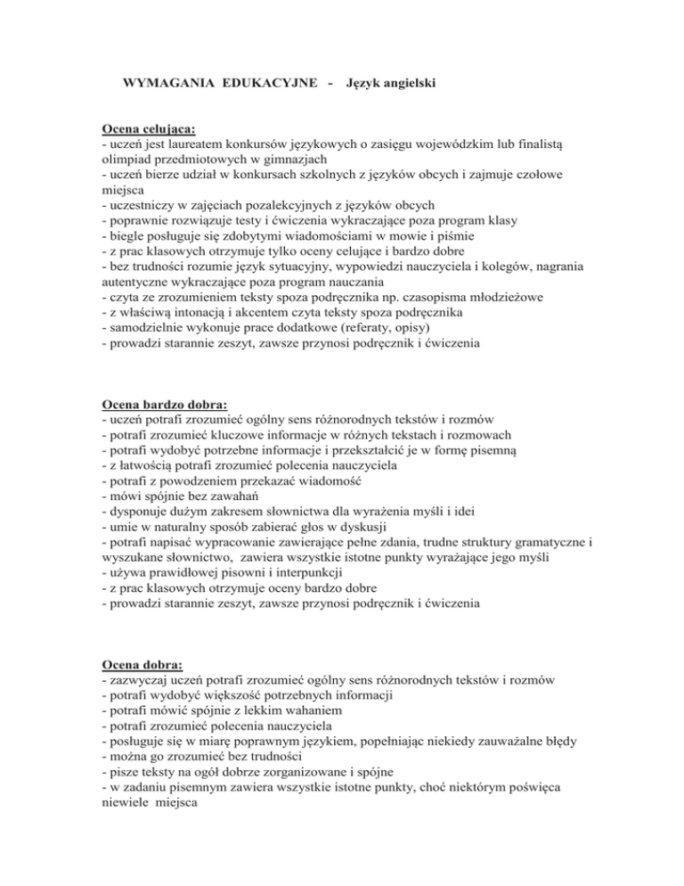 WYMAGANIA EDUKACYJNE - Język angielski Ocena celująca: - uczeń jest laureatem konkursów językowych o zasięgu wojewódzkim lub finalistą olimpiad przedmiotowych w gimnazjach - uczeń bierze udział w konkursach szkolnych z języków obcych i zajmuje czołowe miejsca - uczestniczy w zajęciach pozalekcyjnych z języków obcych - poprawnie rozwiązuje testy i ćwiczenia wykraczające poza program klasy - biegle posługuje się zdobytymi wiadomościami w mowie i piśmie - z prac klasowych otrzymuje tylko oceny celujące i bardzo dobre - bez trudności rozumie język sytuacyjny, wypowiedzi nauczyciela i kolegów, nagrania autentyczne wykraczające poza program nauczania - czyta ze zrozumieniem teksty spoza podręcznika np. czasopisma młodzieżowe - z właściwą intonacją i akcentem czyta teksty spoza podręcznika - samodzielnie wykonuje prace dodatkowe (referaty, opisy) - prowadzi starannie zeszyt, zawsze przynosi podręcznik i ćwiczenia Ocena bardzo dobra: - uczeń potrafi zrozumieć ogólny sens różnorodnych tekstów i rozmów - potrafi zrozumieć kluczowe informacje w różnych tekstach i rozmowach - potrafi wydobyć potrzebne informacje i przekształcić je w formę pisemną - z łatwością potrafi zrozumieć polecenia nauczyciela - potrafi z powodzeniem przekazać wiadomość - mówi spójnie bez zawahań - dysponuje dużym zakresem słownictwa dla wyrażenia myśli i idei - umie w naturalny sposób zabierać głos w dyskusji - potrafi napisać wypracowanie zawierające pełne zdania, trudne struktury gramatyczne i wyszukane słownictwo, zawiera wszystkie istotne punkty wyrażające jego myśli - używa prawidłowej pisowni i interpunkcji - z prac klasowych otrzymuje oceny bardzo dobre - prowadzi starannie zeszyt, zawsze przynosi podręcznik i ćwiczenia Ocena dobra: - zazwyczaj uczeń potrafi zrozumieć ogólny sens różnorodnych tekstów i rozmów - potrafi wydobyć większość potrzebnych informacji - potrafi mówić spójnie z lekkim wahaniem - potrafi zrozumieć polecenia nauczyciela - posługuje się w miarę poprawnym językiem, popełniając niekiedy zauważalne błędy - można go zrozumieć bez trudności - pisze teksty na ogół dobrze zorganizowane i spójne - w zadaniu pisemnym zawiera wszystkie istotne punkty, choć niektórym poświęca niewiele miejsca - używa przeważnie prawidłowej pisowni i interpunkcji - z prac klasowych otrzymuje przeważnie oceny dobre - prowadzi starannie zeszyt, zawsze przynosi podręcznik i ćwiczenia Ocena dostateczna: - potrafi zazwyczaj zrozumieć sens prostych tekstów i rozmów - potrafi zrozumieć część kluczowych informacji w tekstach i rozmowach - zazwyczaj rozumie polecenia nauczyciela - zazwyczaj udaje mu się z powodzeniem przekazać informacje - w mowie popełnia sporo zauważalnych błędów ale można go zrozumieć - operuje prostymi strukturami gramatycznymi - potrafi budować spójne proste zdania - czasami używa nieprawidłowej pisowni i interpunkcji - prowadzi starannie zeszyt, zawsze przynosi podręcznik i ćwiczenia Ocena dopuszczająca: - pracuje na lekcji odtwórczo (przepisuje ćwiczenia z tablicy, wykonuje najprostsze omówione wcześniej ćwiczenia, często przy znacznej pomocy nauczyciela) - zazwyczaj rozumie polecenia nauczyciela ale może potrzebować pomocy lub podpowiedzi - dysponuje bardzo ograniczonym zasobem słownictwa dla wyrażenia myśli - rzadko zabiera głos w dyskusji - można go zrozumieć z pewną trudnością - prace klasowe pisze na oceny dopuszczające, czasami na niedostateczne - prowadzi starannie zeszyt, zawsze przynosi podręcznik i ćwiczenia Ocena niedostateczna: - nie prowadzi starannie i systematycznie zeszytu, nie przynosi podręcznika i ćwiczeń - rzadko odrabia prace domowe - nie udziela wypowiedzi lub jego wypowiedź jest niezrozumiała i nie na temat - popełnia bardzo poważne błędy w mowie i piśmie - nie bierze udziału w lekcji - nie wykazuje zainteresowania przedmiotem i chęci poprawienia oceny - prace klasowe pisze na oceny niedostateczne