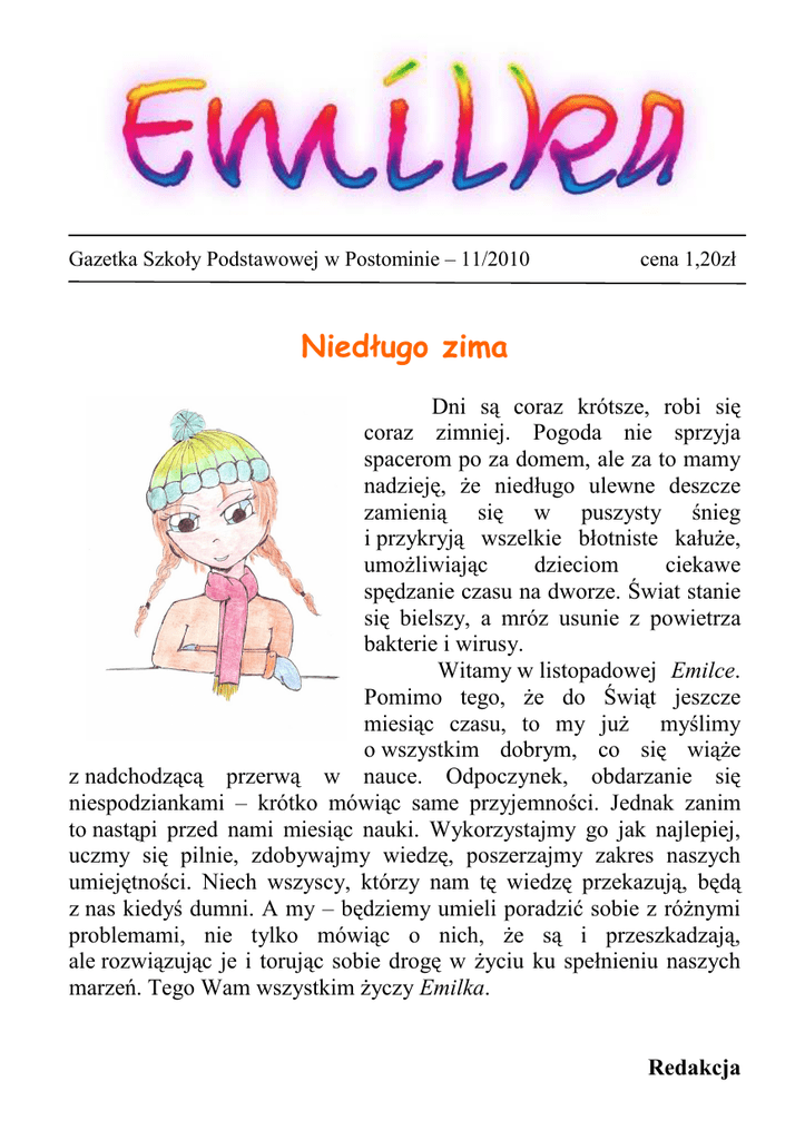 Gazetka Szkoły Podstawowej w Postominie – 11/2010 cena 1,20zł Niedługo zima Dni są coraz krótsze, robi się coraz zimniej. Pogoda nie sprzyja spacerom po za domem, ale za to mamy nadzieję, Ŝe niedługo ulewne deszcze zamienią się w puszysty śnieg i przykryją wszelkie błotniste kałuŜe, umoŜliwiając dzieciom ciekawe spędzanie czasu na dworze. Świat stanie się bielszy, a mróz usunie z powietrza bakterie i wirusy. Witamy w listopadowej Emilce. Pomimo tego, Ŝe do Świąt jeszcze miesiąc czasu, to my juŜ myślimy o wszystkim dobrym, co się wiąŜe z nadchodzącą przerwą w nauce. Odpoczynek, obdarzanie się niespodziankami – krótko mówiąc same przyjemności. Jednak zanim to nastąpi przed nami miesiąc nauki. Wykorzystajmy go jak najlepiej, uczmy się pilnie, zdobywajmy wiedzę, poszerzajmy zakres naszych umiejętności. Niech wszyscy, którzy nam tę wiedzę przekazują, będą z nas kiedyś dumni. A my – będziemy umieli poradzić sobie z róŜnymi problemami, nie tylko mówiąc o nich, Ŝe są i przeszkadzają, ale rozwiązując je i torując sobie drogę w Ŝyciu ku spełnieniu naszych marzeń. Tego Wam wszystkim Ŝyczy Emilka. Redakcja Z śYCIA SZKOŁY Konkurs na jesienny stroik Uczniowie Szkoły Podstawowej bardzo chętnie biorą udział w przeróŜnych konkursach organizowanych na terenie szkoły i poza nią. W tym roku po raz pierwszy wzięli udział w konkursie na jesienny stroik zorganizowanym przez p. Ewelinę Królikowską. Przyniesione przez uczniów stroiki były niezwykle strojne, jesienne i wybór była naprawdę trudny. Komisja w składzie p. Ewelina Królikowska, Zuzanna Dybiecprzewodnicząca Samorządu Uczniowskiego oraz Maja Chocianowska- zastępca przewodniczącej SU zdecydowały, Ŝe: w kategorii klas I- III I miejsce zajęła: Anna Jurewicz II miejsce zajął: Tomasz Brzyszcz III miejsce zajęła: Aleksandra Bosak wyróŜnienia zdobyli: Lena JeŜewska Martyna Kania Mateusz Łągiewczyk w kategorii klas IV- VI: I miejsce zajęła: Dominika Dankowska II miejsce zajął: Miłosz Dankowski III miejsce zajęła: Aleksandra Jasińska Wszystkim serdecznie gratulujemy i zachęcamy do aktywnego uczestnictwa we wszystkich konkursach. Ewelina Królikowska NASZA TWÓRCZOŚĆ Rymowanki Łamie się gałąź, słyszę krach Boję się chyba strach Jestem zuch, Ale mam wielki brzuch. Trzymam w ręce groch, Zaraz go zgniotę, będzie proch. Mój mąŜ ma na imię Lech Chciałam dać synowi tak na imię, co za pech. On miał w ręku super fach Przesypywał ciągle piach. Skąd się wziąłeś, och. Myślałam, Ŝe sprzedajesz groch. Albo przesypujesz piach. PrzecieŜ to był dobry piach. Aleksandra Kania,kl. Vb „Lech na krach” Pływał Lech na krach. Och, to nie mój fach. ja nie jestem wcale zuch i do tego mam mały brzuch. Czuje strach. Zjadłbym groch, a nawet piach. Ale pech, powiedział Lech. „Piach” Lech miał pech. Zawiał mu piach prosto w oczy, aŜ Lech podskoczył. Och, ja wytrzymam, bo jestem zuch. Mam fach i duŜy brzuch. Wiktoria Olszewska, kl. Vb Oliwia Kędzińska, kl. Vb Opowieść o oceanie Pewnego dnia, gdy nie miałam co robić, poszłam do ogrodu i zamyśliłam się. WyobraŜałam sobie, Ŝe jestem w oceanie. Były tam róŜne ryby, rybki i inne stworzenia morskie. Popłynęłam dalej i zobaczyłam konika morskiego, który jakby chciał mnie gdzieś zaprowadzić. Popłynęłam za nim i zobaczyłam perłę. Gdy chciałam ją dotknąć, przypłynął rekin, przestraszyłam się i wypłynęłam. Otworzyłam oczy i zobaczyłam, Ŝe znów jestem w ogrodzie. Lena JeŜewska, kl. IIIa Fantastyczna przygoda Przygotowując rowerek do zwykłej wycieczki rowerowej, nie przypuszczałabym, Ŝe zmieni się ona w podniebną przygodę. Zaczęło się od tego, Ŝe w kole nie było powietrza. W pompowaniu pomagali mi tata, siostra, piesek Reksio i cztery małe kotki. Kiedy wsiadłam na rower, koła zaczęły się powiększać i rower uniósł się jak balon. JuŜ myślałam, Ŝe polecę na księŜyc, gdy mój balonowy rowerek zaczął spadać i wylądowałam w jeziorze. Rowerek pływał jak ponton do chwili, aŜ szczupak olbrzym przegryzł balonowe koło. Wylatujące powietrze, wyrzuciło mnie wysoko w górę i spadłam wprost do mojego łóŜka. Karolina Bury, kl. IIIa Pewnego razu pojechałem do parku jurajskiego. Zobaczyłem Awacerotapsa, który okazał się Ŝywy. Szybko zaprzyjaźnił się ze mną. Zabrał mnie, Ŝeby oprowadzić mnie po parku. Opowiadał mi historię. Dał mi swój pamiętnik. Ale się uśmiałem. Niestety musiałem pojechać do domu. Zapadła noc i poszedłem spać. Nagle usłyszałem, Ŝe ktoś puka w okno. Zobaczyłem tam mojego kolegę, czyli Awacerotapsa. Mateusz Łągiewczyk, kl. IIIa Zaczarowana kraina Pewnego słonecznego dnia bawiłam się w domu. najpierw bawiłam się lalkami, a potem zaczęłam rysować. Następnie miałam iść na lekcje gry na pianinie. Było juŜ tak późno, Ŝe zasnęłam na stojąco. Mama mnie niechcąco popchnęła i poczułam się jakby szafa mnie przyciągnęła do wnętrza. Gdy się obudziłam, byłam jakby w innym świecie. Wszędzie były latające istoty. ZauwaŜyłam drzewa z waty cukrowej, trawa była z lodów, a niebo z gum do Ŝucia. Potem jedna z latających istot podleciała do mnie. Istota ta przedstawiła się pięknie. Powiedziała, Ŝe jest wróŜką, a to są jej siostry. Na imię ma Dzwoneczek. Dowiedziałam się, Ŝe to miejsce nazywa się „Zaczarowana Kraina”. Zaprzyjaźniłam się z wróŜkami i bawiłyśmy się świetnie. Na koniec dały mi magiczny klucz od szafy, Ŝebym mogła je odwiedzić. W domu opowiedziałam mamie, o tym co się wydarzyło, ale mama powiedziała, ze to był tylko sen. Jutro teŜ spotkam się z Dzwoneczkiem i z wróŜkami. Anna Jurewicz, kl. IIIa INFORMACJE Przysłowia na listopad Święta Katarzyna adwent zaczyna. Od świętej Salomei zima jest i nadziei. Kwitną drzewa w listopadzie- zima aŜ do maja będzie. Jaka pogoda listopadowa, taka