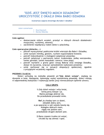 "DZIŚ JEST ŚWIĘTO MOICH DZIADKÓW" UROCZYSTOŚĆ Z OKAZJI DNIA BABCI DZIADKA /scenariusz zajęcia otwartego dla babci i dziadka/ Autor scenariusza: Ewa Kręcioch Dorota Sikorska Cele ogólne: dostarczanie miłych wrażeń, przeżyć w różnych sferach działalności muzycznej, ruchowej, słownej; zaciśnienie współpracy rodzin dzieci z placówką; Cele operacyjne:(dziecko...) potrafi wyrecytować publicznie krótki wierszyk dla Babci i Dziadka; umie wyrazić mimiką, gestem, ruchem wypowiadane kwestie; potrafi indywidualnie i z kolegami zaśpiewać piosenkę; potrafi zatańczyć z partnerem tańce: krakowiaka, polkę warszawska, taniec góralski, taniec kaszubski: szewca i inne pląsy; potrafi wyróżnić z grona gości swoją Babcię oraz swojego Dziadka, złożyć im życzenia, wręczyć samodzielnie wykonane prezenty; umie zachować się w sytuacji ekspozycji społecznej, zgodnie z przyjętymi wcześniej regułami. PRZEBIEG ZAJĘCIA: Dzieci wchodzą na melodię piosenki pt:"Gdy dzień wstaje", siadają na dywanie w kole. Następnie, śpiewając wyżej wymienioną piosenkę, dzieci wstają w odpowiedniej kolejności i wykonują taniec przy równoczesnym śpiewie utworu. CAŁA GRUPA 1.Gdy dzień wstaje i wita świat, ranną porą wstaje i ja. Mama pomaga ubierać się, Do przedszkola prowadzi mnie. Ref.Ja chodzę tam co dzień, obiadek dobry jem, a po spacerze w sali wesoło bawię się. Kolegów dobrych mam, nigdy nie jestem sam, przedszkole drugim domem jest. 2.Rano czasem trudno mi wstać, chciało by się ziewać i spać. Lecz na mnie czeka auto i miś. W co będziemy bawić się dziś? Ref.Ja chodzę tam co dzień... 3.Zamiast mamy panią tu mam, bardzo dużo wierszyków znam. Śpiewam i tańczę, wesoło mi, i tak płyną przedszkolne dni. Ref.Ja chodzę tam co dzień... Po piosence i tańcu dziewczynki witają przybyłych gości wierszem pt:"Witamy Was": MARTA I OLA Witam z całej uprzejmości Wszystkich naszych miłych gości, Że łaskawie tu przybyli By się z nami zabawili. Więc wszystkich witamy serdecznie I kłaniamy się gościom grzecznie. Po powitaniu dzieci śpiewają piosenkę pt:"Moja Babcia": CAŁA GRUPA 1.Moja Babcia ukochana, bardzo pyszne robi dania. Zupkę z miękkim makaronem i racuszki upieczone. Ref:La, la, la, la, la, la, la, la, la. Lody, frytki i pączusie, niech najedzą się wnuczusie. 2.Ja, gdy kiedyś będę babcią, też nauczę się gotować. I co tylko wnuczki zechcą, zawsze będę im szykować. Ref.La, la, la, la, la, la, la, ,la... Po odśpiewaniu piosenki dla Babci, wybrane dzieci recytują wiersz pt:"Babciu i Dziadku": IGOR, OLA, JULIA, WIKTOR Babciu i Dziadku, niosę dla Was życzeń bukiecik. Serduszka gorące, kwiatki pachnące, które wyrosły na miłości łące. MARTA, KACPER, MARCIN Dziś mojej Babci życzenia złożę, w wiązankę kwiatów serduszko włożę. I wiem, że bardzo będzie się cieszyć, kiedy zobaczy, jak do niej spieszę. Po wyrecytowaniu wierszyka, wybrane dzieci tańczą taniec pt: "Tańcowała ryba z rakiem". Pozostałe dzieci śpiewają piosenkę: IGOR, MARTA, KACPER, MARCIN, MARTA Tańcowała ryba z rakiem, raz i dwa i raz i dwa, i przedszkolak z przedszkolakiem Polka warszawska, raz i dwa. Raz podskoczyć, raz zaklaskać Oj, tak, oj, tak, tak, Raz podskoczyć, raz zaklaskać Polka warszawska, raz i dwa. Podaj obie rączki w tańcu, raz i dwa i raz i dwa, Po tańcu, wybrane dzieci mówią wiersz pt:"Najlepsza Babunia na świecie": KAROLINA, MARCIN, KLAUDIA Moja Babunia najlepsza w świecie, wszystkim wam powiem, bo wy nie wiecie. Ja Babcię kocham, ściskam za szyję, niech będzie zdrowa i sto lat żyje. WERONIKA, KAMIL, WIKTOR Moja Babunia ma złote ręce, ja Babcię kocham chyba najwięcej. I mną też Babcia się opiekuje, smaczny deserek mi przygotuje HANIA, MACIEJ, PATRYK, KAJTEK Na drutach zrobi mi rękawiczki, i z włóczki szalik mięciutki, śliczny. I zaprowadzi nas do przedszkola. Po recytacji wiersza, wybrane dzieci śpiewają i tańczą "Krakowiaka": KACPER, OLA, KAROLINA, KRYSTIAN, KLAUDIA, ŁUKASZ Krakowiaczek jeden, miał koników siedem, pojechał na wojnę, został mu się jeden. Siedem lat wojował, szabli nie wyjmował, szabla zardzewiała, wojny nie widziała. Krakowianka jedna, miała chłopca z drewna, a dziewczynkę z wosku, wszystko po krakowsku. Krakowiaczek jeden, miał koników siedem, pojechał na wojnę, został mu się jeden. Siedem lat wojował, szabli nie wyjmował, szabla zardzewiała, wojny nie widziała. Po tańcu, wybrane dzieci mówią wiersz pt:"Dzisiaj mamy święto Dziadka": SANDRA, KUBA, KACPER Dzisiaj mamy święto Dziadka, okazja niezwykle rzadka. Ja Dziadziusia kocham szczerze, Jego słowo zawsze wierzę. Po recytacji wiersza, następuje taniec góralski pt:"Zasiali górale" oraz taniec góralski pt:"Za górami, za lasami": JULIA, MARCIN, WERONIKA, KAMIL, HANIA, MACIEJ Zasiali górale owies, owies. Od końca do końca Tak jest, tak jest. Zasiali górale żyto, żyto Od końca, do końca Wszystko, wszystko Tam na polu góraliczek gromada, gromada. Żadna mu się nie podoba, tylko ta, tylko ta. Tam na polu góraliczek gromada, gromada. Żadna mi się nie podoba, tylko ta, tylko ta. Za górami, za lasami, za dolinami. Pobili się dwaj górale ciupagami. Hej, górale, nie bijta się, ma góralka dwa warkocze, podzieliła się. Po tańcach, dzieci śpiewają piosenkę pt:"Mój Dziadek": CAŁA GRUPA 1.Mój Dziadek dziś w dobrym humorze, Na wnuki spogląda dziś rad, Odświętne ubranko założę, Zaśpiewam Dziadkowi sto lat. Ref: Bo dzisiaj Dzień Dziadka, już śpiewa gromadka. Niech Dziadek nam żyje sto lat. W radości i zdrowiu, z uśmiechem i słońcu, niech wiele będzie tych lat 2.A Dziadek łzy z oczu ociera, z radości, gdy słyszy ten śpiew. Gdy wszyscy śpiewamy dziś teraz, Agatka i Marek i Lech. Ref: Bo dzisiaj Dzień Dziadka... Po zaśpiewaniu piosenki, wybrane dzieci mówią wiersz pt:"Fajny Dziadzio": DOMINIKA, KUBA Mój Dziadek ma swoje zdanie, budzi 
