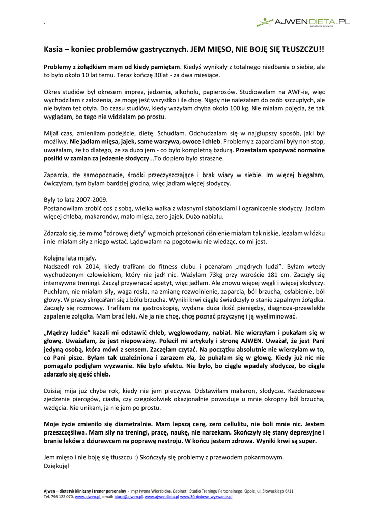 ` Kasia – koniec problemów gastrycznych. JEM MIĘSO, NIE BOJĘ SIĘ TŁUSZCZU!! Problemy z żołądkiem mam od kiedy pamiętam. Kiedyś wynikały z totalnego niedbania o siebie, ale to było około 10 lat temu. Teraz kończę 30lat - za dwa miesiące. Okres studiów był okresem imprez, jedzenia, alkoholu, papierosów. Studiowałam na AWF-ie, więc wychodziłam z założenia, że mogę jeść wszystko i ile chcę. Nigdy nie należałam do osób szczupłych, ale nie byłam też otyła. Do czasu studiów, kiedy ważyłam chyba około 100 kg. Nie miałam pojęcia, że tak wyglądam, bo tego nie widziałam po prostu. Mijał czas, zmieniłam podejście, dietę. Schudłam. Odchudzałam się w najgłupszy sposób, jaki był możliwy. Nie jadłam mięsa, jajek, same warzywa, owoce i chleb. Problemy z zaparciami były non stop, uważałam, że to dlatego, że za dużo jem - co było kompletną bzdurą. Przestałam spożywać normalne posiłki w zamian za jedzenie słodyczy...To dopiero było straszne. Zaparcia, złe samopoczucie, środki przeczyszczające i brak wiary w siebie. Im więcej biegałam, ćwiczyłam, tym byłam bardziej głodna, więc jadłam więcej słodyczy. Były to lata 2007-2009. Postanowiłam zrobić coś z sobą, wielka walka z własnymi słabościami i ograniczenie słodyczy. Jadłam więcej chleba, makaronów, mało mięsa, zero jajek. Dużo nabiału. Zdarzało się, że mimo "zdrowej diety" wg moich przekonań ciśnienie miałam tak niskie, leżałam w łóżku i nie miałam siły z niego wstać. Lądowałam na pogotowiu nie wiedząc, co mi jest. Kolejne lata mijały. Nadszedł rok 2014, kiedy trafiłam do fitness clubu i poznałam „mądrych ludzi”. Byłam wtedy wychudzonym człowiekiem, który nie jadł nic. Ważyłam 73kg przy wzroście 181 cm. Zaczęły się intensywne treningi. Zaczął przywracać apetyt, więc jadłam. Ale znowu więcej węgli i więcej słodyczy. Puchłam, nie miałam siły, waga rosła, na zmianę rozwolnienie, zaparcia, ból brzucha, osłabienie, ból głowy. W pracy skręcałam się z bólu brzucha. Wyniki krwi ciągle świadczyły o stanie zapalnym żołądka. Zaczęły się rozmowy. Trafiłam na gastroskopię, wydana duża ilość pieniędzy, diagnoza-przewlekłe zapalenie żołądka. Mam brać leki. Ale ja nie chcę, chcę poznać przyczynę i ją wyeliminować. „Mądrzy ludzie” kazali mi odstawić chleb, węglowodany, nabiał. Nie wierzyłam i pukałam się w głowę. Uważałam, że jest niepoważny. Polecił mi artykuły i stronę AJWEN. Uważał, że jest Pani jedyną osobą, która mówi z sensem. Zaczęłam czytać. Na początku absolutnie nie wierzyłam w to, co Pani pisze. Byłam tak uzależniona i zarazem zła, że pukałam się w głowę. Kiedy już nic nie pomagało podjęłam wyzwanie. Nie było efektu. Nie było, bo ciągle wpadały słodycze, bo ciągle zdarzało się zjeść chleb. Dzisiaj mija już chyba rok, kiedy nie jem pieczywa. Odstawiłam makaron, słodycze. Każdorazowe zjedzenie pierogów, ciasta, czy czegokolwiek okazjonalnie powoduje u mnie okropny ból brzucha, wzdęcia. Nie unikam, ja nie jem po prostu. Moje życie zmieniło się diametralnie. Mam lepszą cerę, zero cellulitu, nie boli mnie nic. Jestem przeszczęśliwa. Mam siły na treningi, pracę, naukę, nie narzekam. Skończyły się stany depresyjne i branie leków z dziurawcem na poprawę nastroju. W końcu jestem zdrowa. Wyniki krwi są super. Jem mięso i nie boję się tłuszczu :) Skończyły się problemy z przewodem pokarmowym. Dziękuję! Ajwen – dietetyk kliniczny i trener personalny - mgr Iwona Wierzbicka. Gabinet i Studio Treningu Personalnego: Opole, ul. Słowackiego 6/11. Tel. 796 122 070. www.ajwen.pl, email: [email protected]. www.ajwendieta.pl www.30-dniowe-wyzwanie.pl