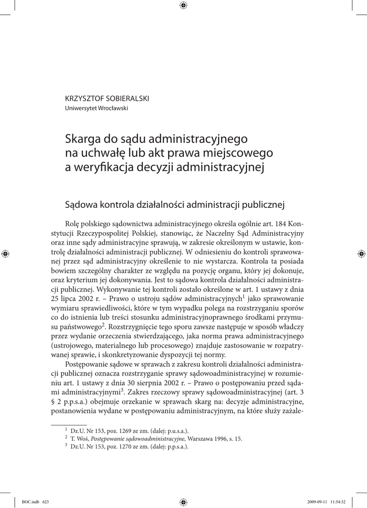 KRZYSZTOF SOBIERALSKI Uniwersytet Wrocławski Skarga do sądu administracyjnego na uchwałę lub akt prawa miejscowego a weryfikacja decyzji administracyjnej Sądowa kontrola działalności administracji publicznej Rolę polskiego sądownictwa administracyjnego określa ogólnie art. 184 Konstytucji Rzeczypospolitej Polskiej, stanowiąc, że Naczelny Sąd Administracyjny oraz inne sądy administracyjne sprawują, w zakresie określonym w ustawie, kontrolę działalności administracji publicznej. W odniesieniu do kontroli sprawowanej przez sąd administracyjny określenie to nie wystarcza. Kontrola ta posiada bowiem szczególny charakter ze względu na pozycję organu, który jej dokonuje, oraz kryterium jej dokonywania. Jest to sądowa kontrola działalności administracji publicznej. Wykonywanie tej kontroli zostało określone w art. 1 ustawy z dnia 25 lipca 2002 r. – Prawo o ustroju sądów administracyjnych1 jako sprawowanie wymiaru sprawiedliwości, które w tym wypadku polega na rozstrzyganiu sporów co do istnienia lub treści stosunku administracyjnoprawnego środkami przymusu państwowego2. Rozstrzygnięcie tego sporu zawsze następuje w sposób władczy przez wydanie orzeczenia stwierdzającego, jaka norma prawa administracyjnego (ustrojowego, materialnego lub procesowego) znajduje zastosowanie w rozpatrywanej sprawie, i skonkretyzowanie dyspozycji tej normy. Postępowanie sądowe w sprawach z zakresu kontroli działalności administracji publicznej oznacza rozstrzyganie sprawy sądowoadministracyjnej w rozumieniu art. 1 ustawy z dnia 30 sierpnia 2002 r. – Prawo o postępowaniu przed sądami administracyjnymi3. Zakres rzeczowy sprawy sądowoadministracyjnej (art. 3 § 2 p.p.s.a.) obejmuje orzekanie w sprawach skarg na: decyzje administracyjne, postanowienia wydane w postępowaniu administracyjnym, na które służy zażale1 2 3 BOC.indb 623 Dz.U. Nr 153, poz. 1269 ze zm. (dalej: p.u.s.a.). T. Woś, Postępowanie sądowoadministracyjne, Warszawa 1996, s. 15. Dz.U. Nr 153, poz. 1270 ze zm. (dalej: p.p.s.a.). 2009-09-11 11:54:32 624 KRZYSZTOF SOBIERALSKI nie albo kończące postępowanie, a także na postanowienia rozstrzygające sprawę co do istoty, postanowienia wydane w postępowaniu egzekucyjnym i zabezpieczającym, na które służy zażalenie, inne niż decyzje i postanowienia akty lub czynności z zakresu administracji publicznej dotyczące uprawnień lub obowiązków wynikających z przepisów prawa, bezczynność w powyższych zakresach, akty prawa miejscowego organów jednostek samorządu terytorialnego i terenowych organów administracji rządowej, inne niż prawo miejscowe akty organów jednostek samorządu terytorialnego i ich związków – podejmowane w sprawach z zakresu administracji publicznej, akty nadzoru nad działalnością organów jednostek samorządu terytorialnego. Natomiast jeśli chodzi o kryterium kontroli działalności administracji publicznej, to, zgodnie z art. 1 § 2 p.p.s.a., sądy administracyjne sprawują w zakresie swej właściwości (art. 3–5 i art. 13–15 p.p.s.a.) kontrolę pod względem zgodności z prawem, jeżeli ustawa nie stanowi inaczej. Przedmiotem kontroli legalności jest przestrzeganie prawa przez organy wykonujące zadania z zakresu administracji publicznej, czyli ochrona prawa przedmiotowego4. Efektem tej kontroli – w przypadku stwierdzenia przez sąd jego naruszenia – jest wydanie orzeczenia kasacyjnego. Sąd administracyjny, co do zasady, nie może zastępować organu administracji publicznej i rozstrzygać sprawy, której przedmiotem jest stosunek administracyjnoprawny. Sprawowanie kontroli z punktu widzenia zgodności z prawem wiąże się z formułowaniem zwrotów stosunkowych5. Zagadnienia związane ze zwrotami stosunkowymi, jako rodzajem wypowiedzi o zgodności z normą prawną pewnych zachowań, można uporządkować, przyjmując modelowe ustalenia poczynione przez J. Wróblewskiego6, akceptowane przez J. Borkowskiego7 i T. Wosia8. Zwrotem stosunkowym jest wypowiedź kwalifikująca jakieś zachowanie jako zgodne (niezgodne) z określoną normą prawną. Jest on formułowany na podstawie normy odniesienia i normy dopełnienia. Norma odniesienia została zawarta w przepisie art. 1 § 2 p.u.s.a., określającym kryterium dokonywanej oceny, oraz w przepisach art. 145–152 p.p.s.a., określających postacie niezgodności z prawem i uzasadniających sformułowanie przez sąd administracyjny zwrotu stosunkowego. Norma odniesienia, wyznaczająca przesłanki i formy oraz charakter sprawowanej przez sąd kontroli, jest niezmienna i stanowi stały punkt odniesienia tej kontroli9. Nie jest jednak wystarczającą podstawą do sformułowania zwrotów stosunkowych. 4 Ibidem, s. 16. J. Borkowski, Kontrola zgodności z prawem decyzji administracyjnych sprawowana przez Naczelny Sąd Administracyjny, NP 1985, z. 9, s. 14 i n. 6 J. Wróblewski, Zwroty stosunkowe wypowiedzi o zgodności z normą, ZN UŁ Nauki Humanistyczno-Społeczne Seria I, Prawo, z. 62, Łódź 1969, s. 3 i n. 7 J. Borkowski, op. cit., s. 14. 8 T. Woś, op. cit., s. 15 i n. 9 J. Borkowski, op. cit., s. 17–18; J. Borkowski [w:] B. Adamiak, J. Borkowski, Polskie postępowanie administracyjne i sądowoadministracyjne, Warszawa 1996, s. 250 i n.; T. Woś, op. cit., s. 187. 5 BOC.indb 624 2009-09-11 11:54:32 Skarga do sądu administracyjnego na uchwałę lub akt prawa miejscowego 625 Niezbędne jest wskazanie normy dopełnienia. Jest ona określona przepisami dotyczącymi treści i trybu podejmowania rozstrzygnięć przez organy administracji publicznej. Jest to zespół przepisów prawa materialnego regulujących właściwość rzeczową organu oraz treść osnowy decyzji administracyjnej, przepisy postępowania administracyjnego normujące tryb postępowania aż do momentu uzyskania przez decyzję przymiotu ostatecznej10. Zespół tych przepisów będzie w każdej sprawie inny, dlatego regulacje prawne stanowiące źródło określenia treści normy dopełni