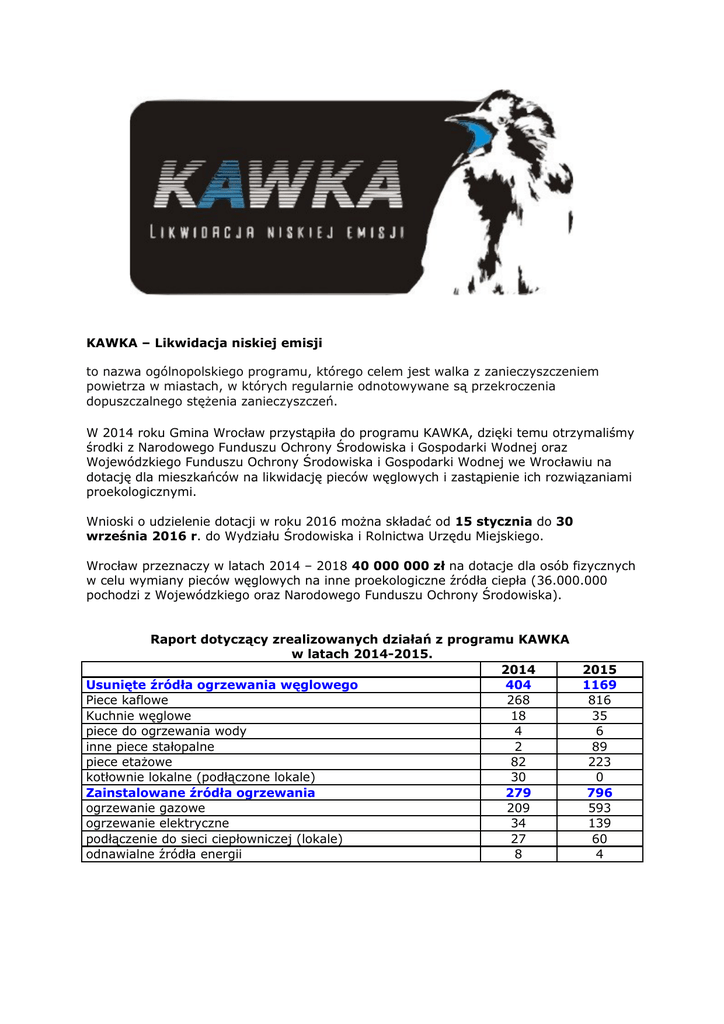 KAWKA – Likwidacja niskiej emisji to nazwa ogólnopolskiego programu, którego celem jest walka z zanieczyszczeniem powietrza w miastach, w których regularnie odnotowywane są przekroczenia dopuszczalnego stężenia zanieczyszczeń. W 2014 roku Gmina Wrocław przystąpiła do programu KAWKA, dzięki temu otrzymaliśmy środki z Narodowego Funduszu Ochrony Środowiska i Gospodarki Wodnej oraz Wojewódzkiego Funduszu Ochrony Środowiska i Gospodarki Wodnej we Wrocławiu na dotację dla mieszkańców na likwidację pieców węglowych i zastąpienie ich rozwiązaniami proekologicznymi. Wnioski o udzielenie dotacji w roku 2016 można składać od 15 stycznia do 30 września 2016 r. do Wydziału Środowiska i Rolnictwa Urzędu Miejskiego. Wrocław przeznaczy w latach 2014 – 2018 40 000 000 zł na dotacje dla osób fizycznych w celu wymiany pieców węglowych na inne proekologiczne źródła ciepła (36.000.000 pochodzi z Wojewódzkiego oraz Narodowego Funduszu Ochrony Środowiska). Raport dotyczący zrealizowanych działań z programu KAWKA w latach 2014-2015. 2014 Usunięte źródła ogrzewania węglowego 404 Piece kaflowe 268 Kuchnie węglowe 18 piece do ogrzewania wody 4 inne piece stałopalne 2 piece etażowe 82 kotłownie lokalne (podłączone lokale) 30 Zainstalowane źródła ogrzewania 279 ogrzewanie gazowe 209 ogrzewanie elektryczne 34 podłączenie do sieci ciepłowniczej (lokale) 27 odnawialne źródła energii 8 2015 1169 816 35 6 89 223 0 796 593 139 60 4 Mapa gęstości przyznanych dotacji programu KAWKA w latach 2014-2015 Raport ZZK + WM Wszelkie informacje dot. programu KAWKA dla mieszkańców zostały umieszczone w prasie ponadto wydrukowano ulotki i plakaty na temat dotacji. Powstała strona informacyjna www.infokawka.pl Na stronie można zapoznać się z obszernym poradnikiem, pobrać wzory dokumentów oraz zobaczyć raporty dotyczące przyznanych dotacji. W 2016 roku w budżecie Miasta Wrocławia na realizację zadań służących ochronie powietrza polegające na trwałej zmianie ogrzewania węglowego na proekologiczne przeznaczono: - 5 570 295 zł w ramach programu likwidacji niskiej emisji na terenie Wrocławia (KAWKA I), - 7 033 902 zł w ramach programu likwidacji niskiej emisji na terenie Wrocławia- część II (KAWKA II). Ostateczne rozliczenie środków przeznaczonych na realizację programu musi nastąpić: - KAWKA I – do dnia 28.10.2016 r., - KAWKA II – do dnia 21.10.2016 r. 1. Rodzaje zadań, na które może być udzielona dotacja celowa Dotacja celowa może być udzielona na realizację zadań inwestycyjnych z zakresu ochrony środowiska obejmujących: 1. trwałą likwidację, w lokalach mieszkalnych oraz pomieszczeniach pomocniczych i przynależnych lub nieruchomościach o charakterze mieszkalnym, systemu ogrzewania opartego na paliwie węglowym i jego zamianę na: a) podłączenie do miejskiej sieci ciepłowniczej, b) ogrzewanie gazowe, c) ogrzewanie elektryczne, e) odnawialne źródło energii, przy czym zastosowane rozwiązanie musi technicznie uniemożliwić spalanie paliw węglowych lub innych nieprzeznaczonych do ogrzewania substancji; 1. podłączenie ciepłej wody użytkowej związane z trwałą likwidacją ogrzewania węglowego, o której mowa w pkt.1; 2. instalację kolektorów słonecznych przeznaczonych do wytwarzania ciepła do podgrzewania ciepłej wody użytkowej, związane z trwałą likwidacją ogrzewania węglowego, o której mowa w pkt.1; 3. termomodernizację w przypadku lokali mieszkalnych oraz pomieszczeń pomocniczych i przynależnych znajdujących się w budynkach wielorodzinnych, zgodnie z zakresem wynikającym z audytu energetycznego, wyłącznie jako element towarzyszący trwałej likwidacji ogrzewania opartego na paliwie węglowym, o której mowa w pkt. 1. 2. Kto może się ubiegać się o dotację Beneficjentami dotacji mogą być osoby fizyczne będące właścicielami lub posiadające inny tytuł prawny do lokali mieszkalnych lub nieruchomości o charakterze mieszkalnym, położonych w granicach administracyjnych Wrocławia. 3. Termin, miejsce i sposób składania wniosków o udzielenie i rozliczenie dotacji. Wzory wniosku o udzielenie dotacji, pełnomocnictw, wniosku o rozliczenie dotacji oraz protokołów realizacji zadania znajdują się na stronie BIP http://bip.um.wroc.pl/artykul/528/20471/kawka-2016 są również dostępne w sekretariacie Wydziału Środowiska i Rolnictwa Urzędu Miejskiego Wrocławia, ul. Wojciecha Bogusławskiego 8,10, Wrocław, pok. 403. Przez datę złożenia wniosku rozumie się datę wpływu kompletnego wniosku do sekretariatu Wydziału Środowiska i Rolnictwa Urzędu Miejskiego Wrocławia. Wnioski można składać w sekretariacie Wydziału Środowiska i Rolnictwa Urzędu Miejskiego Wrocławia, ul. Wojciecha Bogusławskiego 8,10, Wrocław, pok. 403 lub przesłać na adres: Wydział Środowiska i Rolnictwa, Urząd Miejski Wrocławia, ul. Wojciecha Bogusławskiego 8,10; 50-031 Wrocław. Do wniosku o udzielenie dotacji należy dołączyć dokumenty w nim wskazane. Jeżeli jest więcej niż jeden Wnioskodawca należy ustanowić pełnomocnika do reprezentacji Wnioskodawców w postępowaniu o udzielenie i rozliczenie dotacji. (załączniki nr 2 lub 3) Wpływające wnioski realizowane będą w pierwszej kolejności ze środków programu KAWKA II, a po ich wykorzystaniu ze środków programu KAWKA I bez konieczności zmiany wniosków o udzielenie dotacji. Realizacja i rozliczenie zadań objętych umową o udzielenie dotacji powinno nastąpić w terminie 3 miesięcy od daty podpisania umowy dotacyjnej. Przed upływem tego terminu Dotowany obowiązany jest przedłożyć wniosek o rozliczenie dotacji (załącznik nr 4). Do wniosku o rozliczenie dotacji należy dołączyć dokumenty w nim wskazane, w tym protokoły realizacji zadania sporządzone na odpowiednich formularzach stanowiących załączniki nr 5, 6 i 7 oraz zestawienie kosztów sporządzone wg wzoru stanowiącego załącznik nr 8. W szczególn