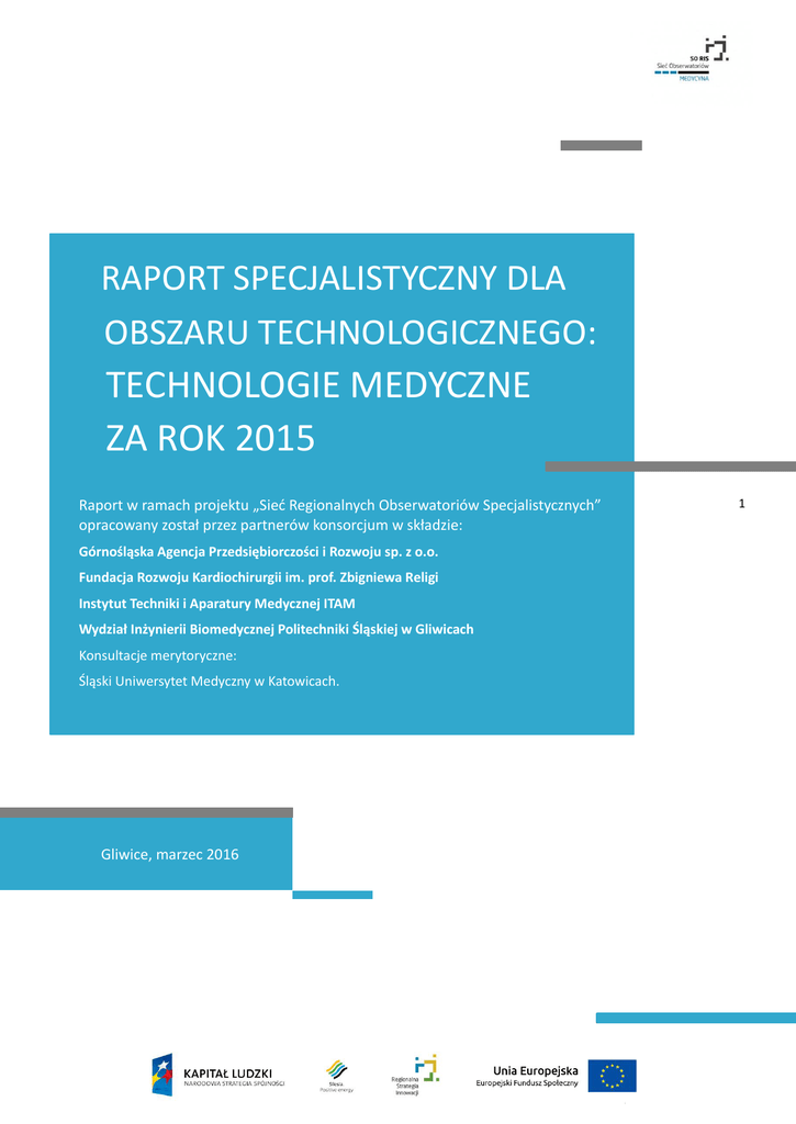 RAPORT SPECJALISTYCZNY DLA OBSZARU TECHNOLOGICZNEGO: TECHNOLOGIE MEDYCZNE ZA ROK 2015 Raport w ramach projektu „Sieć Regionalnych Obserwatoriów Specjalistycznych” opracowany został przez partnerów konsorcjum w składzie: Górnośląska Agencja Przedsiębiorczości i Rozwoju sp. z o.o. Fundacja Rozwoju Kardiochirurgii im. prof. Zbigniewa Religi Instytut Techniki i Aparatury Medycznej ITAM Wydział Inżynierii Biomedycznej Politechniki Śląskiej w Gliwicach Konsultacje merytoryczne: Śląski Uniwersytet Medyczny w Katowicach. Gliwice, marzec 2016 1 Spis tresci 1. Wprowadzenie .............................................................................................................. 4 2. Diagnoza regionalnego medycznego obszaru technologicznego ................................. 6 2.1. Analiza i ocena stanu branży medycznej w regionie ........................................................ 7 2.2. Analiza potencjału rozwojowego branży medycznej w regionie .................................... 22 2.3. Strategia rozwoju regionu .......................................................................................... 34 3. Podsumowanie wyników diagnozy............................................................................. 39 4.1. Projekty inwestycyjne (infrastrukturalne i nie tylko) zrealizowane w województwie śląskim z funduszy unijnych w latach 2007-2015 .................................................................. 44 4.2. Projekty badawcze finansowane przez Narodowe Centrum Nauki ............................... 62 4.3. Projekty naukowe ........................................................................................................... 82 4.4. Projekty realizowane przez partnerów Obserwatorium Medycznego ........................... 89 5. Zasoby ludzkie .......................................................................................................... 109 5.1. Kadra medyczna województwa śląskiego .................................................................... 109 5.2. Zasoby ludzkie w działalności naukowej .................................................................. 118 5.3. Zasoby ludzkie w przedsiębiorstwach ...................................................................... 120 5.4. Środowisko naukowe województwa śląskiego ......................................................... 122 6. Zasoby finansowe ............................................................................................................ 126 6.1. Dochody i wydatki budżetowe ponoszone na ochronę zdrowia .................................. 127 6.2. Pozyskane środki finansowe ..................................................................................... 130 7. Zasoby informacyjne ................................................................................................ 133 8. Trendy regionalne obszaru technologii medycznych ............................................... 138 8.1. Telemedycyna i robotyka medyczna ............................................................................ 140 8.2. Sztuczne narządy .......................................................................................................... 142 8.3. Zaawansowane urządzenia oraz narzędzia diagnostyczne i terapeutyczne................. 144 8.4. Inżynieria materiałowa, molekularna i genetyczna dla medycyny .............................. 147 8.5. Technologie i urządzenia infrastruktury medycznej ..................................................... 148 8.6. Trendy regionalne w zakresie usług medycznych na Śląsku ..................................... 149 9. Rekomendacje dla rozwoju technologii medycznych ............................................... 165 10. Podsumowanie działań w ramach Obserwatorium (raport z pracy) ........................ 171 2 10.1. Jednolite wskaźniki dla obserwatoriów w ramach obszarów technologicznych w ujęciu rocznym..................................................................................................................... 171 10.2. Wskaźniki charakteryzujące potencjał danego obszaru technologicznego w ujęciu rocznym ............................................................................................................................... 175 10.3. Wskaźniki charakteryzujące potencjał danego obszaru technologicznego w ujęciu rocznym – składowe regionalnych wskaźników postępu .................................................... 178 11. Wykaz materiałów źródłowych ..................................................................................... 187 3 1. 1. 4 Wprowadzenie Wprowadzenie Przemysł wyrobów medycznych w globalnej gospodarce światowej należy do najbardziej rentownych i szybko rozwijających się obszarów. Jest to przemysł zaawansowanych technologii, szczególnie intensywnie rozwijający się w krajach wysoko uprzemysłowionych o innowacyjnych gospodarkach i wysokim dochodzie narodowym na głowę mieszkańca. Województwo śląskie dysponuje dużymi zasobami intelektualnymi i gospodarczymi w obszarze medycyny i powiązanych z nią zaawansowanych technologii, co było podstawą wyboru tego obszaru w ramach Regionalnej Strategii Innowacji jako jednej z trzech inteligentnych specjalizacji regionu. Regionalne Obserwatorium Medyczne (www.obserwatorium-medyczne.pl) działa w ramach Sieci Regionalnych Obserwatoriów Specjalistycznych powołanej 13 marca 2013 r. jako jeden z rezultatów projektu systemowego: „Zarządzanie, wdrażanie i monitorowanie Regionalnej Strategii Innowacji Województwa Śląskiego". Gromadzi ono wiedzę z szeroko rozumianej branży medycznej, dostęp do danych jest otwarty i bezpłatny, a wiedza dostępna dla wszystkich. Obserwatorium jest miejscem, w którym regionalni przedsiębiorcy mogą się wymieniać informacjami, pozyskiwać sprawdzoną i aktualną wiedzę, szukać eksperta, partnera biznesowego czy naukowego. Niniejszy raport Obserwatorium zawiera pr