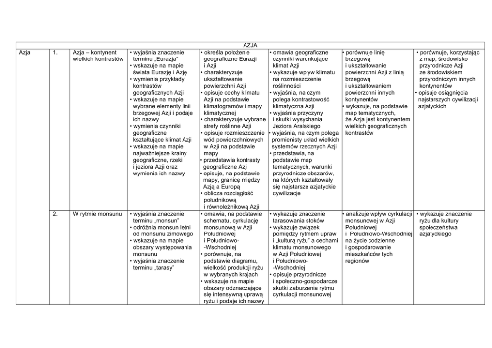 Azja 1. Azja – kontynent wielkich kontrastów • wyjaśnia znaczenie terminu „Eurazja” • wskazuje na mapie świata Eurazję i Azję • wymienia przykłady kontrastów geograficznych Azji • wskazuje na mapie wybrane elementy linii brzegowej Azji i podaje ich nazwy • wymienia czynniki geograficzne kształtujące klimat Azji • wskazuje na mapie najważniejsze krainy geograficzne, rzeki i jeziora Azji oraz wymienia ich nazwy 2. W rytmie monsunu • wyjaśnia znaczenie terminu „monsun” • odróżnia monsun letni od monsunu zimowego • wskazuje na mapie obszary występowania monsunu • wyjaśnia znaczenie terminu „tarasy” AZJA • określa położenie geograficzne Eurazji i Azji • charakteryzuje ukształtowanie powierzchni Azji • opisuje cechy klimatu Azji na podstawie klimatogramów i mapy klimatycznej • charakteryzuje wybrane strefy roślinne Azji • opisuje rozmieszczenie wód powierzchniowych w Azji na podstawie mapy • przedstawia kontrasty geograficzne Azji • opisuje, na podstawie mapy, granicę między Azją a Europą • oblicza rozciągłość południkową i równoleżnikową Azji • omawia, na podstawie schematu, cyrkulację monsunową w Azji Południowej i Południowo-Wschodniej • porównuje, na podstawie diagramu, wielkość produkcji ryżu w wybranych krajach • wskazuje na mapie obszary odznaczające się intensywną uprawą ryżu i podaje ich nazwy • omawia geograficzne • porównuje linię • porównuje, korzystając czynniki warunkujące brzegową z map, środowisko klimat Azji i ukształtowanie przyrodnicze Azji • wykazuje wpływ klimatu powierzchni Azji z linią ze środowiskiem na rozmieszczenie brzegową przyrodniczym innych roślinności i ukształtowaniem kontynentów • wyjaśnia, na czym powierzchni innych • opisuje osiągnięcia polega kontrastowość kontynentów najstarszych cywilizacji klimatyczna Azji • wykazuje, na podstawie azjatyckich • wyjaśnia przyczyny map tematycznych, i skutki wysychania że Azja jest kontynentem Jeziora Aralskiego wielkich geograficznych • wyjaśnia, na czym polega kontrastów promienisty układ wielkich systemów rzecznych Azji • przedstawia, na podstawie map tematycznych, warunki przyrodnicze obszarów, na których kształtowały się najstarsze azjatyckie cywilizacje • wykazuje znaczenie • analizuje wpływ cyrkulacji • wykazuje znaczenie tarasowania stoków monsunowej w Azji ryżu dla kultury • wykazuje związek Południowej społeczeństwa pomiędzy rytmem upraw i Południowo-Wschodniej azjatyckiego i „kulturą ryżu” a cechami na życie codzienne klimatu monsunowego i gospodarowanie w Azji Południowej mieszkańców tych i Południoworegionów -Wschodniej • opisuje przyrodnicze i społeczno-gospodarcze skutki zaburzenia rytmu cyrkulacji monsunowej 3. Chiny – najludniejszy kraj świata 4. Japonia – kraj kwitnącej gospodarki • opisuje wymagania klimatyczno-glebowe ryżu • wskazuje na mapie • określa położenie Chiny, podaje nazwę ich geograficzne oraz stolicy oraz nazwy cechy środowiska państw sąsiadujących przyrodniczego Chin • wskazuje na mapie • wyjaśnia zjawisko krainy geograficzne zachwiania równowagi oraz najważniejsze rzeki płci w Chinach oraz • opisuje uwarunkowania wymienia ich nazwy rozwoju rolnictwa • podaje liczbę ludności w Chinach Chin • wyjaśnia zależność • opisuje bariery osadnicze między warunkami w Chinach Zachodnich przyrodniczymi • wymienia nazwy a rozmieszczeniem bogactw mineralnych ludności Chin Chin • opisuje uwarunkowania • wskazuje rozwoju gospodarczego najdynamiczniej Chin rozwijające się działy • określa miejsce Chin gospodarki w Chinach w światowej wymianie • wymienia nazwy towarowej głównych roślin • wskazuje na mapie uprawnych oraz nazywa obszary • wymienia najważniejsze o dużej koncentracji cechy gospodarki Chin przemysłu w Chinach • wskazuje na mapie • opisuje położenie świata Japonię i podaje geograficzne Japonii na nazwę jej stolicy podstawie mapy • wymienia najważniejsze ogólnogeograficznej cechy środowiska •omawia cechy przyrodniczego Japonii środowiska • opisuje skutki trzęsień przyrodniczego Japonii ziemi, tajfunów i • charakteryzuje klimat tsunami Japonii • wymienia działania • wyjaśnia przyczyny umożliwiające życie i dynamicznego rozwoju • analizuje wykresy i dane • wykazuje zależności dotyczące liczby ludności między warunkami i współczynnika przyrostu przyrodniczymi naturalnego w Chinach a rozwojem • wyjaśnia, na czym gospodarczym Chin polega chiński program • analizuje przyczyny kontroli urodzeń szybkiego rozwoju gospodarczego Chin • określa cele i skutki w ostatnich latach programu kontroli urodzeń • porównuje wartość PKB Chin z wartością PKB innych krajów • wyjaśnia kierunki rozwoju gospodarczego Chin • wskazuje zmiany znaczenia Chin w gospodarce światowej • wykazuje przyczyny migracji ludności Chin ze wsi do miast • omawia kontrasty przyrodnicze Chin • wykazuje wpływ Chin na światową gospodarkę • charakteryzuje • opisuje skutki położenia geograficzne czynniki Japonii w strefie kształtujące klimat aktywności wulkanicznej Japonii i sejsmicznej • wyjaśnia wpływ cyrkulacji • wykazuje przyczyny i monsunowej na klimat znaczenie działań Japonii umożliwiających życie w • wykazuje znaczenie trudnych warunkach czynników społecznoprzyrodniczych -kulturowych dla tworzenia • wykazuje, że Japonia nowoczesnej gospodarki jest potęgą gospodarczą • wykazuje przyczyny i skutki spowolnienia gospodarczego Japonii 5. Indie – państwo bogaczy i nędzarzy gospodarowanie w trudnych warunkach przyrodniczych • wymienia japońskie produkty znane na całym świecie • wymienia nazwy głównych roślin uprawnych • przedstawia znaczenie rybołówstwa dla gospodarki Japonii • podaje liczbę mieszkańców Japonii • wskazuje na mapie wielkie miasta Japonii i wymien