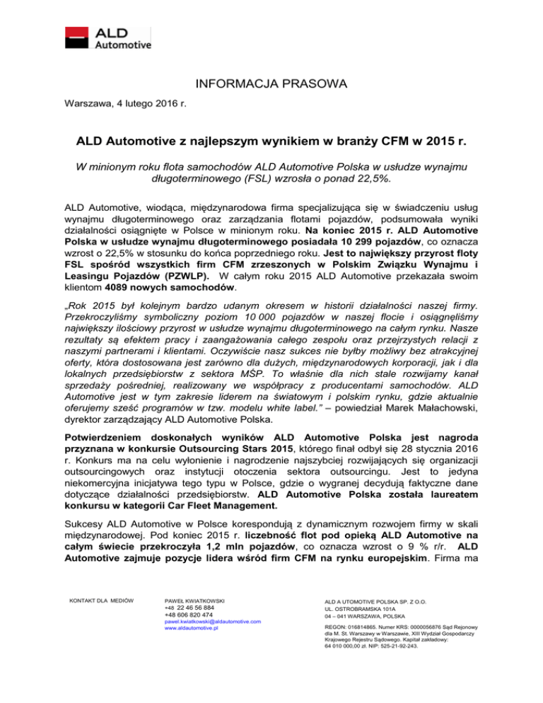 INFORMACJA PRASOWA Warszawa, 4 lutego 2016 r. ALD Automotive z najlepszym wynikiem w branży CFM w 2015 r. W minionym roku flota samochodów ALD Automotive Polska w usłudze wynajmu długoterminowego (FSL) wzrosła o ponad 22,5%. ALD Automotive, wiodąca, międzynarodowa firma specjalizująca się w świadczeniu usług wynajmu długoterminowego oraz zarządzania flotami pojazdów, podsumowała wyniki działalności osiągnięte w Polsce w minionym roku. Na koniec 2015 r. ALD Automotive Polska w usłudze wynajmu długoterminowego posiadała 10 299 pojazdów, co oznacza wzrost o 22,5% w stosunku do końca poprzedniego roku. Jest to największy przyrost floty FSL spośród wszystkich firm CFM zrzeszonych w Polskim Związku Wynajmu i Leasingu Pojazdów (PZWLP). W całym roku 2015 ALD Automotive przekazała swoim klientom 4089 nowych samochodów. „Rok 2015 był kolejnym bardzo udanym okresem w historii działalności naszej firmy. Przekroczyliśmy symboliczny poziom 10 000 pojazdów w naszej flocie i osiągnęliśmy największy ilościowy przyrost w usłudze wynajmu długoterminowego na całym rynku. Nasze rezultaty są efektem pracy i zaangażowania całego zespołu oraz przejrzystych relacji z naszymi partnerami i klientami. Oczywiście nasz sukces nie byłby możliwy bez atrakcyjnej oferty, która dostosowana jest zarówno dla dużych, międzynarodowych korporacji, jak i dla lokalnych przedsiębiorstw z sektora MŚP. To właśnie dla nich stale rozwijamy kanał sprzedaży pośredniej, realizowany we współpracy z producentami samochodów. ALD Automotive jest w tym zakresie liderem na światowym i polskim rynku, gdzie aktualnie oferujemy sześć programów w tzw. modelu white label.” – powiedział Marek Małachowski, dyrektor zarządzający ALD Automotive Polska. Potwierdzeniem doskonałych wyników ALD Automotive Polska jest nagroda przyznana w konkursie Outsourcing Stars 2015, którego finał odbył się 28 stycznia 2016 r. Konkurs ma na celu wyłonienie i nagrodzenie najszybciej rozwijających się organizacji outsourcingowych oraz instytucji otoczenia sektora outsourcingu. Jest to jedyna niekomercyjna inicjatywa tego typu w Polsce, gdzie o wygranej decydują faktyczne dane dotyczące działalności przedsiębiorstw. ALD Automotive Polska została laureatem konkursu w kategorii Car Fleet Management. Sukcesy ALD Automotive w Polsce korespondują z dynamicznym rozwojem firmy w skali międzynarodowej. Pod koniec 2015 r. liczebność flot pod opieką ALD Automotive na całym świecie przekroczyła 1,2 mln pojazdów, co oznacza wzrost o 9 % r/r. ALD Automotive zajmuje pozycje lidera wśród firm CFM na rynku europejskim. Firma ma KONTAKT DLA MEDIÓW PAWEŁ KWIATKOWSKI +48 22 46 56 884 +48 606 820 474 [email protected] www.aldautomotive.pl ALD A UTOMOTIVE POLSKA SP. Z O.O. UL. OSTROBRAMSKA 101A 04 – 041 WARSZAWA, POLSKA REGON: 016814865. Numer KRS: 0000056876 Sąd Rejonowy dla M. St. Warszawy w Warszawie, XIII Wydział Gospodarczy Krajowego Rejestru Sądowego. Kapitał zakładowy: 64 010 000,00 zł. NIP: 525-21-92-243. również najlepiej rozwiniętą sieć międzynarodowych oddziałów ze wszystkich firm branży CFM, operując bezpośrednio w 40 krajach, a w 7 kolejnych poprzez firmy partnerskie. „W 2016 roku będziemy w dalszym ciągu podnosić poziom naszych usług, wprowadzając nowe funkcjonalności z wykorzystaniem aplikacji elektronicznych. Będąc częścią jednej z największych firm z branży CFM mamy dostęp do najnowocześniejszych rozwiązań w tym zakresie i zamierzamy to w pełni wykorzystać. Dzięki temu nasza oferta będzie jeszcze lepiej dostosowana do oczekiwań naszych obecnych i przyszłych klientów” – dodał Marek Małachowski. ### ALD Automotive ALD Automotive należy do grupy Société Générale i jest międzynarodowym liderem w świadczeniu usług wynajmu długoterminowego, finansowania oraz zarządzania flotami pojazdów. Firma zarządza parkiem ponad 1 200 000 samochodów w 40 krajach. W Polsce ALD Automotive zarządza flotą ponad 10 300 pojazdów. Firma jest członkiem Polskiego Związku Wynajmu i Leasingu Pojazdów. www.aldautomotive.pl KONTAKT DLA MEDIÓW PAWEŁ KWIATKOWSKI +48 22 46 56 884 +48 606 820 474 [email protected] www.aldautomotive.pl ALD A UTOMOTIVE POLSKA SP. Z O.O. UL. OSTROBRAMSKA 101A 04 – 041 WARSZAWA, POLSKA REGON: 016814865. Numer KRS: 0000056876 Sąd Rejonowy dla M. St. Warszawy w Warszawie, XIII Wydział Gospodarczy Krajowego Rejestru Sądowego. Kapitał zakładowy: 64 010 000,00 zł. NIP: 525-21-92-243.