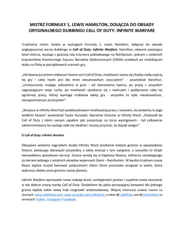 MISTRZ FORMUŁY 1, LEWIS HAMILTON, DOŁĄCZA DO OBSADY ORYGINALNEGO DUBBINGU CALL OF DUTY: INFINITE WARFARE Trzykrotny mistrz świata w wyścigach Formuły 1, Lewis Hamilton, dołączył do obsady anglojęzycznej wersji dubbingu w Call of Duty: Infinite Warfare. Hamilton, obecnie piastujący tytuł mistrza, wystąpi z gościną rolą inżyniera pokładowego na Retribution, jednym z ostatnich krążowników Kosmicznego Sojuszu Narodów Zjednoczonych (UNSA) ocalałych po miażdżącym ataku na flotę w początkowych scenach gry. „Od dawna już jestem oddanym fanem serii Call of Duty, możliwość stania się choćby małą częścią tej gry i całej marki jest dla mnie niesamowitym zaszczytem" - powiedział Hamilton. „Umieszczanie mojego sobowtóra w grze - od skanowania twarzy, po pracę z zespołem nagrywającym moje ruchy, po możliwość spotkania się z twórcami i podejrzenia całej tej ogromnej pracy, której wymaga zrobienie takiej gry - wszystko to było niesamowitym, niezapomnianym przeżyciem". „Wszyscy w Infinity Ward byli podekscytowani możliwością pracy z Lewisem, bo jesteśmy tu jego wielkimi fanami" powiedział Taylor Kurosaki, Narrative Director w Infinity Ward. „Podszedł do Call of Duty z takim samym zapałem jaki prezentuje na torze wyścigowym - był całkowicie zdeterminowany by występ udał się idealnie i muszę przyznać, że dopiął swego!” O Call of Duty: Infinite Warfare Obsypane wieloma nagrodami studio Infinity Ward przełamie kolejne granice w opowiadaniu historii, pokazując obowiązki przywódcy a także emocje z tym związane, a wszystko to dzięki niezwykłemu sposobowi narracji. Gracze wcielą się w Kapitana Reyesa, żołnierza zasiadającego za sterami jednego z ostatnich okrętów wojennych Ziemi – Retribution. W bardzo trudnym czasie Reyes będzie musiał kierować połączonymi siłami Ziemi przeciwko wrogowi w walce, która wykroczy daleko poza granice naszej planety. Infinite Warfare wprowadzi nowe rodzaje broni, umiejętności postaci i zupełnie nowe otoczenie w tak dobrze znaną markę Call of Duty. Dodatkiem do jakże porywającej kampanii dla jednego gracza będzie także nowy tryb rozgrywki wieloosobowej. Więcej informacji znaleźć można na stronach: www.callofduty.com, www.youtube.com/callofduty, a także @CallofDuty and @InfinityWard w serwisach Twitter, Instagram i Facebook. Activision Publishing, Inc. Posiadająca swoją siedzibę główną w Santa Monica w Kalifornii, firma Activision Publishing, Inc. znajduje się w czołówce światowych producentów oraz wydawców w branży rozrywki elektronicznej, z tego względu działa w wielu regionach świata. Aby znaleźć więcej informacji o Activision oraz jej produktach można znaleźć na stronie firmy, www.activision.com, a także śledząc oficjalne konto na Twitterze @Activision. ### Kontakt prasowy w Polsce: Kool Things Andrzej Mazuruk | [email protected]