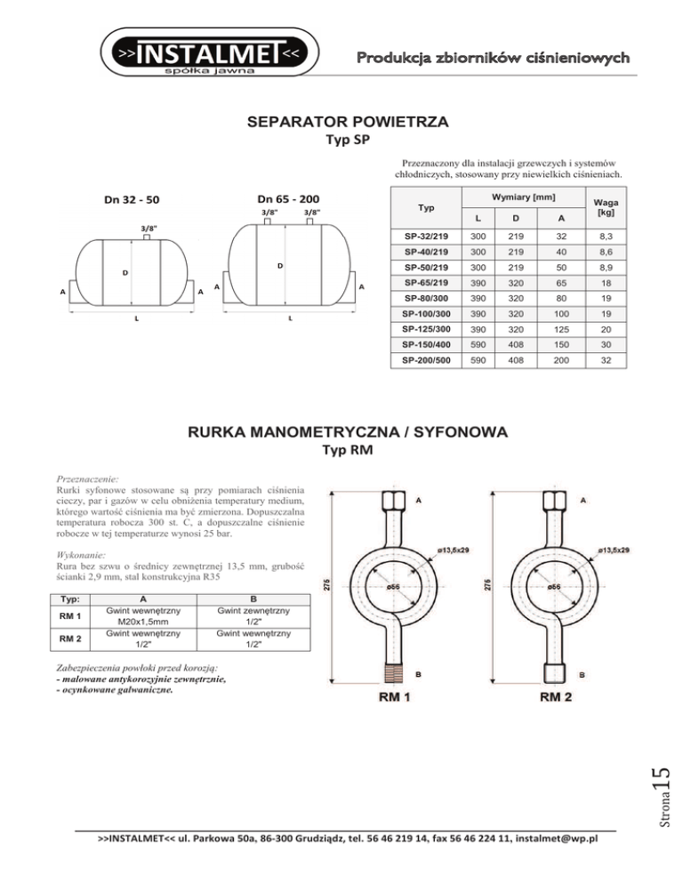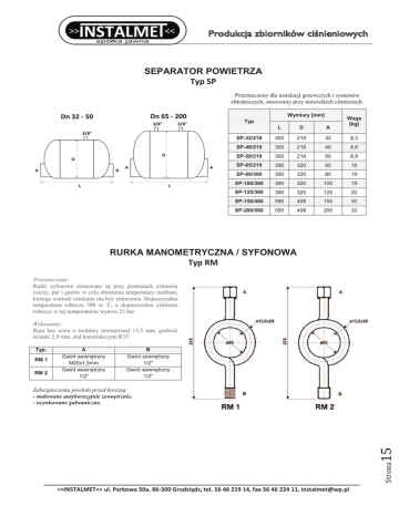 SEPARATOR POWIETRZA 05 Przeznaczony dla instalacji grzewczych i systemów chłodniczych, stosowany przy niewielkich ci nieniach. Wymiary [mm] Typ D A SP-32/219 300 219 32 8,3 SP-40/219 300 219 40 8,6 SP-50/219 300 219 50 8,9 SP-65/219 390 320 65 18 SP-80/300 390 320 80 19 SP-100/300 390 320 100 19 SP-125/300 390 320 125 20 SP-150/400 590 408 150 30 SP-200/500 590 408 200 32 RURKA MANOMETRYCZNA / SYFONOWA Przeznaczenie: Rurki syfonowe stosowane s przy pomiarach ci nienia cieczy, par i gazów w celu obni enia temperatury medium, którego warto ci nienia ma by zmierzona. Dopuszczalna temperatura robocza 300 st. C, a dopuszczalne ci nienie robocze w tej temperaturze wynosi 25 bar. Wykonanie: Rura bez szwu o rednicy zewn trznej 13,5 mm, grubo cianki 2,9 mm, stal konstrukcyjna R35 Typ: RM 1 RM 2 A Gwint wewn trzny M20x1,5mm Gwint wewn trzny 1/2" B Gwint zewn trzny 1/2" Gwint wewn trzny 1/2" Zabezpieczenia powłoki przed korozj : - malowane antykorozyjnie zewn trznie, - ocynkowane galwaniczne. >>-?0 @ AA 5 & 3; , 94)*;; $ B $C # 34 /4 Waga [kg] L : /, ( D 34 /4 / , # E&