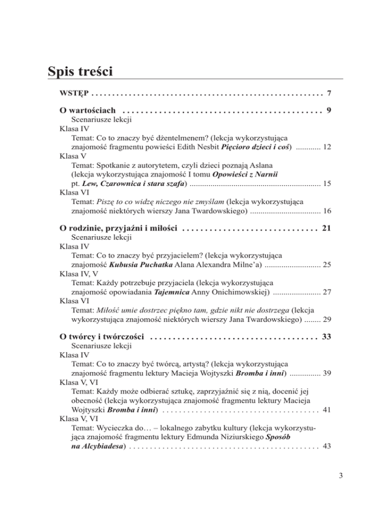 Spis treści WSTĘP . . . . . . . . . . . . . . . . . . . . . . . . . . . . . . . . . . . . . . . . . . . . . . . . . . . . . . . . 7 O wartościach . . . . . . . . . . . . . . . . . . . . . . . . . . . . . . . . . . . . . . . . . . . . 9 Scenariusze lekcji Klasa IV Temat: Co to znaczy być dżentelmenem? (lekcja wykorzystująca znajomość fragmentu powieści Edith Nesbit Pięcioro dzieci i coś) ............ 12 Klasa V Temat: Spotkanie z autorytetem, czyli dzieci poznają Aslana (lekcja wykorzystująca znajomość I tomu Opowieści z Narnii pt. Lew, Czarownica i stara szafa) ............................................................... 15 Klasa VI Temat: Piszę to co widzę niczego nie zmyślam (lekcja wykorzystująca znajomość niektórych wierszy Jana Twardowskiego) .................................. 16 O rodzinie, przyjaźni i miłości . . . . . . . . . . . . . . . . . . . . . . . . . . . . . . 21 Scenariusze lekcji Klasa IV Temat: Co to znaczy być przyjacielem? (lekcja wykorzystująca znajomość Kubusia Puchatka Alana Alexandra Milne’a) ........................... 25 Klasa IV, V Temat: Każdy potrzebuje przyjaciela (lekcja wykorzystująca znajomość opowiadania Tajemnica Anny Onichimowskiej) ....................... 27 Klasa VI Temat: Miłość umie dostrzec piękno tam, gdzie nikt nie dostrzega (lekcja wykorzystująca znajomość niektórych wierszy Jana Twardowskiego) ........ 29 O twórcy i twórczości . . . . . . . . . . . . . . . . . . . . . . . . . . . . . . . . . . . . . 33 Scenariusze lekcji Klasa IV Temat: Co to znaczy być twórcą, artystą? (lekcja wykorzystująca znajomość fragmentu lektury Macieja Wojtyszki Bromba i inni) ............... 39 Klasa V, VI Temat: Każdy może odbierać sztukę, zaprzyjaźnić się z nią, docenić jej obecność (lekcja wykorzystująca znajomość fragmentu lektury Macieja Wojtyszki Bromba i inni) . . . . . . . . . . . . . . . . . . . . . . . . . . . . . . . . . . . . . . 41 Klasa V, VI Temat: Wycieczka do… – lokalnego zabytku kultury (lekcja wykorzystująca znajomość fragmentu lektury Edmunda Niziurskiego Sposób na Alcybiadesa) . . . . . . . . . . . . . . . . . . . . . . . . . . . . . . . . . . . . . . . . . . . . . . 43 3 O patriotyzmie . . . . . . . . . . . . . . . . . . . . . . . . . . . . . . . . . . . . . . . . . . . 45 Scenariusze lekcji Klasa IV, V Temat: Poczucie przynależności jest potrzebne każdemu człowiekowi (lekcja wykorzystująca znajomość fragmentu opowiadania Marii Dąbrowskiej Marcin Kozera) ....................................................................... 50 Klasa V Temat: Ja również odczuwam tęsknotę za… (lekcja wykorzystująca znajomość fragmentu powieści Alfreda Szklarskiego Tomek w krainie kangurów) ........................................................................ 52 Klasa V, VI Temat: Ojczyznę mam jedną (lekcja wykorzystująca znajomość utworu Andrzeja Rosiewicza Pytasz mnie) .............................................................. 55 Klasa VI Temat: Teraz nasz czas nadszedł (lekcja wykorzystująca znajomość utworu muzycznego grupy Zipera Patriota) ................................................ 57 O trudnej sztuce komunikacji . . . . . . . . . . . . . . . . . . . . . . . . . . . . . . 63 Scenariusze lekcji Klasa IV Temat: Co zrobić, aby nasz dom był magiczny? (lekcja wykorzystująca znajomość utworu poetyckiego Magdy Czapińskiej W moim magicznym domu lub jego wersji muzycznej w wykonaniu Hanny Banaszak) .............. 66 Klasa IV, V Temat: Jak rozmawiać z rodzicami, aby chcieli nas słuchać? (lekcja wykorzystująca znajomość fragmentu powieści Małgorzaty Musierowicz Opium w rosole) ........................................................................................... 68 Klasa VI Temat: Dlaczego komunikacja między dorastającymi dziećmi i rodzicami bywa trudna? (lekcja wykorzystująca znajomość lektury Ireny Jurgielewiczowej Ten obcy) ......................................................................... 71 O inności, o obcości . . . . . . . . . . . . . . . . . . . . . . . . . . . . . . . . . . . . . . . 77 Scenariusze lekcji Klasa IV Temat: Co to znaczy być Innym? (lekcja wykorzystująca znajomość Kubusia Puchatka Alana Alexandra Milne’a) ............................................. 81 Temat: Inność – szansa czy zagrożenie? (lekcja wykorzystująca znajomość lektury Doroty Terakowskiej Władca Lewawu) ........................ 83 Klasa V Temat: Spotkanie z autorytetem, czyli dzieci poznają przyjaciela (lekcja wykorzystująca znajomość wiersza Jana Twardowskiego Do moich uczniów) ...................................................................................... 86 Klasa VI Temat: Niewidoma dziewczynka poznaje światełkami palców (lekcja wykorzystująca znajomość wiersza Jana Twardowskiego) .............. 89 4 O samotności . . . . . . . . . . . . . . . . . . . . . . . . . . . . . . . . . . . . . . . . . . . . 91 Scenariusze lekcji Klasa IV Temat: Dlaczego czasem czujemy się samotni? (lekcja wykorzystująca znajomość lektury Carla Collodiego Pinokio) ............................................. 95 Klasa V Temat: Różne odcienie samotności, czyli samotność mistrza (lekcja wykorzystująca znajomość mitu o Prometeuszu) ............................. 97 Klasa VI Temat: Oswajanie samotności (lekcja wykorzystująca znajomość lektury Antoine’a de Saint-Exupéry’ego Mały Książę) .......................................... 101 O wolności . . . . . . . . . . . . . . . . . . . . . . . . . . . . . . . . . . . . . . . . . . . . . 105 Scenariusze lekcji Klasa IV Temat: Niebezpieczne spotkania z nieznajomymi (lekcja wykorzystująca znajomość lektury Carla Collodiego Pinokio) ........................................... 113 Klasa V Temat: Ja nie jestem „wszyscy” (lekcja wykorzystująca znajomość lektury Marka Twaina Przygody Tomka Sawyera) ................................................. 116 Klasa