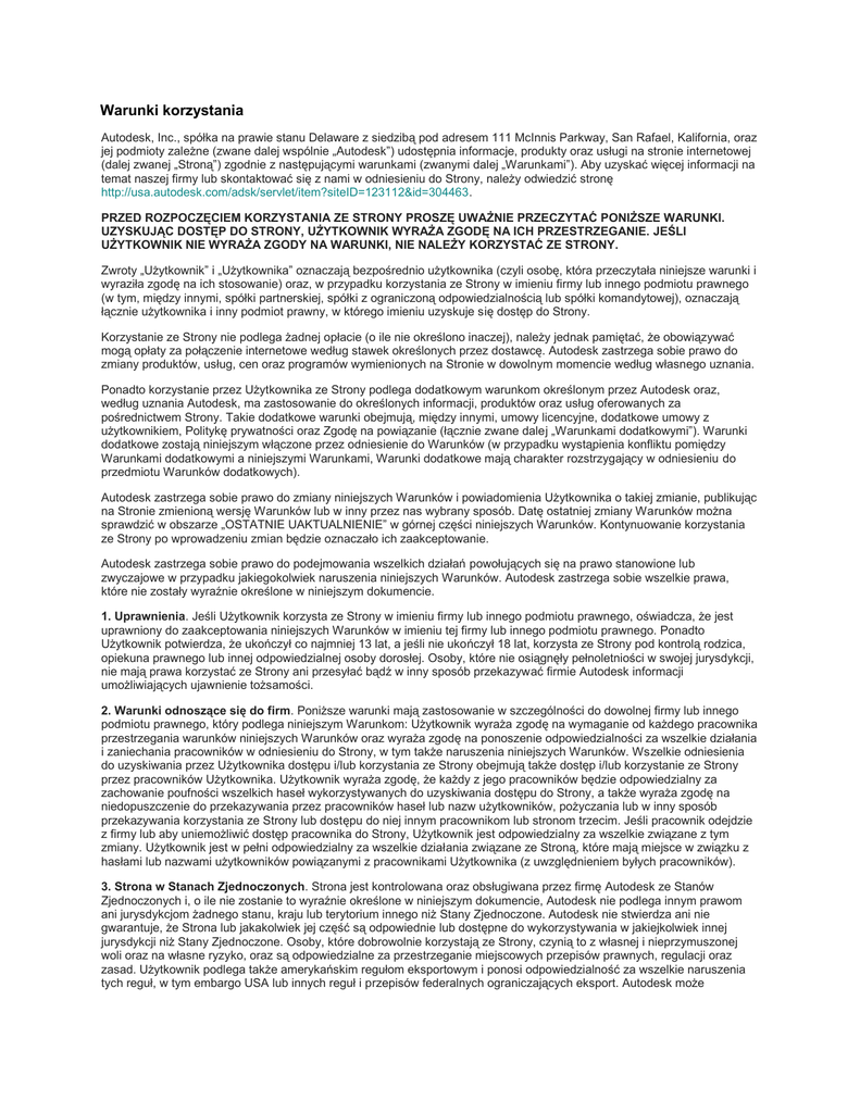 Warunki korzystania Autodesk, Inc., spółka na prawie stanu Delaware z siedzibą pod adresem 111 McInnis Parkway, San Rafael, Kalifornia, oraz jej podmioty zależne (zwane dalej wspólnie „Autodesk”) udostępnia informacje, produkty oraz usługi na stronie internetowej (dalej zwanej „Stroną”) zgodnie z następującymi warunkami (zwanymi dalej „Warunkami”). Aby uzyskać więcej informacji na temat naszej firmy lub skontaktować się z nami w odniesieniu do Strony, należy odwiedzić stronę http://usa.autodesk.com/adsk/servlet/item?siteID=123112&id=304463. PRZED ROZPOCZĘCIEM KORZYSTANIA ZE STRONY PROSZĘ UWAŻNIE PRZECZYTAĆ PONIŻSZE WARUNKI. UZYSKUJĄC DOSTĘP DO STRONY, UŻYTKOWNIK WYRAŻA ZGODĘ NA ICH PRZESTRZEGANIE. JEŚLI UŻYTKOWNIK NIE WYRAŻA ZGODY NA WARUNKI, NIE NALEŻY KORZYSTAĆ ZE STRONY. Zwroty „Użytkownik” i „Użytkownika” oznaczają bezpośrednio użytkownika (czyli osobę, która przeczytała niniejsze warunki i wyraziła zgodę na ich stosowanie) oraz, w przypadku korzystania ze Strony w imieniu firmy lub innego podmiotu prawnego (w tym, między innymi, spółki partnerskiej, spółki z ograniczoną odpowiedzialnością lub spółki komandytowej), oznaczają łącznie użytkownika i inny podmiot prawny, w którego imieniu uzyskuje się dostęp do Strony. Korzystanie ze Strony nie podlega żadnej opłacie (o ile nie określono inaczej), należy jednak pamiętać, że obowiązywać mogą opłaty za połączenie internetowe według stawek określonych przez dostawcę. Autodesk zastrzega sobie prawo do zmiany produktów, usług, cen oraz programów wymienionych na Stronie w dowolnym momencie według własnego uznania. Ponadto korzystanie przez Użytkownika ze Strony podlega dodatkowym warunkom określonym przez Autodesk oraz, według uznania Autodesk, ma zastosowanie do określonych informacji, produktów oraz usług oferowanych za pośrednictwem Strony. Takie dodatkowe warunki obejmują, między innymi, umowy licencyjne, dodatkowe umowy z użytkownikiem, Politykę prywatności oraz Zgodę na powiązanie (łącznie zwane dalej „Warunkami dodatkowymi”). Warunki dodatkowe zostają niniejszym włączone przez odniesienie do Warunków (w przypadku wystąpienia konfliktu pomiędzy Warunkami dodatkowymi a niniejszymi Warunkami, Warunki dodatkowe mają charakter rozstrzygający w odniesieniu do przedmiotu Warunków dodatkowych). Autodesk zastrzega sobie prawo do zmiany niniejszych Warunków i powiadomienia Użytkownika o takiej zmianie, publikując na Stronie zmienioną wersję Warunków lub w inny przez nas wybrany sposób. Datę ostatniej zmiany Warunków można sprawdzić w obszarze „OSTATNIE UAKTUALNIENIE” w górnej części niniejszych Warunków. Kontynuowanie korzystania ze Strony po wprowadzeniu zmian będzie oznaczało ich zaakceptowanie. Autodesk zastrzega sobie prawo do podejmowania wszelkich działań powołujących się na prawo stanowione lub zwyczajowe w przypadku jakiegokolwiek naruszenia niniejszych Warunków. Autodesk zastrzega sobie wszelkie prawa, które nie zostały wyraźnie określone w niniejszym dokumencie. 1. Uprawnienia. Jeśli Użytkownik korzysta ze Strony w imieniu firmy lub innego podmiotu prawnego, oświadcza, że jest uprawniony do zaakceptowania niniejszych Warunków w imieniu tej firmy lub innego podmiotu prawnego. Ponadto Użytkownik potwierdza, że ukończył co najmniej 13 lat, a jeśli nie ukończył 18 lat, korzysta ze Strony pod kontrolą rodzica, opiekuna prawnego lub innej odpowiedzialnej osoby dorosłej. Osoby, które nie osiągnęły pełnoletniości w swojej jurysdykcji, nie mają prawa korzystać ze Strony ani przesyłać bądź w inny sposób przekazywać firmie Autodesk informacji umożliwiających ujawnienie tożsamości. 2. Warunki odnoszące się do firm. Poniższe warunki mają zastosowanie w szczególności do dowolnej firmy lub innego podmiotu prawnego, który podlega niniejszym Warunkom: Użytkownik wyraża zgodę na wymaganie od każdego pracownika przestrzegania warunków niniejszych Warunków oraz wyraża zgodę na ponoszenie odpowiedzialności za wszelkie działania i zaniechania pracowników w odniesieniu do Strony, w tym także naruszenia niniejszych Warunków. Wszelkie odniesienia do uzyskiwania przez Użytkownika dostępu i/lub korzystania ze Strony obejmują także dostęp i/lub korzystanie ze Strony przez pracowników Użytkownika. Użytkownik wyraża zgodę, że każdy z jego pracowników będzie odpowiedzialny za zachowanie poufności wszelkich haseł wykorzystywanych do uzyskiwania dostępu do Strony, a także wyraża zgodę na niedopuszczenie do przekazywania przez pracowników haseł lub nazw użytkowników, pożyczania lub w inny sposób przekazywania korzystania ze Strony lub dostępu do niej innym pracownikom lub stronom trzecim. Jeśli pracownik odejdzie z firmy lub aby uniemożliwić dostęp pracownika do Strony, Użytkownik jest odpowiedzialny za wszelkie związane z tym zmiany. Użytkownik jest w pełni odpowiedzialny za wszelkie działania związane ze Stroną, które mają miejsce w związku z hasłami lub nazwami użytkowników powiązanymi z pracownikami Użytkownika (z uwzględnieniem byłych pracowników). 3. Strona w Stanach Zjednoczonych. Strona jest kontrolowana oraz obsługiwana przez firmę Autodesk ze Stanów Zjednoczonych i, o ile nie zostanie to wyraźnie określone w niniejszym dokumencie, Autodesk nie podlega innym prawom ani jurysdykcjom żadnego stanu, kraju lub terytorium innego niż Stany Zjednoczone. Autodesk nie stwierdza ani nie gwarantuje, że Strona lub jakakolwiek jej część są odpowiednie lub dostępne do wykorzystywania w jakiejkolwiek innej jurysdykcji niż Stany Zjednoczone. Osoby, które dobrowolnie korzystają ze Strony, czynią to z własnej i nieprzymuszonej woli oraz na własne ryzyko, oraz są odpowiedzialne za przestrzeganie miejscowych przepisów prawnych, regulacji oraz zasad. Użytkownik podlega także amerykańskim regułom ekspo