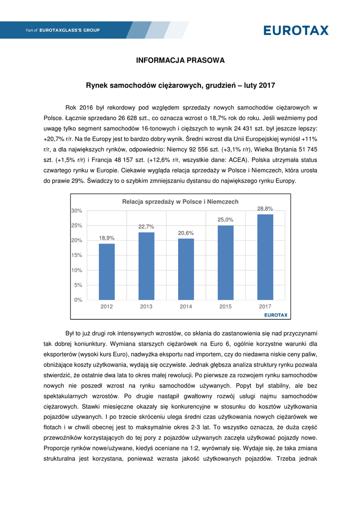 INFORMACJA PRASOWA Rynek samochodów ciężarowych, grudzień – luty 2017 Rok 2016 był rekordowy pod względem sprzedaży nowych samochodów ciężarowych w Polsce. Łącznie sprzedano 26 628 szt., co oznacza wzrost o 18,7% rok do roku. Jeśli weźmiemy pod uwagę tylko segment samochodów 16-tonowych i cięższych to wynik 24 431 szt. był jeszcze lepszy: +20,7% r/r. Na tle Europy jest to bardzo dobry wynik. Średni wzrost dla Unii Europejskiej wyniósł +11% r/r, a dla największych rynków, odpowiednio: Niemcy 92 556 szt. (+3,1% r/r), Wielka Brytania 51 745 szt. (+1,5% r/r) i Francja 48 157 szt. (+12,6% r/r, wszystkie dane: ACEA). Polska utrzymała status czwartego rynku w Europie. Ciekawie wygląda relacja sprzedaży w Polsce i Niemczech, która urosła do prawie 29%. Świadczy to o szybkim zmniejszaniu dystansu do największego rynku Europy. Relacja sprzedaży w Polsce i Niemczech 28,8% 30% 25,0% 25% 20% 22,7% 20,6% 18,9% 15% 10% 5% 0% 2012 2013 2014 2015 2017 Był to już drugi rok intensywnych wzrostów, co skłania do zastanowienia się nad przyczynami tak dobrej koniunktury. Wymiana starszych ciężarówek na Euro 6, ogólnie korzystne warunki dla eksporterów (wysoki kurs Euro), nadwyżka eksportu nad importem, czy do niedawna niskie ceny paliw, obniżające koszty użytkowania, wydają się oczywiste. Jednak głębsza analiza struktury rynku pozwala stwierdzić, że ostatnie dwa lata to okres małej rewolucji. Po pierwsze za rozwojem rynku samochodów nowych nie poszedł wzrost na rynku samochodów używanych. Popyt był stabilny, ale bez spektakularnych wzrostów. Po drugie nastąpił gwałtowny rozwój usługi najmu samochodów ciężarowych. Stawki miesięczne okazały się konkurencyjne w stosunku do kosztów użytkowania pojazdów używanych. I po trzecie skróceniu ulega średni czas użytkowania nowych ciężarówek we flotach i w chwili obecnej jest to maksymalnie okres 2-3 lat. To wszystko oznacza, że duża część przewoźników korzystających do tej pory z pojazdów używanych zaczęła użytkować pojazdy nowe. Proporcje rynków nowe/używane, kiedyś oceniane na 1:2, wyrównały się. Wydaje się, że taka zmiana strukturalna jest korzystana, ponieważ wzrasta jakość użytkowanych pojazdów. Trzeba jednak pamiętać, że odpływ użytkowników samochodów używanych spowoduje większy spadek ich wartości, co, w efekcie, w przyszłości wpłynie na wzrost stawek wynajmu. Spowoduje to również potencjalne straty oficjalnych importerów samochodów ciężarowych ze względu na przeszacowanie wartości kontraktów typu buy-back (zyski z samochodów nowych mogą nie pokryć strat na odsprzedaży pojazdów używanych). Dodatkowo trzeba pamiętać, że rynki eksportowe są aktualnie niedostępne: Rosja wciąż blokuje import pojazdów używanych, a kraje arabskie wchłaniają ich coraz mniej ze względu na nasycenie rynku, wojny i wysoki kurs Euro. Dodatkowo, przeciętny standard nowych pojazdów sprzedawanych w Polsce jest wciąż niższy, niż w Europie Zachodniej (uboższe wyposażenie, brak retarderów), co dyskwalifikuje je do sprzedaży na tamtejszym rynku. I, na koniec, rynek musi kiedyś odreagować wzrosty i zweryfikować rzeczywisty poziom zapotrzebowania. Spadek popytu wróży duże kłopoty z remarketingiem pojazdów używanych w naszym kraju i zwiększony spadek ich wartości w najbliższych latach. Szczególnie dotknie to pojazdów Euro 5, ponieważ ich wiek i przebieg kwalifikować je będą już tylko do transportu krajowego. Euro 6 powinno utrzymywać wysoką wartość, chociaż dostępność samochodów używanych spełniających tą normę wyraźnie rośnie. Oznacza to rosnący rozjazd wartości obu norm. W strukturze sprzedaży w Polsce od lat dominują pojazdy do transportu międzynarodowego. Segment samochodów dystrybucyjnych oraz budowlanych wciąż przeżywa stagnację i, na razie, nie widać większych szans na poprawę. Nieznacznie rośnie popyt na samochody 18-tonowe, mające docelowo zastąpić wycofywane 12-tonowe zestawy objętościowe, które w ubiegłym roku zostały objęte niemieckim mytem. Duże nadzieje związane z inwestycjami infrastrukturalnymi również się nie spełniają. Wartości używanych wywrotek ustabilizowały się, chociaż ich podaż na rynku wtórnym jest wyjątkowo mała. Sukces sprzedażowy samochodów ciężarowych w oczywisty sposób przełożył się na wzrosty na rynku naczep. Pierwsza trójka sprzedaży w Polsce pozostała bez zmian: Krone, Schmitz i Wielton. Jak zwykle, bardzo dobrze sprzedawały się naczepy kurtynowe standardowe i Mega. Popyt na naczepy skrzyniowe spadł do zera. Sporym zainteresowaniem cieszyły się naczepy podkontenerowe. Wywrotki budowlane sprzedają się na stałym, stosunkowo niskim poziomie. Tutaj oczekiwania producentów był znacznie większe, ale, póki co, nie widać ożywienia w branży budowlanej. Z kolei niezłym popytem cieszą się wersje rolnicze o większej pojemności. Tutaj widać trend do wymiany starszych i cięższych naczep na nowsze i lżejsze. W branży cysternowej w połowie ubiegłego roku doszło do załamania sprzedaży cystern paliwowych. Po wprowadzeniu koncesji na transport zza granicy zapotrzebowanie na nie bardzo spadło, a dotychczasowi użytkownicy bez koncesji starają się ich pozbyć za wszelką cenę. Zablokowanie rozwoju rynku paliwowego spowodowało, że część przewoźników mocno zainteresowało się cysternami chemicznymi. Zostały wykupione wszystkie, które były oferowane jako nowe i jako używane na rynku wtórnym. Dużym wzięciem cieszą się również silosy. Z kolei cysterny do LPG, czy spożywcze sprzedają się w normalnym tempie. Zmiennym zainteresowaniem cieszą się cysterny bitumiczne. Rynek nasycił się nimi przed Euro 2012 i w tej chwili widać powolny powrót do zakupów. Duży progres przeżył w 2016 roku także segment samochodów dostawczych. Wzrost r/r wyniósł 12,3%, co oznacza 59 812 szt. (dane: ACEA). Głów