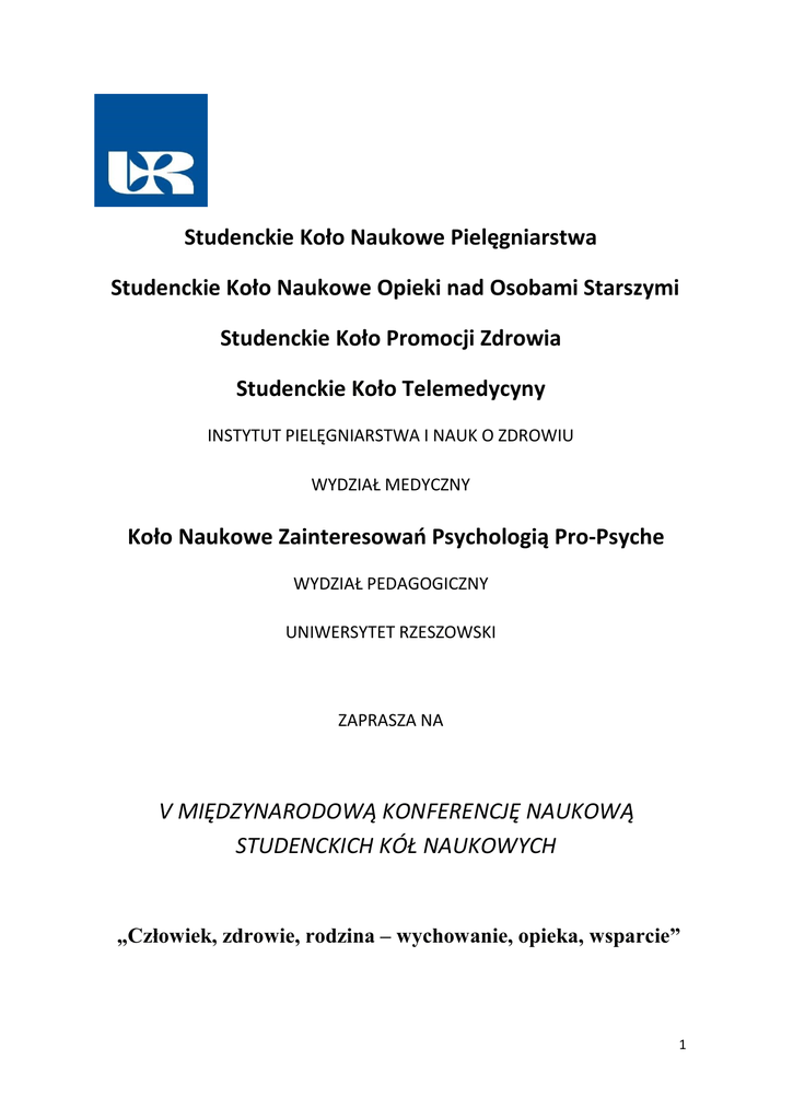 Studenckie Koło Naukowe Pielęgniarstwa Studenckie Koło Naukowe Opieki nad Osobami Starszymi Studenckie Koło Promocji Zdrowia Studenckie Koło Telemedycyny INSTYTUT PIELĘGNIARSTWA I NAUK O ZDROWIU WYDZIAŁ MEDYCZNY Koło Naukowe Zainteresowań Psychologią Pro-Psyche WYDZIAŁ PEDAGOGICZNY UNIWERSYTET RZESZOWSKI ZAPRASZA NA V MIĘDZYNARODOWĄ KONFERENCJĘ NAUKOWĄ STUDENCKICH KÓŁ NAUKOWYCH „Człowiek, zdrowie, rodzina – wychowanie, opieka, wsparcie” 1 RZESZÓW, 30-31 maja 2016 PATRONAT HONOROWY Rektor Uniwersytetu Rzeszowskiego Prof. dr hab. Sylwester Czopek Dziekan Wydziału Medycznego - dr hab. n.med. prof. UR Artur Mazur Dziekan Wydziału Pedagogicznego - dr hab. prof. UR Ryszard Pęczkowski Dyrektor Przyrodniczo-Medycznego Centrum Badań Innowacyjnych – dr hab. prof. UR Jacek Tabarkiewicz Komitet Naukowy Konferencji: Przewodniczący Komitetu Naukowego: Prof. dr hab. Józef Ryżko Dr n.med. Małgorzata Marć Członkowie: Prof. dr hab. n.med. Paweł Januszewicz Dr hab. n. o zdr. Monika Binkowska-Bury Dr hab. prof. UR Andrzej Łukasik Dr n.med. Małgorzata Marć Dr n.o zdr. Dariusz Bazaliński Dr n.o zdr. Filip Osuchowski 2 Dr n.med. Beata Penar-Zadarko Dr Małgorzata Marmola Dr Anna Wańczyk-Welc Mgr Joanna Burzyńska Komitet Organizacyjny Przewodnicząca Komitetu Organizacyjnego Dr n. med. Małgorzata Marć Członkowie: Monika Żelazna Kamil Grabias Julia Martyn Dominika Cioch Karolina Suchy Żaneta Ciepły Kinga Jaśniaczyk Małgorzata Stelmach Piotr Czarnecki Magdalena Kordowska Anita Bąk Eliza Grondecka Dominika Gierlak 3 Aneta Janusz Anna Wacławska Gabriela Jagoda Aleksandra Czucha Arleta Flis Janusz Kawa Agata Kołodziej Dagmara Łabudzka Renata Gawlik Małgorzata Durak Ewelina Maliborska Katarzyna Pasterczyk Angelika Ciupińska TEMATYKA KONFERENCJI 1. 2. 3. 4. 5. 6. 7. 8. Rodzinne uwarunkowania zdrowia człowieka Satysfakcja i jakość życia w zdrowiu i w chorobie Wychowanie , edukacja a zdrowie człowieka Psychologiczne uwarunkowania zdrowia Okresy rozwojowe a opieka nad człowiekiem Zachowania zdrowotne jednostki, rodziny, społeczności Profesjonalne i nieprofesjonalne systemy wsparcia Varia Miejsce Konferencji: Przyrodniczo-Medyczne Centrum Badań Innowacyjnych Uniwersytetu 4 Rzeszowskiego Rzeszów, ul. Warzywna 1a Ważne terminy: 30 kwietnia 2016 – termin nadsyłania zgłoszeń oraz streszczenia prac Udział w Konferencji nie wymaga wniesienia opłaty zjazdowej. Kontakt: e-mail: [email protected] lub dr n.med. Małgorzata Marć (695 930972) Tel. 17 8721111 , [email protected] Informacje: www.univ.rzeszow.pl KONKURS NA NAJLEPSZĄ PRACĘ PREZENTOWANĄ NA KONFERENCJI W TRAKCIE KONFERENCJI WSZYSTKIE PREZENTACJE BĘDĄ OCENIANE PRZEZ KOMITET NAUKOWY KONFERENCJI ORAZ ZOSTANIE WYŁONIONA/WYŁONIONE NAJLEPSZA/E PRACE PREZENTOWANE NA KONFERENCJI 5