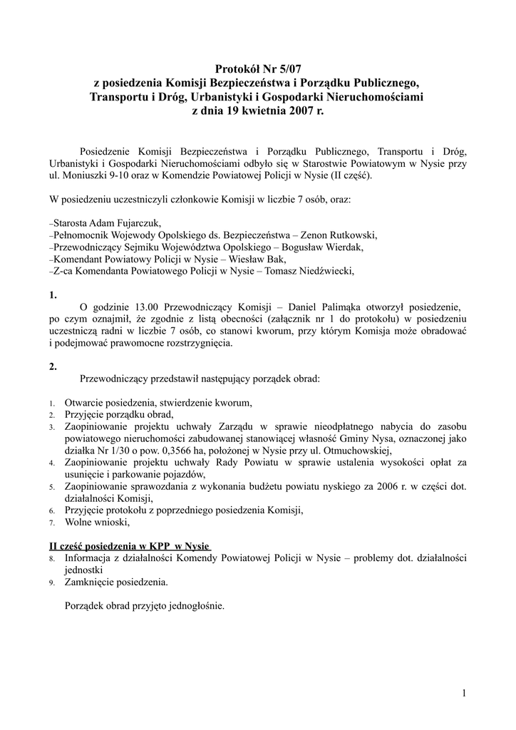 Protokół Nr 5/07 z posiedzenia Komisji Bezpieczeństwa i Porządku Publicznego, Transportu i Dróg, Urbanistyki i Gospodarki Nieruchomościami z dnia 19 kwietnia 2007 r. Posiedzenie Komisji Bezpieczeństwa i Porządku Publicznego, Transportu i Dróg, Urbanistyki i Gospodarki Nieruchomościami odbyło się w Starostwie Powiatowym w Nysie przy ul. Moniuszki 9-10 oraz w Komendzie Powiatowej Policji w Nysie (II część). W posiedzeniu uczestniczyli członkowie Komisji w liczbie 7 osób, oraz: −Starosta Adam Fujarczuk, Wojewody Opolskiego ds. Bezpieczeństwa – Zenon Rutkowski, −Przewodniczący Sejmiku Województwa Opolskiego – Bogusław Wierdak, −Komendant Powiatowy Policji w Nysie – Wiesław Bak, −Z-ca Komendanta Powiatowego Policji w Nysie – Tomasz Niedźwiecki, −Pełnomocnik 1. O godzinie 13.00 Przewodniczący Komisji – Daniel Palimąka otworzył posiedzenie, po czym oznajmił, że zgodnie z listą obecności (załącznik nr 1 do protokołu) w posiedzeniu uczestniczą radni w liczbie 7 osób, co stanowi kworum, przy którym Komisja może obradować i podejmować prawomocne rozstrzygnięcia. 2. Przewodniczący przedstawił następujący porządek obrad: 1. 2. 3. 4. 5. 6. 7. Otwarcie posiedzenia, stwierdzenie kworum, Przyjęcie porządku obrad, Zaopiniowanie projektu uchwały Zarządu w sprawie nieodpłatnego nabycia do zasobu powiatowego nieruchomości zabudowanej stanowiącej własność Gminy Nysa, oznaczonej jako działka Nr 1/30 o pow. 0,3566 ha, położonej w Nysie przy ul. Otmuchowskiej, Zaopiniowanie projektu uchwały Rady Powiatu w sprawie ustalenia wysokości opłat za usunięcie i parkowanie pojazdów, Zaopiniowanie sprawozdania z wykonania budżetu powiatu nyskiego za 2006 r. w części dot. działalności Komisji, Przyjęcie protokołu z poprzedniego posiedzenia Komisji, Wolne wnioski, II cześć posiedzenia w KPP w Nysie 8. Informacja z działalności Komendy Powiatowej Policji w Nysie – problemy dot. działalności jednostki 9. Zamknięcie posiedzenia. Porządek obrad przyjęto jednogłośnie. 1 Ad 3 Zaopiniowanie projektu uchwały Zarządu w sprawie nieodpłatnego nabycia do zasobu powiatowego nieruchomości zabudowanej stanowiącej własność Gminy Nysa, oznaczonej jako działka Nr 1/30 o pow. 0,3566 ha, położonej w Nysie przy ul. Otmuchowskiej, Starosta Adam Fujarczuk zabierając głos oznajmił, iż zgodnie z uchwała Rady Powiatu, nieodpłatne przejęcie mienia na rzecz powiatu należy do kompetencji Zarządu. Wyjaśnił także, że przejęta nieruchomość będzie przeznaczona na „Inkubator przedsiębiorczości”. Ponadto dodał, że powiat posiada na ten cel część środków, natomiast pozostałą część planuje się pozyskać z programów unijnych. Komisja po krótkiej dyskusji jednogłośnie pozytywnie zaopiniowała przedmiotowy projekt uchwały (projekt uchwały stanowi załącznik nr 2 do protokołu). Ad 4 Zaopiniowanie projektu uchwały Rady Powiatu w sprawie ustalenia wysokości opłat za usunięcie i parkowanie pojazdów. Radny Zdzisław Osiński odnosząc się do przedstawionego projektu uchwały zwrócił uwagę, na zbyt wysokie stawki za parkowanie pojazdów ciężarowych z przyczepą lub naczepą. Radny Ryszard Jamiśki spytał na jakiej podstawie zostały ustalone stawki zawarte w przedłożonym projekcie uchwały. Naczelnik Wydziału Komunikacji i Transportu – Daniel Zimoch odparł, że stawki te zostały ustalone w oparciu o stawki obowiązujące na terenie ościennych powiatów. Dodał, że ustalenie ich wysokości należy do kompetencji Rady, jeżeli Rada uzna, że są one zbyt wysokie, to może je obniżyć. Kontynuując oznajmił, że w chwili obecnej, obowiązuje uchwała z 2002 r. i stawki wynikające z tej uchwały nie przystają do obecnych cen. Potwierdzeniem tego jest fakt, iż na zapytanie ofertowe, wystosowane przez Starostę do firm, prowadzących tego rodzaju działalność, zgłosiła się tylko jedna firma, która zaoferowała o wiele wyższe kwoty. W tej sytuacji nie doszło do wyłonienia oferenta. Jednocześnie koniecznym stało się zwiększenie stawek w obecnie obowiązującej uchwale, co zwiększy szanse na wybór oferenta. Naczelnik wyjaśnił również, że środki z tytułu usuwania parkowania pojazdów nie stanowią dochodu powiatu lecz dochód firmy, która realizuje te zadania. Przewodniczący Komisji D. Palimąka stwierdził, że porównywał stawki zawarte w projekcie z Kielcami, z powiatem ostrołęckim, i innymi. Z porównania tego wynika, ze wysokość tych stawek jest podobna jak w przypadku naszego powiatu. Dodał ponadto, że firmy które chciałyby prowadzić działalność związaną z usuwaniem pojazdów muszą spełniać określone warunki. Takich firm na terenie powiatu nyskiego jest niestety niewiele, co sprawia że nie ma odpowiedniej konkurencji, która powodowałaby obniżenie cen. Po wyczerpaniu dyskusji Przewodniczący Komisji Daniel Palimąka poddał pod głosowanie projekt uchwały w sprawie ustalenia wysokości opłat za usunięcie i parkowanie pojazdów. W głosowaniu uczestniczyło 7 radnych, przy 6 głosach ‘za” i 1 „wstrzymującym” Komisja pozytywnie zaopiniowała powyższy projekt uchwały (projekt uchwały stanowi załącznik nr 3 do protokołu). 2 Ad 5 Zaopiniowanie sprawozdania z wykonania budżetu powiatu nyskiego za 2006 r. w części dot. działalności Komisji. Przewodniczący Komisji Daniel Palimąka poinformował, że jako członek Komisji Rewizyjnej analizował szczegółowo sprawozdanie z wykonania budżetu za 2006 r. i nie stwierdził w nim większych uchybień. Dodał jednocześnie, że Komisja wypracowała pewne wnioski, jednak nie dotyczyły one spraw związanych z zakresem działania Komisji Bezpieczeństwa. Skarbnik Powiatu – Jadwiga Kadróg omówiła sprawozdanie z wykonania budżetu powiatu nyskiego na 2007 r. Oznajmiła między innymi, że zrealizowane dochody za 2006 r. zamknęły się 85.720.926 zł, co stanowiło 98,81 %. Z kolei wyd