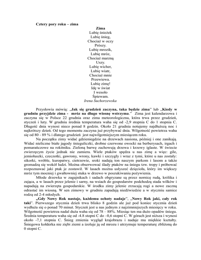 Cztery pory roku – zima Zima Lubię śnieżek Lubię śnieg, Chociaż w oczy Prószy. Lubię mrozik, Lubię mróz, Chociaż marzną Uszy. Lubię wicher, Lubię wiatr, Chociaż mnie Przewiewa. Lubię zimę! Idę w świat I wesoło Śpiewam. Irena Suchorzewska Przysłowia mówią: „Jak się grudzień zaczyna, taka będzie zima” lub „Kiedy w grudniu przyjdzie zima - mróz na długo wiosnę wstrzyma.” Zima jest kalendarzowa i zaczyna się w Polsce 22 grudnia oraz zima meteorologiczna, która trwa przez grudzień, styczeń i luty. W grudniu średnia temperatura waha się od -2,9 stopnia C do 1 stopnia C. Długość dnia wynosi nieco ponad 8 godzin. Około 21 grudnia notujemy najdłuższą noc i najkrótszy dzień. Od tego momentu zaczyna już przybywać dnia. Wilgotność powietrza waha się od 80 - 89 % i dlatego grudzień jest najwilgotniejszym miesiącem roku. Na początku zimy widać gdzieniegdzie na drzewach nasiona, później i one zanikają. Widać nieliczne białe jagody śnieguliczki, drobne czerwone owocki na berberysach, irgach i pomarańczowe na rokitniku. Zieloną barwę zachowują drzewa i krzewy iglaste. W świecie zwierzęcym życie jednak nie zamiera. Wiele ptaków spędza u nas zimę a więc: gile, jemiołuszki, czeczotki, gawrony, wrony, kawki i szczygły i wraz z tymi, które u nas zostały: sikorki, wróble, kuropatwy, cietrzewie, sroki nadają ton naszym parkom i lasom a także gromadzą się wokół ludzi. Można obserwować ślady ptaków na śniegu tzw. tropy i próbować rozpoznawać jaki ptak je zostawił. W lasach można usłyszeć dzięcioła, który im większy mróz tym mocniej i gwałtowniej stuka w drzewo w poszukiwaniu pożywienia. Młode drzewka w zagajnikach i sadach obgryzane są przez nornicę rudą, królika i zająca, a w lasach przez jelenie i sarny, na wsiach do gospodarstw podchodzą stada wilków i napadają na zwierzęta gospodarskie. W środku zimy jelenie zrzucają rogi a nowe zaczną odrastać im wiosną. W sen zimowy w grudniu zapadają niedźwiedzie a w styczniu samice rodzą od 2-4 młodych. „Gdy Nowy Rok nastaje, każdemu ochoty nadaje”, „Nowy Rok jaki, cały rok taki”. Pierwszego stycznia dzień trwa blisko 8 godzin ale już pod koniec stycznia dzień wydłuża się o ponad 70 minut. Styczeń jest u nas jednym z najzimniejszych miesięcy w roku. Wilgotność powietrza nadal duża waha się od 78 – 88%. Miesiąc ten ma dużo opadów śniegu. Średnia temperatura waha się od -4.8 stopni C do –0,6 stopni C. W górach jest niższa i wynosi około -7,1 stopnia C. Śnieg zmienia wygląd krajobrazu i nadaje mu miękkie kształty. Śniegowa kołderka nie ziębi ziemi a izoluje ją od mrozu i utrzymuje temperaturę zbliżoną do 0 stopni C. W czasie zimy większość zbiorników wodnych pokrywa się lodem. W większych zbiornikach, które nie zamarzają do dna toczy się tarło. W grudniu dobiega końca tarło łososia, troci, pstrąga, siei i sielawy. W styczniu na niektórych rzekach trwa tarło łososi, troci i pstrąga źródlanego. „Idzie luty – włóż ciepłe buty.” „Gdy mróz w lutym ostro trzyma – wtedy już niedługo zima”. Luty jest ostatnim miesiącem zimy ale też bywa najbardziej dokuczliwy ze względu na mrozy i opady śniegu. Średnia temperatura waha się od 4,2 stopni do 0,1 stopni C. Dzień jest już dłuższy o prawie dwie godziny. Wilgotność waha się od 73-85%. W drugiej połowie lutego, jeżeli nie ma mrozów rozpoczyna się ożywienie wśród ptaków. Rozpoczynają się wędrówki wron i będą trwały do kwietnia. Wraca z zachodu łabędź niemy, dzięcioł zielony. Można usłyszeć gęganie gęsi gęgaw, które powracają długimi kluczami. Zdarza się też, że wraca skowronek. W lutym zaczyna się okres tarła pstrąga tęczowego, szczupaka i głowacza. Borsuk budzi się ze snu zimowego. Marzec jest u nas miesiącem bardzo zmiennej pogody: „W marcu jak w garncu”. Około 20 marca następuje zrównanie dnia z nocą a dzień 21 marca to pierwszy dzień wiosny. Ważne wydarzenia i daty: 6 grudnia – Św. Mikołaja 24-26 grudnia – Święta Bożego Narodzenia 31 grudnia – Sylwester 6 stycznia – święto Trzech Króli 21 stycznia – Dzień Babci 22 stycznia – Dzień Dziadka 14 luty – Walentynki 17 luty – Międzynarodowy Dzień Kota 1. 2. 3. 4. 5. 6. 7. Literatura: Henryk Sandner, Zdzisława Wójcik, Kalendarz Przyrody, Warszawa 1978; Rene Mettler, Przyroda przez cały rok, Warszawa 1999; Maria Kownacka, Razem ze słonkiem. Zima, Warszawa 1975; Maria Przybysz-Piwko, Zbiór przysłów i zagadek dla dzieci, Warszawa 1995; Wychowanie w Przedszkolu nr 1/ 1994; Wychowanie w Przedszkolu nr 1,2,10/ 2000. Wychowanie w Przedszkolu nr 1/ 2001. Opracowały: B.Michniewicz, E.Krzysiek