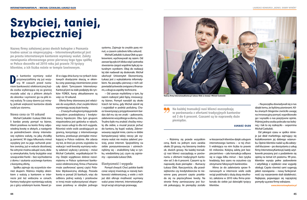 Laureaci konkursu „Biznes. dobry wybór” internetowykantor.pl – michał Czekalski, Łukasz Olek Szybciej, taniej, bezpieczniej Nazwę firmy założonej przez dwóch kolegów z Poznania trudno uznać za nieprecyzyjną – InternetowyKantor.pl jest po prostu internetowym kantorem wymiany walut. Zalety rozwiązania oferowanego przez pierwszą tego typu spółkę w Polsce doceniło od 2010 roku już prawie 70 tysięcy klientów, a ich liczba rośnie w tempie lawinowym. D o kantorów wymiany walut przyzwyczailiśmy się już wszyscy. W czasach przed nastaniem bankowości elektronicznej każda osoba wybierająca się za granicę musiała udać się z plikiem złotych do okienka i wymienić go na plik innej waluty. Te czasy dawno już minęły, jednak większość kantorów działa nadal po staremu. Nowa cena co 10 sekund Michał Czekalski i Łukasz Olek mieli bardzo prosty pomysł na biznes. Klient przelewa na konto firmy odpowiednią kwotę w złotych, a następnie za pośrednictwem strony internetowej wybiera walutę, na jaką chciałby ją zamienić. W ciągu kilkunastu minut wysyłany jest na jego rachunek przelew zwrotny, już w walucie docelowej. Na witrynie można zakupić euro, dolary amerykańskie, funty brytyjskie oraz szwajcarskie franki – bez wychodzenia z domu i szukania uczciwego kantoru z korzystną ofertą. Spółka zajmuje się oczywiście również skupem. Różnica między okienkiem z walutą a kantorem w internecie jest też widoczna w cenach. Kantory tradycyjne wymieniają walutę po z góry ustalonym kursie. Nawet je44 śli w ciągu dnia kursy na rynkach światowych drastycznie skaczą, w okienku ceny pozostają niezmienione przez cały dzień. Tymczasem InternetowyKantor.pl jest na stałe podpięty do rynków FOREX, kursy aktualizowane są więc co 10 sekund. Oferta firmy skierowana jest właściwie do wszystkich, choć zwykle klienci wymieniają raczej duże kwoty. – Z naszych usług korzystają przede wszystkim przedsiębiorcy i kredytobiorcy hipoteczni. Obu tym grupom niepotrzebna jest gotówka w rękach, więc nasze usługi to dla nich wygoda. Również wiele osób zarabiających za granicą, korzystając z internetowego kantoru, przekazuje pieniądze mieszkającej w Polsce rodzinie. Ale zdarza się też, że ktoś po prostu wyjeżdża na wakacje i woli kwestię wymiany waluty załatwić szybciej i prościej – mówi Michał Czekalski, współzałożyciel firmy. Dzięki wyjątkowo dobrze rozwiniętemu w Polsce systemowi bankowości elektronicznej, firma z Poznania może zaoferować sporej części Polaków błyskawiczną obsługę. Posiada konta w ponad 20 bankach, więc do odbioru jednej waluty i przelewów w innej może wykorzystywać ekspresowe przelewy w obrębie jednego systemu. Zajmuje to zwykle parę minut, a czasem zaledwie kilka sekund. Michał Czekalski i Łukasz Olek są spokrewnieni, wychowywali się razem. Od zawsze łączyła ich bliska więź i potrzeba stworzenia czegoś wspólnie była jej naturalnym wynikiem. Obaj do realizacji tej idei nadawali się doskonale. Michał ukończył Uniwersytet Ekonomiczny, Łukasz jest z wykształcenia informatykiem. Na początku pierwszy z nich odpowiadał za kwestie związane z finansami, a drugi za aspekty techniczne. – Od zawsze myśleliśmy o tym, by razem rozkręcić jakiś fajny, innowacyjny biznes. Pomysł narodził się około trzech lat temu, gdy Michał ożenił się i wyjeżdżał w podróż poślubną. Chaos towarzyszący przygotowaniom bardzo dał mu się we znaki – pakowanie, załatwienie wszystkiego w domu, stres. Trudno było mu znaleźć choćby minutę dla siebie, a musiał jeszcze jechać do kantoru, by kupić walutę. Zdenerwowany zapytał mnie, czemu w dobie komputeryzacji takiej rzeczy jak wymiana walut nie można załatwić prościej, przez internet. Spojrzeliśmy na siebie porozumiewawczo i uśmiechnęliśmy się – znaleźliśmy lukę w rynku, wiedzieliśmy już, czym się zajmiemy – opowiada Łukasz Olek. Elastyczność i wygoda Pomysł chwycił. Choć polskie banki coraz więcej inwestują w rozwój bankowości elektronicznej, a wiele z nich już dziś oferuje możliwość wymiany walut przez internet, InternetowyKantor.pl wciąż utrzymuje przewagę. Twórcy firmy InternetowyKantor.pl: Łukasz Olek (z lewej) i Michał Czekalski Na każdej transakcji nasi klienci oszczędzają w porównaniu z ofertami tradycyjnych kantorów od 3 do 6 procent. Czasami są to naprawdę duże pieniądze. Łukasz Olek – Różnimy się przede wszystkim ceną. Bank na jednym euro zarabia około 20 groszy, my bierzemy średnio ok. dwóch groszy. Na każdej transakcji nasi klienci oszczędzają w porównaniu z ofertami tradycyjnych kantorów od 3 do 6 procent. Czasami są to naprawdę duże pieniądze – tłumaczy Łukasz Olek. Rzeczywiście, dla przedsiębiorstw czy kredytobiorców te niewinne parę procent często przekłada się na pięciocyfrowe kwoty. Na stronie firmy zamieszczony jest licznik pokazujący, ile pieniędzy zostało w kieszeniach klientów dzięki usługom internetowego kantoru – w tej chwili widniejąca na nim liczba to prawie 65 milionów. Kolejną zaletą jest bezpieczeństwo – cała transakcja odbywa się w ciągu kilku minut – bez ryzyka kradzieży, bez szans na oszustwo czy otrzymanie fałszywych banknotów. Mimo że do załatwiania spraw finansowych w internecie wiele osób wciąż podchodzi z dużą dozą nieufności, założona w 2010 roku firma przekonała do siebie już dziesiątki tysięcy klientów. – Na początku dowiadywali się o nas dzięki temu, że byliśmy pionierami. Kilku znanych blogerów zwróciło uwagę na innowacyjny pomysł, wypróbowało go i wyraziło o nas pozytywne opinie. Później jedna osoba polecała nas kolejnej, i tak to się rozkręciło – wspomina Michał Czekalski. Od jakiegoś czasu w spółce istnieje już dział marketingu zajmujący się kształtowaniem jej dobrego wizerunku. Opinie klientów nadal są dla założycieli k