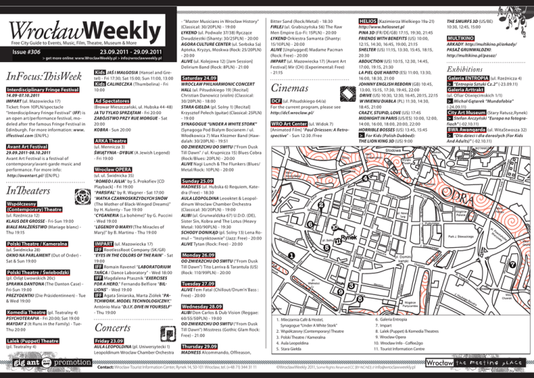 WrocławWeekly Free City Guide to Events, Music, Film, Theatre, Museum & More Issue #306 23.09.2011 - 29.09.2011 > get more online: www.WroclawWeekly.pl > [email protected] InFocus:ThisWeek Interdisciplinary Fringe Festival 14.09-07.10.2011 IMPART (ul. Mazowiecka 17) Ticket: from 10PLN/spectacle “Interdisciplinary Fringe Festival" (IFF) is an open art/performance festival, modeled after the famous Fringe Festival in Edinburgh. For more information: www. iffestival.com (EN/PL) Avant Art Festival 29.09.2011-08.10.2011 Avant Art Festival is a festival of contemporary/avant-garde music and performance. For more info: http://avantart.pl/ (EN/PL) InTheaters Współczesny (Contemporary) Theatre (ul. Rzeźnicza 12) Klaus der Grosse - Fri-Sun 19:00 Białe małżeństwo (Mariage blanc) Thu 19:15 Polski Theatre / Kameralna (ul. Świdnicka 28) Okno na Parlament (Out of Order) Sat & Sun 19:00 Polski Theatre / Świebodzki (pl. Orląt Lwowskich 20c) Sprawa Dantona (The Danton Case) Fri-Sun 19:00 Prezydentki (Die Präsidentinnen) - Tue & Wed 19:00 Komedia Theatre (pl. Teatralny 4) Psychoterapia - Fri 20:00; Sat 19:00 Mayday 2 (It Runs in the Family) - TueThu 20:00 Lalek (Puppet) Theatre (pl. Teatralny 4) Kids Jaś i Małgosia (Hansel and Gretel) - Fri 17:30; Sat 15:00; Sun 11:00, 13:00 Kids Calineczka (Thumbelina) - Fri 10:00 Ad Spectatores (Browar Mieszczański, ul. Hubska 44-48) Ja tu tylko sprzątam - Fri 20:00 Zabójstwo przy rue Morgue - Sat 20:00 Kobra - Sun 20:00 ARKA Theatre (ul. Mennicza 3) Świątynia - Dybuk (A Jewish Legend) - Fri 19:00 Wrocław OPERA (ul. ul. Świdnicka 35) “Romeo i Julia" by S. Prokofiev [CD Playback] - Fri 19:00 “Parsifal" by R. Wagner - Sat 17:00 “Matka czarnoskrzydłych snów (The Mother of Black-Winged Dreams)" by H. Kulenty - Tue 19:00 “Cyganeria (La bohème)" by G. Puccini - Wed 19:00 “Legendy o Maryi (The Miracles of Mary)" by B. Martinu - Thu 19:00 IMPART (ul. Mazowiecka 17) IFF RootlessRoot Company (SK/GR) “Eyes in the Colors of the Rain" - Sat 19:00 IFF Romain Ravenel “Laboratorium tańca / Dance Laboratory" - Wed 18:00 IFF Magdalena Ptasznik “Exercises for a Hero," Fernando Belfiore “Billions" - Wed 19:00 IFF Agata Siniarska, Marta Ziółek “Patchwork. Model technologiczny," António Maia “D.I.Y. Dive In Yourself" - Thu 19:00 - “Master Musicians in Wrocław History" (Classical: 30/20PLN) - 19:00 ŁYKEND (ul. Podwale 37/38) Ryczące Dwudziestki (Shanty: 30/25PLN) - 20:00 AGORA CULTURE CENTER (ul. Serbska 5a) Apteka, Kryzys, Moskwa (Rock: 25/20PLN) - 20:00 ALIVE (ul. Kolejowa 12) [Jam Session] Delirium Band (Rock: 8PLN) - 21:00 Saturday 24.09 WROCŁAW PHILHARMONIC CONCERT HALL (ul. Piłsudskiego 19) [Recital] Christian Danowicz (violin) (Classical: 30/20PLN) - 18:00 STARA GIEŁDA (pl. Solny 1) [Recital] Krzysztof Pełech (guitar) (Classical: 25PLN) - 19:00 SYNAGOGUE “UNDER A WHITE STORK" (Synagoga Pod Białym Bocianem / ul. Włodkowica 7) Max Klezmer Band (Hawdalah: 30/20PLN) - 19:51 OD ZMIERZCHU DO SWITU (“From Dusk Till Dawn" / ul. Krupnicza 15) Blues Cobra (Rock/Blues: 20PLN) - 20:00 ALIVE Nagi Lunch & The Flunkers (Blues/ Metal/Rock: 10PLN) - 20:00 Cinemas DCF (ul. Piłsudskiego 64/a) For the current program, please see http://dcf.wroclaw.pl/ WRO Art Center (ul. Widok 7) [Animated Film] “Paul Driessen: A Retrospective" - Sun 12:30 /Free Monday 26.09 OD ZMIERZCHU DO SWITU (“From Dusk Till Dawn") Tito Larriva & Tarantula (US) (Rock: 110/99PLN) - 20:00 Tuesday 27.09 ALIVE Fem Fatal (Chillout/Drum’n’Bass : Free) - 20:00 AULA LEOPOLDINA (pl. Uniwersytecki 1) Leopoldinum Wroclaw Chamber Orchestra MADNESS Alcommando, Offreason, Thursday 29.09 Contact: Wrocław Tourist Information Center, Rynek 14, 50-101 Wrocław, tel. (+48 71) 344 31 11 MULTIKINO Arkady: http://multikino.pl/arkady/ Pasaż Grunwaldzki: http://multikino.pl/pasaz/ Exhibitions Galeria ENTROPIA (ul. Rzeźnicza 4) > “Entropia Sztuki Cz.2" (-23.09.11) Galeria Arttrakt (ul. Ofiar Oświęcimskich 1/1) > Michał Gątarek “Mundofobia" (-24.09.11) City Art Museum (Stary Ratusz,Rynek) > Stefan Arczyński “Europa na fotografiach" (-02.10.11) BWA Awangarda (ul. WitaStwosza 32) > “Dla dzieci i dla dorosłych (For Kids And Adults)" (-02.10.11) 2 6 1 10 5 11 7 9 Wednesday 28.09 Concerts The Smurfs 3D (US/BE) 10:30, 12:45, 15:00 4 Sunday 25.09 MADNESS (ul. Hubska 6) Requiem, Katedra (Free) - 18:30 AULA LEOPOLDINA Leooktet & Leopolpl. Jana dinum Wroclaw Chamber Orchestra Pawła II (Classical: 30/20PLN) - 19:00 ALIBI (ul. Grunwaldzka 67) U.D.O. (DE), Sister Sin, Kobra and The Lotus (Heavy Metal: 100/90PLN) - 19:30 SCHODY DONIKĄD (pl. Solny 13) Lena Romul – “Instynktownie" (Jazz: Free) - 20:00 ALIVE Tytan (Rock: Free) - 20:00 ALIBI Don Carlos & Dub Vision (Reggae: 60/55/50PLN) - 19:00 OD ZMIERZCHU DO SWITU (“From Dusk Till Dawn") Misstress (Gothic Glam Rock: Free) - 21:00 Friday 23.09 HELIOS (Kazimierza Wielkiego 19a-21) http://www.heliosnet.pl Pina 3D (FR/DE/GB) 17:15, 19:30, 21:45 Friends with Benefits (US) 10:00, 12:15, 14:30, 16:45, 19:00, 21:15 Shelter (US) 11:15, 13:30, 15:45, 18:15, 20:30 Abduction (US) 10:15, 12:30, 14:45, 17:00, 19:15, 21:30 La Piel que habito (ES) 11:00, 13:30, 16:00, 18:30, 21:00 Johnny English Reborn (GB) 10:45, 13:00, 15:15, 17:30, 19:45, 22:00 Drive (US) 10:30, 12:30, 16:45, 20:15, 22:15 W imieniu diabła (PL) 11:30, 14:30, 18:45, 21:00 Crazy, Stupid, Love (US) 17:45 Midnight In Paris (US/ES) 10:00, 12:00, 14:00, 16:00, 18:00, 20:00, 22:00 Horrible Bosses (US) 13:45, 15:45 > For Kids (Polish Dubbed): The Lion King 3D (US) 9:00 Bitter Sand (Rock/Metal) - 18:30 FIRLEJ (ul. Grabiszyńska 56) The Raw Men Empire (Lo-Fi: 15PLN) - 20:00 ŁYKEND Orkiestra Samanta (Shanty: 15/10PLN) - 20:00 ALIVE [Unplugged] Madame Pacman (Rock: Free) - 20:00 IMPART (ul. Mazowiecka 17) [Avant Art Festival] Mir (CH) (Experimental: Free) - 21:15 1. Mleczarnia Café & Hostel, Synagogue “Under A White Stork" 2. Współczesny (Contemporary) Theatre 3. Polski Theatre 
