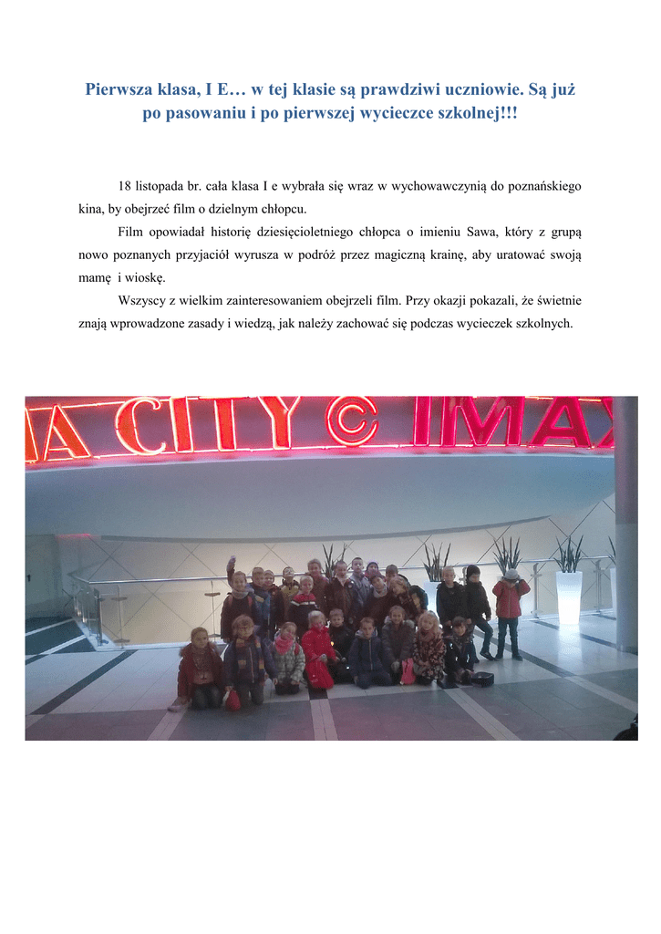 Pierwsza klasa, I E… w tej klasie są prawdziwi uczniowie. Są już po pasowaniu i po pierwszej wycieczce szkolnej!!! 18 listopada br. cała klasa I e wybrała się wraz w wychowawczynią do poznańskiego kina, by obejrzeć film o dzielnym chłopcu. Film opowiadał historię dziesięcioletniego chłopca o imieniu Sawa, który z grupą nowo poznanych przyjaciół wyrusza w podróż przez magiczną krainę, aby uratować swoją mamę i wioskę. Wszyscy z wielkim zainteresowaniem obejrzeli film. Przy okazji pokazali, że świetnie znają wprowadzone zasady i wiedzą, jak należy zachować się podczas wycieczek szkolnych.