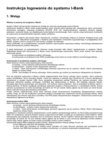 Instrukcja logowania do systemu I-Bank 1. Wstęp Witamy w pomocy do programu I-Bank! System I-Bank oferuje bardzo bezpieczny dostęp do rachunku bankowego przez Internet. Użytkownik Systemu I-Bank może przeprowadzać przez Internet takie operacje jak: sprawdzenie stanu rachunków, drukowanie wyciągów, realizacja przelewów (ELIXIR, ZUS, US, międzynarodowy), założenie zlecenia stałego, założenie i zerwanie lokaty czy doładowanie konta telefonu komórkowego. Ilość i zakres usług bankowych możliwych do wykonania za pośrednictwem internetu zależy od Banku. Korzystanie z systemu jest bardzo łatwe i bezpieczne, możliwe z dowolnego miejsca na świecie, dostępne przez całą dobę i cały rok. Warunkiem korzystania z Systemu jest posiadanie: komputera wyposażonego w przeglądarkę stron WWW, systemu JAVA w wersji 6.07 lub nowszy i dostępu do Internetu. Warto podkreślić, że w projektowaniu i budowie Systemu wykorzystano najnowsza wiedzę i technologię zabezpieczeń przed ewentualnymi próbami włamania. Z usług bankowych za pośrednictwem internetu mogą korzystać tylko klienci zarejestrowani w systemie I-Bank. Rejestracja klienta jest wykonywana w Banku przez uprawnionego pracownika. Klient może wybrać dwa sposoby autoryzacji zleceń: a) autoryzacja na podstawie podpisu cyfrowego, b) autoryzacja na podstawie kodu SMS przesłanego przez bank na numer telefonu komórkowego klienta. Autoryzacja na podstawie podpisu cyfrowego. Klient otrzyma z banku kartę rejestracyjną, która zawiera: a) modulo - numer bankowy jednoznacznie identyfikujący klienta, b) identyfikator - unikalny numer dysponenta rachunku, c) hasło - hasło jednorazowe umożliwiające pierwsze logowanie się do systemu I-Bank. Klient zobowiązany będzie do zmiany hasła, d) PIN - kod dostępu do klucza cyfrowego. Klient powinien go zmienić po pierwszym zalogowaniu do Systemu. Przy tej metodzie autoryzacji w Banku zostały wygenerowane dwa klucze cyfrowe: klucz prywaty i klucz publiczny zwany certyfikatem. Klucz prywatny klienta może być zapisany w pamięci typu PenDrive lub w kluczu sprzętowym wykonanym w postaci wtyczki USB. Klucz sprzętowy przypomina pamięć PenDrive ale zawiera procesor, który wykonuje obliczenie podpisu cyfrowego. Certyfikat jest zdeponowany w Banku. Dla każdego zlecenia klienta, używając jego klucza prywatnego, jest wyliczany kod cyfrowy zwany podpisem. Jest on przesłany do Banku razem z treścią zlecenia. W Banku następuje weryfikacja zgodności podpisu z treścią zlecenia i z certyfikatem klienta. Klucze cyfrowe są wydawane na okres od jednego do trzech lat. Po tym czasie należy zgłosić się do banku po nowe klucze. Okres ważności klucza jest określony przez Bank. Podpis cyfrowy najskuteczniej chroni treść zlecenia przed nieuprawnioną modyfikacją. Bezpieczeństwo metody wynika z tego, że nie ma możliwości wyliczenia podpisu cyfrowego bez znajomości klucza prywatnego klienta. Klient zobowiązany jest chronić swój klucz prywatny i kod PIN przed nieuprawnionym dostępem. Utrata klucza powinna być niezwłocznie zgłoszona do Banku. Autoryzacja kodem SMS Klient otrzyma z banku kartę rejestracyjną, która zawiera: a) modulo - numer bankowy jednoznacznie identyfikujący klienta, b) identyfikator - unikalny numer dysponenta rachunku, c) hasło - hasło jednorazowe umożliwiające pierwsze logowanie się do systemu I-Bank. Klient zobowiązany będzie do zmiany hasła. Dodatkowo w Systemie zostanie zarejestrowany numer telefonu komórkowego klienta, na który będą przesyłane kody SMS. Po wystawieniu zlecenia System wyliczy z jego treści kod SMS i prześle go na wskazany numer telefonu. Klient zobowiązany jest przepisać odczytany kod na formularz zlecenia. Numer telefonu klienta jest rejestrowany na okres od jednego do trzech lat. Po tym okresie należy zgłosić się do banku w celu ponownej rejestracji numeru telefonu. Oprócz tego należy zgłosić do banku każdy przypadek zmiany numeru telefonu. Autoryzacja kodem SMS zastępuje podpis cyfrowy. Bezpieczeństwo metody polega na tym, że: a) kod SMS jest wyliczony dla każdego zlecenia, b) kod SMS jest przesłany do klienta innym kanałem niż treść zlecenia (zlecenia jest przesyłane przez internet, kod SMS jest przesłany na telefon komórkowy), co utrudnia ewentualne podsłuchanie. Bezpieczne korzystanie z systemu I-Bank wymaga przestrzegania podstawowych zasad ostrożności. • należy chronić poufność kodów dostępu do programu (identyfikator, hasło, PIN), • zmieniać okresowo hasło i PIN, • utratę klucza sprzętowego (lub telefonu komórkowego w przypadku autoryzacji kodem SMS) należy zgłosić niezwłocznie do banku, • zawsze sprawdzać poprawność certyfikatu strony do logowania • nie odpowiadać na e-maile zachęcające do ujawnienia poufnych danych • korzystać z programów zabezpieczających komputer (program antywirusowy, zapora sieciowa, antyspamer itp.) Przed rozpoczęciem pracy z aplikacją zachęcamy Państwa do skorzystania z lektury niniejszej dokumentacji, która wyjaśni pojawiające się wątpliwości i przybliży funkcjonalność systemu. Różnorodność systemów operacyjnych i konfiguracji poszczególnych komputerów może powodować, iż wygląd okien, komunikatów oraz kolejność ich wyświetlania może różnić się w Państwa komputerze od zaprezentowanej w poniższej instrukcji. Instrukcja ta ma charakter poglądowy i jej zadaniem jest zobrazowanie standardowego przebiegu aktywacji systemu I-Bank oraz pomóc w przypadku ewentualnych trudności lub wątpliwości. 2. Instalacja programu JAVA Przed pierwszą rejestracją do systemu I-Bank na komputerze należy zainstalować program JAVA w wersji 6u7 lub nowszej. Można go pobrać ze strony banku lub ze strony producenta www.java.com . Zazwyczaj jest to jeden zbiór o nazwie zaczynającej się na jre, np.: jre-1_6_0_016-windows-i586-p.exe.. Należy go zapisać w dowolnym folderze na swoim komputerze