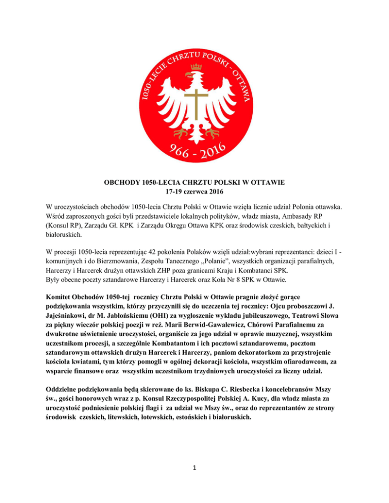 OBCHODY 1050-LECIA CHRZTU POLSKI W OTTAWIE 17-19 czerwca 2016 W uroczystościach obchodów 1050-lecia Chrztu Polski w Ottawie wzięła licznie udział Polonia ottawska. Wśród zaproszonych gości byli przedstawiciele lokalnych polityków, władz miasta, Ambasady RP (Konsul RP), Zarządu Gł. KPK i Zarządu Okręgu Ottawa KPK oraz środowisk czeskich, bałtyckich i białoruskich. W procesji 1050-lecia reprezentując 42 pokolenia Polaków wzięli udział:wybrani reprezentanci: dzieci I komunijnych i do Bierzmowania, Zespołu Tanecznego ,,Polanie”, wszystkich organizacji parafialnych, Harcerzy i Harcerek drużyn ottawskich ZHP poza granicami Kraju i Kombatanci SPK. Były obecne poczty sztandarowe Harcerzy i Harcerek oraz Koła Nr 8 SPK w Ottawie. Komitet Obchodów 1050-tej rocznicy Chrztu Polski w Ottawie pragnie złożyć gorące podziękowania wszystkim, którzy przyczynili się do uczczenia tej rocznicy: Ojcu proboszczowi J. Jajeśniakowi, dr M. Jabłońskiemu (OHI) za wygłoszenie wykładu jubileuszowego, Teatrowi Słowa za piękny wieczór polskiej poezji w reż. Marii Berwid-Gawalewicz, Chórowi Parafialnemu za dwukrotne uświetnienie uroczystości, organiście za jego udział w oprawie muzycznej, wszystkim uczestnikom procesji, a szczególnie Kombatantom i ich pocztowi sztandarowemu, pocztom sztandarowym ottawskich drużyn Harcerek i Harcerzy, paniom dekoratorkom za przystrojenie kościoła kwiatami, tym którzy pomogli w ogólnej dekoracji kościoła, wszystkim ofiarodawcom, za wsparcie finansowe oraz wszystkim uczestnikom trzydniowych uroczystości za liczny udział. Oddzielne podziękowania będą skierowane do ks. Biskupa C. Riesbecka i koncelebransów Mszy św., gości honorowych wraz z p. Konsul Rzeczypospolitej Polskiej A. Kucy, dla władz miasta za uroczystość podniesienie polskiej flagi i za udział we Mszy św., oraz do reprezentantów ze strony środowisk czeskich, litewskich, łotewskich, estońskich i białoruskich. 1 Poniżej podajemy linki do video oraz zdjęć z tych uroczystości: Piątek - 17 czerwca, 12:00 Podniesienie polskiej flagi przed Ratuszem z udziałem Burmistrza Miasta Ottawy, p. Jima Watsona Ottawa City Hall, 110 Laurier Avenue West, Ottawa W uroczystości wzięła również udział p. Aleksandra Kucy, Konsul RP w Ottawie, p. Mary Pitt z mężem, b. Burmistrz m. Nepean oraz przedstawiciele Polonii ottawskiej. https://vimeopro.com/polvideoproduction/1050-lecie-chrztu-polski/video/171234474 http://oskarhaleckiinstitute.blogspot.ca/2016/06/uroczyste-obchody-1050-rocznicy-chrztu_20.html Piątek - 17 czerwca, 19:00 Wykład jubileuszowy: Refleksje na 1050-lecie Chrztu Polski - dr Maciej Jabłoński, Oskar Halecki Institute in Canada Amfiteatr 1124, Saint Paul University, 223 Main Street https://vimeopro.com/polvideoproduction/1050-lecie-chrztu-polski/video/171550521 http://oskarhaleckiinstitute.blogspot.ca/2016/06/wykad-jubileuszowy-refleksje-na-1050.html Sobota - 18 czerwca, po Mszy sw. o godz. 17-tej Program poetycki: Świadectwo wiary - Teatr Słowa im. Mieczysława Kotlarczyka - reż. Maria Berwid-Gawalewicz z udziałem Chóru Parafialnego pod dyr. Urszuli Drozd i Organisty Adama Sztajerowskiego Kościół św. Jacka Odrowąża https://vimeopro.com/polvideoproduction/1050-lecie-chrztu-polski/video/171676956 http://oskarhaleckiinstitute.blogspot.ca/2016/06/swiadectwo-wiary-teatr-sowa-im.html Niedziela - 19 czerwca, 12:30 Uroczysta Msza św. odprawiona przez J.E. Ks. Bp. Sufragana Archidiecezji Ottawskiej, Christiana Riesbecka, C.C. z udziałem zaproszonych gości Kościół św. Jacka Odrowąża https://vimeopro.com/polvideoproduction/1050-lecie-chrztu-polski/video/171853990 http://oskarhaleckiinstitute.blogspot.ca/2016/06/obchody-1050-lecia-chrztu-polski-w.html Osoby, które chciałaby zakupić DVD lub zdjęcia proszone są o skontaktowanie się z Sekretarzem p. Sławomirem Bronowskim, tel. (613) 836-3843. Bóg zapłać wszystkim! Komitet Obchodów 1050-lecia Chrztu Polski w Ottawie 2