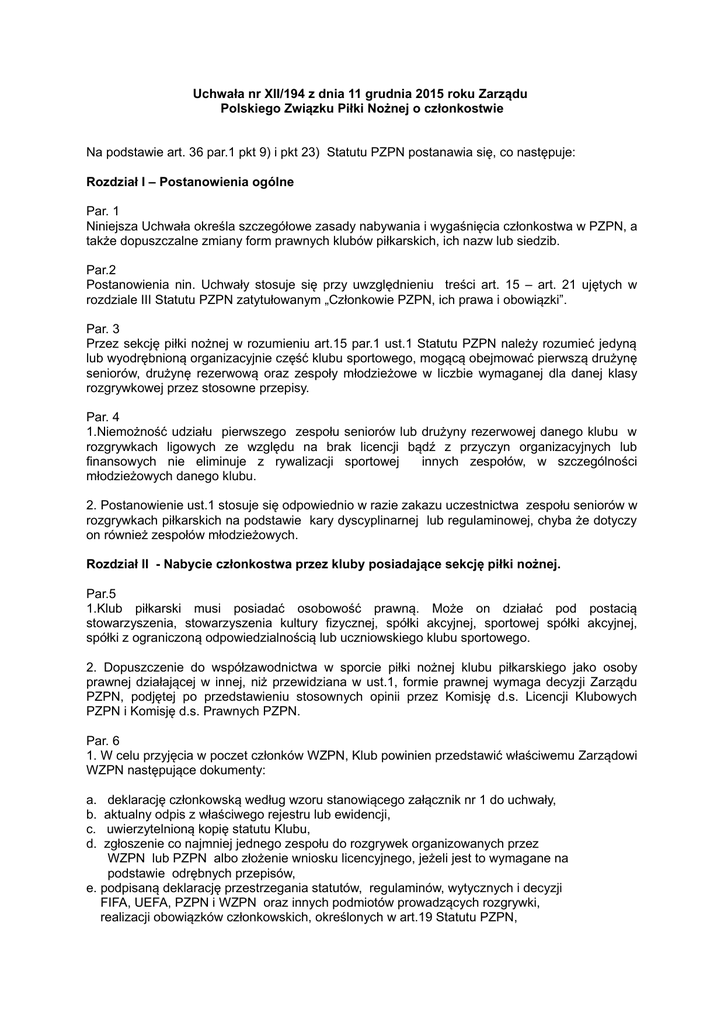 Uchwała nr XII/194 z dnia 11 grudnia 2015 roku Zarządu Polskiego Związku Piłki Nożnej o członkostwie Na podstawie art. 36 par.1 pkt 9) i pkt 23) Statutu PZPN postanawia się, co następuje: Rozdział I – Postanowienia ogólne Par. 1 Niniejsza Uchwała określa szczegółowe zasady nabywania i wygaśnięcia członkostwa w PZPN, a także dopuszczalne zmiany form prawnych klubów piłkarskich, ich nazw lub siedzib. Par.2 Postanowienia nin. Uchwały stosuje się przy uwzględnieniu treści art. 15 – art. 21 ujętych w rozdziale III Statutu PZPN zatytułowanym „Członkowie PZPN, ich prawa i obowiązki”. Par. 3 Przez sekcję piłki nożnej w rozumieniu art.15 par.1 ust.1 Statutu PZPN należy rozumieć jedyną lub wyodrębnioną organizacyjnie część klubu sportowego, mogącą obejmować pierwszą drużynę seniorów, drużynę rezerwową oraz zespoły młodzieżowe w liczbie wymaganej dla danej klasy rozgrywkowej przez stosowne przepisy. Par. 4 1.Niemożność udziału pierwszego zespołu seniorów lub drużyny rezerwowej danego klubu w rozgrywkach ligowych ze względu na brak licencji bądź z przyczyn organizacyjnych lub finansowych nie eliminuje z rywalizacji sportowej innych zespołów, w szczególności młodzieżowych danego klubu. 2. Postanowienie ust.1 stosuje się odpowiednio w razie zakazu uczestnictwa zespołu seniorów w rozgrywkach piłkarskich na podstawie kary dyscyplinarnej lub regulaminowej, chyba że dotyczy on również zespołów młodzieżowych. Rozdział II - Nabycie członkostwa przez kluby posiadające sekcję piłki nożnej. Par.5 1.Klub piłkarski musi posiadać osobowość prawną. Może on działać pod postacią stowarzyszenia, stowarzyszenia kultury fizycznej, spółki akcyjnej, sportowej spółki akcyjnej, spółki z ograniczoną odpowiedzialnością lub uczniowskiego klubu sportowego. 2. Dopuszczenie do współzawodnictwa w sporcie piłki nożnej klubu piłkarskiego jako osoby prawnej działającej w innej, niż przewidziana w ust.1, formie prawnej wymaga decyzji Zarządu PZPN, podjętej po przedstawieniu stosownych opinii przez Komisję d.s. Licencji Klubowych PZPN i Komisję d.s. Prawnych PZPN. Par. 6 1. W celu przyjęcia w poczet członków WZPN, Klub powinien przedstawić właściwemu Zarządowi WZPN następujące dokumenty: a. b. c. d. deklarację członkowską według wzoru stanowiącego załącznik nr 1 do uchwały, aktualny odpis z właściwego rejestru lub ewidencji, uwierzytelnioną kopię statutu Klubu, zgłoszenie co najmniej jednego zespołu do rozgrywek organizowanych przez WZPN lub PZPN albo złożenie wniosku licencyjnego, jeżeli jest to wymagane na podstawie odrębnych przepisów, e. podpisaną deklarację przestrzegania statutów, regulaminów, wytycznych i decyzji FIFA, UEFA, PZPN i WZPN oraz innych podmiotów prowadzących rozgrywki, realizacji obowiązków członkowskich, określonych w art.19 Statutu PZPN, przestrzegania Przepisów Gry w piłkę nożną uchwalanych przez IFAB lub FIFA ( w przypadku piłki halowej ), a także poddania wszelkich sporów z podmiotami podlegającymi jurysdykcji FIFA, UEFA, PZPN, WZPN oraz innych podmiotów prowadzących rozgrywki, organom jurysdykcyjnym tych organizacji oraz CAS - według wzoru stanowiącego załącznik nr 2 do uchwały, f. listę osób fizycznych, upoważnionych do składania oświadczeń woli w imieniu organizacji kandydującej wobec osób trzecich, g. kopię protokołu zebrania założycielskiego lub ostatniego walnego zebrania organizacji kandydującej, zawierającego uchwałę w sprawie przystąpienia do Związku, h. dowody wpłaty składki członkowskiej do PZPN, WZPN oraz innego podmiotu prowadzącego rozgrywki. 2. Właściwym WZPN w rozumieniu ust.1 jest WZPN, na obszarze działania którego położona jest siedziba Klubu wskazana w odpowiednim rejestrze lub ewidencji. 3. Wszelkie uchwały Zarządu WZPN w sprawach nabycia członkostwa przez klub powinny być podjęte na najbliższym posiedzeniu po wpływie wniosku. 4. W przypadku braków w dokumentacji przedstawionej przez Klub, Zarząd WZPN wzywa Klub do uzupełnienia wniosku w terminie do najbliższego posiedzenia Zarządu, nie krótszym niż 7 dni. 5. W przypadku, gdy dokumentacja przedstawiona przez Klub jest kompletna i brak jest przeciwskazań do przyjęcia Klubu w poczet członków wynikających z przepisów szczególnych, Zarząd WZPN podejmuje uchwałę o przyjęciu Klubu w poczet członków. 6. W razie nieuzupełnienia w wyznaczonym terminie braków, o których mowa w ust. 4 lub stwierdzenia przeciwskazań do przyjęcia Klubu w poczet członków wynikających z przepisów szczególnych, Zarząd WZPN podejmuje uchwałę o odmowie przyjęcia Klubu w poczet członków. 7. W terminie 21 dni od otrzymania uchwały, o której mowa w ust. 6, Klub lub rzecznik prawa związkowego WZPN może zaskarżyć ją do walnego zebrania wojewódzkiego związku piłki nożnej, które rozpoznaje skargę na najbliższym zebraniu po jej wniesieniu. 8. W wyjątkowych sytuacjach, uzasadnionych interesem polskiej piłki nożnej, uchwała o której mowa w ust.6, może być zaskarżona do Zarządu PZPN przez Rzecznika Ochrony Prawa Związkowego PZPN w terminie 21 dni od otrzymania wniosku w tej sprawie od władz organizacji kandydującej. W przypadku zmiany powyższej uchwały przez Zarząd PZPN i przyjęcia klubu w poczet członków Związku postępowanie, o którym mowa w ust. 7 ulega umorzeniu. Par.7 1.Przyjęcie Klubu w poczet członków WZPN oznacza jednoczesne nabycie członkostwa przez Klub w PZPN. Odpis uchwały o przyjęciu Klubu w poczet członków, Zarząd WZPN jest zobowiązany przesłać do PZPN w terminie 7 dni od daty podjęcia uchwały. 2. Prawa i obowiązki członka WZPN i PZPN przysługują Klubowi z dniem podjęcia Uchwały o przyjęciu Klubu w poczet członków przez Zarząd WZPN. 3. Zarząd PZPN przedstawia na najbliższym Walnym Zgromadzeniu Delegatów PZPN listę nowo przyjętych Klubów w poczet członków PZPN do 