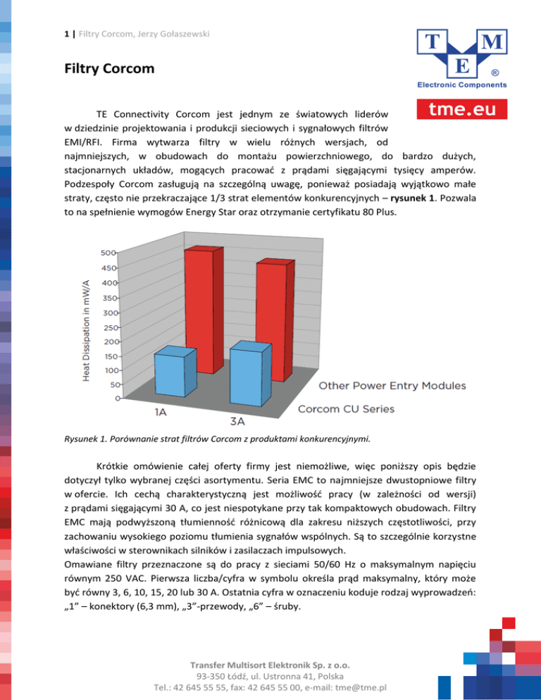 1 | Filtry Corcom, Jerzy Gołaszewski Filtry Corcom TE Connectivity Corcom jest jednym ze światowych liderów w dziedzinie projektowania i produkcji sieciowych i sygnałowych filtrów EMI/RFI. Firma wytwarza filtry w wielu różnych wersjach, od najmniejszych, w obudowach do montażu powierzchniowego, do bardzo dużych, stacjonarnych układów, mogących pracować z prądami sięgającymi tysięcy amperów. Podzespoły Corcom zasługują na szczególną uwagę, ponieważ posiadają wyjątkowo małe straty, często nie przekraczające 1/3 strat elementów konkurencyjnych – rysunek 1. Pozwala to na spełnienie wymogów Energy Star oraz otrzymanie certyfikatu 80 Plus. Rysunek 1. Porównanie strat filtrów Corcom z produktami konkurencyjnymi. Krótkie omówienie całej oferty firmy jest niemożliwe, więc poniższy opis będzie dotyczył tylko wybranej części asortymentu. Seria EMC to najmniejsze dwustopniowe filtry w ofercie. Ich cechą charakterystyczną jest możliwość pracy (w zależności od wersji) z prądami sięgającymi 30 A, co jest niespotykane przy tak kompaktowych obudowach. Filtry EMC mają podwyższoną tłumienność różnicową dla zakresu niższych częstotliwości, przy zachowaniu wysokiego poziomu tłumienia sygnałów wspólnych. Są to szczególnie korzystne właściwości w sterownikach silników i zasilaczach impulsowych. Omawiane filtry przeznaczone są do pracy z sieciami 50/60 Hz o maksymalnym napięciu równym 250 VAC. Pierwsza liczba/cyfra w symbolu określa prąd maksymalny, który może być równy 3, 6, 10, 15, 20 lub 30 A. Ostatnia cyfra w oznaczeniu koduje rodzaj wyprowadzeń: „1” – konektory (6,3 mm), „3”-przewody, „6” – śruby. Transfer Multisort Elektronik Sp. z o.o. 93-350 Łódź, ul. Ustronna 41, Polska Tel.: 42 645 55 55, fax: 42 645 55 00, e-mail: [email protected] 2 | Filtry Corcom, Jerzy Gołaszewski Producent przewiduje pracę filtrów w temperaturach od -10ºC do +40ºC, jednak dopuszczalna jest praca w wyższych temperaturach, do +85ºC. Wymaga to zmniejszenia maksymalnego prądu do wartości określonej wzorem: IO określa maksymalny prąd przy temperaturze otoczenia równej T a, Ir to maksymalny prąd filtra w standardowym zakresie temperatur. Jak już zostało wspomniane filtry serii EMC są dwustopniowe. Posiadają dwa skompensowane prądowo dławiki, dwa kondensatory klasy X i dwa klasy Y oraz rezystory rozładowujące te pojemności. Schemat elektryczny przedstawia rysunek 2. Charakterystyki częstotliwościowe filtrów EMC przedstawia rysunek 3. Widać na nich duże tłumienie sygnałów różnicowych w dolnej części pasma. Rysunek 2. Schemat elektryczny filtrów serii EMC. Rysunek 3. Charakterystyki filtrów serii EMC. Transfer Multisort Elektronik Sp. z o.o. 93-350 Łódź, ul. Ustronna 41, Polska Tel.: 42 645 55 55, fax: 42 645 55 00, e-mail: [email protected] 3 | Filtry Corcom, Jerzy Gołaszewski Dzięki rygorystycznym testom i wnikliwej analizie wyników badań produkty Corcom zdobyły certyfikaty UL, CSA i VDE. TE Connectivity (www.te.com) udostępnia bardzo szczegółowe dane swoich produktów, między innymi praktyczny algorytm doboru odpowiedniego filtra w zależności od zastosowania. Wzorowa dokumentacja techniczna ułatwia pracę projektantów oraz pozwala pominąć etap wykonywania własnych pomiarów, co oszczędza czas i obniża koszty. Szeroki wybór filtrów Corcom, oraz innych podzespołów produkowanych przez TE Connectivity oferuje Transfer Multisort Elektronik (www.tme.eu). Transfer Multisort Elektronik Sp. z o.o. 93-350 Łódź, ul. Ustronna 41, Polska Tel.: 42 645 55 55, fax: 42 645 55 00, e-mail: [email protected]