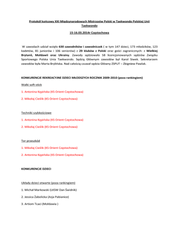 Protokół końcowy XXI Międzynarodowych Mistrzostw Polski w Taekwondo Polskiej Unii Taekwondo 15-16.03.2014r Częstochowa W zawodach udział wzięło 630 zawodników i zawodniczek ( w tym 147 dzieci, 173 młodzików, 123 kadetów, 81 juniorów i 106 seniorów) z 29 klubów z Polski oraz gości zagranicznych: z Wielkiej Brytanii, Mołdawii oraz Ukrainy. Zawody sędziowało 58 licencjonowanych sędziów Związku Sportowego Polska Unia Taekwondo. Sędzią Głównym zawodów był Karol Siwek. Sekretarzem zawodów była Marta Brylińska. Nad całością czuwał sędzia Główny ZSPUT – Zbigniew Pawlak. KONKURENCJE REKREACYJNE DZIECI MŁODSZYCH ROCZNIK 2009-2010 (poza rankingiem) Walki soft-stick 1. Antonina Kępińska (KS Orient Częstochowa) 2. Mikołaj Cieślik (KS Orient Częstochowa) Techniki szybkościowe 1. Antonina Kępińska (KS Orient Częstochowa) 2. Mikołaj Cieślik (KS Orient Częstochowa) Tor przeszkód 1. Mikołaj Cieślik (KS Orient Częstochowa) 2. Antonina Kępińska (KS Orient Częstochowa) KONKURENCJE DZIECI Układy dzieci otwarte (poza rankingiem) 1. Michał Markowski (LKSW Dan Świdnik) 2. Jessica Żabolicka (Azja Pabianice) 3. Artiom Tcaci (Mołdawia ) Układy tradycyjne dzieci rocznik 2008 (poza rankingiem) 1. Milena Wietrzyk (Enso Krapkowice) Układy tradycyjne dzieci rocznik 2007 1. Weronika Borkowska (Gryf Świdnica) 2. Franciszek Krupnik (Opolski Klub Taekwondo) poza rankingiem 3. Julia Śmiałkowska (Azja Pabianice) poza rankingiem Układy tradycyjne dzieci rocznik 2006 1. Kacper Śmiałkowski (Azja Pabianice) 2. Monika Pyryt (Enso Krapkowice) 3. Mateusz Jaskuła (KS Orient Częstochowa) Układy tradycyjne dzieci 2005 rocznik 10-8 cup 1. Artiom Tcaci (Mołdawia) 2. Jakub Bajorek (Enso Krapkowice) 3. Piotr Klimek (LKSW Dan Świdnik) Układy tradycyjne dzieci rocznik 2005 7 cup i wyżej 1. Jessica Żabolicka (Azja Pabianice) 2. Lena Maniak (Tiger Dzierżoniów) 3. Wiktoria Czerwińska (Tiger Dzierżoniów) Techniki szybkościowe dzieci rocznik 2008 1. Szymon Włosek (KS Orient Częstochowa) 2. Jan Magdziarz (KS Orient Częstochowa) 3. Weronika Zawalska (KS Orient Częstochowa) Techniki szybkościowe dzieci rocznik 2007 10 cup 1. Weronika Borkowska (Gryf Świdnica) 2. Wojciech Bar (Krakowskie Centrum Taekwondo) 3. Marcel Sobota (Kick Boxing Małpka Zawiercie) Techniki szybkościowe dzieci 2007 rocznik 9 cup i wyżej 1. Kacper Lasa (KS Orient Częstochowa) 2. Natalia Stępień (KS Orient Częstochowa) 3. Oliwier Namysło (Tiger Dzierżoniów) Techniki szybkościowe dzieci rocznik 2006 dziewczęta 1. Zuzanna Dulik (Opolski Klub Taekwondo) 2. Natalia Zawalska (KS Orient Częstochowa) 3. Emilia Kozioł (KS Orient Częstochowa) Techniki szybkościowe dzieci rocznik 2006 chłopcy 10-9 cup 1. Marcin Kokott (Opolski Klub Taekwondo) 2. Kacper Organiściak (Keiko Jastrzębie Zdrój) 3. Bartosz Kozioł (KS Orient Częstochowa) Techniki szybkościowe dzieci rocznik 2006 chłopcy 8 cup i wyżej 1. Adrian Piwnik (Tiger Dzierżoniów) 2. Szymon Guzowski (Opolski Klub Taekwondo) 3. Natan Ceglarek (Keiko Jastrzębie Zdrój) Techniki szybkościowe dzieci rocznik 2005 dziewczęta 1. Lena Maniak (Tiger Dzierżoniów) 2. Jessica Żabolicka (Azja Pabianice) 3. Wiktoria Czerwińska (Tiger Dzierżoniów) Techniki szybkościowe dzieci rocznik 2005 chłopcy 10-9 cup 1. Eryk Dzedzej (Opolski Klub Taekwondo) 2. Tymoteusz Rduch (Keiko Jastrzębie Zdrój) 3. Aleksander Gruszka (Keiko Jastrzębie Zdrój) Techniki szybkościowe dzieci rocznik 2005 chłopcy 8 cup 1. Michał Markowski (LKSW Dan Świdnik) 2. Artiom Tcaci (Mołdawia) 3. Szymon Oblaciński (Krakowskie Centrum Taekwondo) Techniki szybkościowe dzieci rocznik 2005 chłopcy 7 cup i wyżej 1. Jacek Nielipiński (Krakowskie Centrum Taekwondo) 2. Maciej Czajkowski (Opolski Klub Taekwondo) 3. Oliwier Łągiewka (Kick Boxing Małpka Zawiercie) Techniki specjalne dzieci rocznik 2008 1. Szymon Włosek (KS Orient Częstochowa) 2. Maja Michalik (KS Orient Częstochowa) 3. Miłosz Łągiewka (Kick Boxing Małpka Zawiercie) Techniki specjalne dzieci 2007 rocznik 10 cup 1. Marcel Słowikowski (Kick Boxing Małpka Zawiercie) 2. Weronika Borkowska (Gryf Świdnica) 3. Eryk Szczypiór (KS Orient Częstochowa) Techniki specjalne dzieci rocznik 2007 9 cup i wyżej 1. Aleks Maniak (Tiger Dzierżoniów) 2. Kacper Lasa (KS Orient Częstochowa) 3. Szymon Rąpała (Tiger Dzierżoniów) Techniki specjalne dzieci rocznik 2006 dziewczęta 1. Zuzanna Dulik (Opolski Klub Taekwondo) 2. Natalia Zawalska (KS Orient Częstochowa) 3. Wiktoria Zasuń (KS Orient Częstochowa) Techniki specjalne dzieci rocznik 2006 chłopcy 10-9 cup 1. Wiktor Krawczyk (KS Orient Częstochowa) 2. Adrian Ziemianin (Keiko Jastrzębie Zdrój) 3. Kacper Organiściak (Keiko Jastrzębie Zdrój) Techniki specjalne dzieci rocznik 2006 chłopcy 8 cup i wyżej 1. Natan Ceglarek (Keiko Jastrzębie Zdrój) 2. Mateusz Jaskuła (KS Orient Częstochowa) 3. Adrian Piwnik (Tiger Dzierżoniów) Techniki specjalne dzieci rocznik 2005 dziewczęta 1. Magdalena Kałużna (Tiger Dzierżoniów) 2. Lena Maniak (Tiger Dzierżoniów) 3. Wiktoria Czerwińska (Tiger Dzierżoniów) Techniki specjalne dzieci rocznik 2005 chłopcy 10-9 cup 1. Tymoteusz Rduch (Keiko Jastrzębie Zdrój) 2. Kacper Ząbkowski (KS Orient Częstochowa) 3. Aleksander Gruszka (Keiko Jastrzębie Zdrój) Techniki specjalne dzieci rocznik 2005 chłopcy 8 cup 1. Artiom Tcaci (Mołdawia) 2. Michał Markowski (LKSW Dan Świdnik) 3. Krzysztof Duliniec (Opolski Klub Taekwondo) Techniki specjalne dzieci rocznik 2005 chłopcy 7 cup i wyżej 1. Jacek Kołakowski (Opolski Klub Taekwondo) 2. Maciej Czajkowski (Opolski Klub Taekwondo) 3. Oliwier Łągiewka (Kick Boxing Małpka Zawiercie) Walki soft-stick dzieci rocznik 2008 1. Maciej Dąbrowski (LKSW Dan Świdnik) 2. Marek Krynke (Krakowskie Centrum Taekwondo) 3. Jan Magdziarz (KS Orient Częstochowa) Walki soft-stick dzieci rocznik 2007 10 cup 1. Patryk Grzanka (KS Orient Częstochowa) 2. Eryk Szczypiór (K