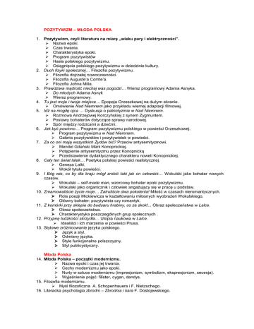 POZYTYWIZM – MŁODA POLSKA 1. Pozytywizm, czyli literatura na miarę „wieku pary i elektryczności”. Nazwa epoki. Czas trwania. Charakterystyka epoki. Program pozytywistów Hasła polskiego pozytywizmu. Osiągnięcia polskiego pozytywizmu w dziedzinie kultury. 2. Duch fizyki społecznej… Filozofia pozytywizmu. Filozofia dojrzałej nowoczesności. Filozofia Auguste’a Comte’a. Filozofia Johna Milla. 3. Prawdziwa mądrość niechaj was pogodzi… Wiersz programowy Adama Asnyka. Do młodych Adama Asnyk Wiersz programowy. 4. Tu jest moje i twoje miejsce… Epopeja Orzeszkowej na dużym ekranie. Omówienie Nad Niemnem jako przykładu wiernej adaptacji filmowej. 5. Idź na mogiłę ojca … Dyskusja o patriotyzmie w Nad Niemnem. Rozmowa Andrzejowej Korczyńskiej z synem Zygmuntem. Postawy bohaterów dotyczące sprawy narodowej. Spór między rodzicami a dziećmi. 6. Jak być powinno… Program pozytywizmu polskiego w powieści Orzeszkowej. Program pozytywizmu w Nad Niemnem. Galeria pozytywistów i pozytywistek w powieści. 7. Za co oni mają wszystkich Żydów bić? Przeciw antysemityzmowi. Mendel Gdański Marii Konopnickiej. Potępienie antysemityzmu przez Konopnicką Przedstawienie dydaktycznego charakteru noweli Konopnickiej. 8. Cały ten świat lalek… Poetyka polskiej powieści realistycznej. Geneza Lalki. Wokół tytułu powieści. 9. I Bóg wie, co by dla kraju mógł zrobić taki jak on człowiek… Wokulski jako bohater nowych czasów. Wokulski – self-made man, wzorcowy bohater epoki pozytywizmu. Wokulski jako organicznik i człowiek angażujący się w pracę u podstaw. 10. Zmarnowaliście życie moje… Zatruliście dwa pokolenia! Miłość w czasach nieromantycznych. Rola poezji Mickiewicza w kształtowaniu miłosnych wyobrażeń Wokulskiego. Główny bohater: pozytywista czy romantyk. 11. Z komórki przy sklepie do buduaru hrabiny, co za skok!... Obraz społeczeństwa w Lalce. Obraz społeczeństwa. Charakterystyka poszczególnych grup społecznych . 12. Przypnę ludzkości skrzydła… Utopia naukowa w Lalce. Idealiści i ich marzenia w powieści Prusa. 13. Stylowe zróżnicowanie języka polskiego. Język a styl. Odmiany języka. Style funkcjonalne polszczyzny. Styl publicystyczny. Młoda Polska 14. Młoda Polska – początki modernizmu. Nazwa epoki i czas jej trwania. Cechy modernizmu jako epoki. Nurty w sztuce modernizmu (impresjonizm, symbolizm, ekspresjonizm, secesja). Wyjaśnienie pojęć: filister, cygan, dandys. 15. Filozofia modernizmu. Myśl filozoficzna A. Schopenhauera i F. Nietzschego. 16. Literacka psychologia zbrodni – Zbrodnia i kara F. Dostojewskiego. Charakterystyka głównych bohaterów powieści F. Dostojewskiego -postawy wobec życia i wiary. Problem winy i kary w powieści- wskazanie motywów zbrodni głównego bohatera. Dekadentyzm w poezji Młodej Polski – Koniec wieku XIX K. Przerwy-Tetmajera Określenie postaw i przekonań wymienionych w liryku. Udowodnienie, że utwór jest manifestem dekadentyzmu. Poezja miłosna wczoraj i dziś. K. Przerwa-Tetmajer Lubię, kiedy kobieta. Nowy sposób postrzegania kobiety przez mężczyznę. A. Świrszczyńska Rozczarowana i szczęśliwa. Impresjonizm w malarstwie i w poezji. C. Monet Impresja. Wschód słońca - cechy malarstwa impresjonistycznego K. Przerwa-Tetmajer Melodia mgieł nocnych- cechy impresjonizmu w poezji; wskazanie środków artystycznych tworzących impresjonistyczny obraz Ludzie bezdomni S. Żeromskiego. Wybory moralne bohaterów powieści S. Żeromskiego Charakterystyka Tomasza Judyma. Ocena głównego bohatera powieści S. Żeromskiego. Idea domu i bezdomności w powieści S. Żeromskiego. Symbole w powieści Żeromskiego i ich rola. Sposoby tworzenia nastroju w poezji młodopolskiej - L. Staff Deszcz jesienny Środki poetyckie służące budowaniu nastroju. Refleksja o egzystencji człowieka. Wesele S. Wyspiańskiego. Relacje między inteligencją a ludem w dramacie. Symbolika w utworze i jej znaczenie dla wymowy ideowej dramatu. Obraz wsi polskiej w dramacie. Wyjaśnienie pojęcia chłopomanii. Adaptacja filmowa dramatu Wyspiańskiego w reż. A.Wajdy (rola muzyki, scenografii i zmieniającego się montażu filmowego) Chłopi W.S. Reymonta- tom 1. Naturalistyczna koncepcja życia w powieści. Obraz stosunków międzyludzkich w powieści Reymonta. Portrety kobiet. Wyjaśnienie pojęcia stylizacji gwarowej w odwołaniu do tekstu Reymonta. Dialektyzacja w literaturze. Wyjaśnienie pojęć: stylizacja środowiskowa, slang, żargon i gwara. Przykłady charakterystyczne dla współczesnej gwary młodzieżowej. J. Conrad jako świadek epoki kolonialnej – Jądro ciemności Obraz XIX-wiecznego kolonializmu w utworze. Kurtz jako bohater, który zatracił swoje wartości moralne. Ocena postawy bohatera. Czas Apokalipsy Coppoli – filmowa próba interpretacji tekstu J. Conrada. Wyjaśnienie tytułu filmu. Rola muzyki w filmie. Wizualne środki tworzące obraz nowoczesnej wojny. 17. 18. 19. 20. 21. 22. 23. 24. 25. 26.