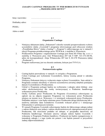 ZASADY CASTINGU PROGRAMU TV POD ROBOCZYM TYTUŁEM „ PRZEDŚLUBNE BITWY” Imię i nazwisko: …………………………………… Dokładny adres: …………………………………… PESEL: …………………………………… Adres e-mail: …………………………………… §1 Organizator Castingu 1. 2. 3. Niniejszy dokument (dalej „Dokument”) określa warunki przeprowadzenia wyboru uczestników (dalej „Uczestnik”) programu telewizyjnego pod roboczym tytułem „Przedślubne Bitwy” (dalej „Casting” i „Program”), odbywającego się w ramach I edycji Programu produkowanego przez TVN S.A. z siedzibą w Warszawie. Producentem Programu i organizatorem Castingu jest firma B3 Films Sp. z.o.o. z siedzibą w Warszawie przy Alei Wilanowskiej 287 lok 9 NIP: 521-372-40-94, adres do korespondencji: Aleja Wilanowska 287 lok 9, 02-270 Warszawa (dalej „Producent”). Program realizowany jest na zlecenie emitenta, którym jest TVN S.A. §2 Postanowienia ogólne 1. 2. 3. 4. 5. 6. Casting będzie prowadzony w ramach i w związku z Programem. Celem Castingu jest wyłonienie Uczestników, którzy wezmą udział w odcinku Programu. Niniejszy Dokument dotyczy wyłącznie etapu wyboru Uczestników. Sam udział w Programie zostanie określony w umowie uczestnictwa zawartej odrębnie pomiędzy danym Uczestnikiem a Producentem. Udział w Programie polegać będzie na wybieraniu i zakupie sukni ślubnej oraz sukni okolicznościowej dla osoby towarzyszącej u Podmiotu handlowego wskazanym przez Producenta. Osoby wybrane przez Producenta do Programu (Uczestnicy) zobowiązane są zgłosić się na zdjęcia (nagranie Programu) we wskazanym przez Producenta miejscu na terenie m.st. Warszawy i w terminach wskazanych przez Producenta. Dokładne miejsca i czas będą wskazane przez Producenta drogą telefoniczną lub emailową (aktualne dane kontaktowe Uczestnik wskazał przed § 1 niniejszego Dokumentu) w późniejszym terminie. W ramach Programu Uczestnik zobowiązany będzie do faktycznego zakupu jednej z sukien ślubnych oraz jednej z sukien okolicznościowych zaproponowanych przez Producenta, lub uiszczenia podatku od zakupu, w przypadku darowizny od Podmiotu handlowego. Stronami umowy zakupu sukien będzie Uczestnik i wskazany w Programie Podmiot handlowy. Producent nie będzie zaangażowany w transakcję zakupu i z tego tytułu nie ponosi i nie będzie ponosił w przyszłości żadnej odpowiedzialności. Strona 1 z 3 ZASADY CASTINGU PROGRAMU TV POD ROBOCZYM TYTUŁEM „ PRZEDŚLUBNE BITWY” Z tytułu udziału w Programie Uczestnik będzie uprawniony do uzyskania rabatu od ceny sukien o których mowa w ust. 6. Rabat udzielony będzie bezpośrednio przez Podmiot handlowy, o którym mowa w ust. 6, przy czym udzielony on będzie wyłącznie w przypadku zawarcia umowy dotyczącej zakupu sukien w trakcie zdjęć do Programu. Rabat nie będzie przysługiwać Uczestnikowi jeśli Podmiot handlowy przekaże suknię w ramach darowizny. Rabat nie będzie również przysługiwać w przypadku, gdy Uczestnik będzie kupował suknie w innym czasie, tj. w szczególności po zakończeniu dni zdjęciowych do Programu z udziałem Uczestnika. Wysokość rabatu uzależniona będzie od ceny danego asortymentu. W ramach udziału w Programie Uczestnik zobowiązuje się przenieść na Producenta pełne autorskie prawa majątkowe do swojego wizerunku utrwalonego w Programie oraz ewentualnego artystycznego wykonania utrwalonego w Programie, a także zdjęć lub filmów dostarczonych przez Uczestnika Producentowi, obrazujących historię związku narzeczeńskiego oraz relacji rodzinnych Uczestnika – bez ograniczeń czasowych ani terytorialnych. Przeniesienie dotyczyć będzie również wykorzystania dla celów promocji i reklamy Programu, Producenta i emitenta Programu. Z tytułu uczestnictwa w Castingu i w Programie Uczestnik nie ma prawa do żadnego wynagrodzenia, jak również prawa do zwrotu jakichkolwiek kosztów poniesionych w związku z uczestniczeniem w Castingu lub w Programie. Przystąpienie do Castingu jest dobrowolne i jest jednoznaczne z zaakceptowaniem niniejszego Dokument w całości. 7. 8. 9. 10. §3 Uczestnicy Castingu 1. a) b) c) d) e) f) 2. a) b) c) d) 3. Uczestnikami Castingu mogą być tylko osoby, które: są pełnoletnie, posiadają pełną zdolność do czynności prawnych, zapoznały się szczegółowo z Dokumentem i akceptują ten Dokument, zostały zaproszone do Castingu przez Producenta, przedstawią na Castingu pisemną zgodę osoby towarzyszącej, która to zgoda stanowi załącznik do Dokumentu. przedstawiają na Castingu pisemną zgodę swojego partnera życiowego/narzeczonego, która to zgoda stanowi załącznik do Dokumentu. Uczestnicy, którzy zostaną wybrani do udziału w Programie, w szczególności zobowiązani będą do: pozostawania w trzeźwości (zarówno od alkoholu, jak i innych środków odrzucających) przez cały czas trwania Castingu, wszelkich prób związanych z Castingiem oraz nagrań i zdjęć związanych z nagraniem Programu i jego promocji, uczestniczenia w nagraniach Programu, w tym w zdjęciach i wywiadach, jeśli zostaną wybrani do Programu oraz zaakceptują jego regulamin, nieużywania podczas Castingów i zdjęć związanych z nagraniem Programu słów powszechnie uważanych za obraźliwe, niereklamowania bez zgody Producenta żadnych produktów, usług, podmiotów itp. w okresie trwania Castingów, produkcji i premierowej emisji Programu. Producent nie jest zobowiązany do podawania powodów podjęcia decyzji o wyborze Uczestników lub odrzuceniu zgłoszeń do Castingu oraz Programu. Strona 2 z 3 ZASADY CASTINGU PROGRAMU TV POD ROBOCZYM TYTUŁEM „ PRZEDŚLUBNE BITWY” §4 Postanowienia końcowe 1. 2. 3. 4. 5. 6. 7. Administratorem danych uczestników castingu jest Producent. Dane te będą wykorzystywane zgodnie z ustawą z 29 sierpnia 1997 r. o ochronie danych osobowych (Dz.U. z 2002 r. nr 101, poz. 926 z późn. zm.) w celu pr