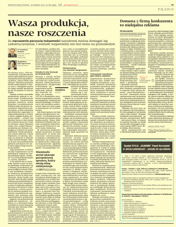 Dziennik Gazeta Prawna, 26 sierpnia 2013 nr 164 (3554) B9 gazetaprawna.pl p r aw o Wasza produkcja, nasze roszczenia Domena z firmą konkurenta to nielojalna reklama Orzeczenie Za naruszenie poczucia tożsamości narodowej można domagać się zadośćuczynienia. I wolność wypowiedzi nie stoi temu na przeszkodzie Dr Arkadiusz Radwan adwokat, prezes Instytutu Allerhanda Magdalena Jabczuga-Kurek radca prawny W czerwcu 2013 r. tVP wyemitowała trzyodcinkowy serial wyprodukowany przez niemiecką telewizję publiczną ZDF pt. „nasze matki, nasi ojcowie”. Światowa premiera serialu miała miejsce w marcu 2013 r. następnie prawa do niego zostały sprzedane do ok. 60 państw, w tym do Polski. Emisja serialu wywołała gwałtowną reakcję w naszym kraju. Producentom zarzucono szkalowanie pamięci żołnierzy armii krajowej i przedstawienie Polaków jako skrajnych antysemitów. Wskazywano jednocześnie, że film umniejsza rolę niemców, sugerując, że odpowiedzialność za wojnę, a także zagładę Żydów, ponoszą naziści – „zwykli” zaś niemcy biorą w niej udział dla ocalenia ojczyzny i sami są również często ofiarami wojny. owi „zwykli niemcy” przyjaźnią się z Żydami i pomagają w ocaleniu ich przed nazistami. Serial przedstawia zatem dobrych i złych niemców. Co istotne, ukazuje on również w dobrym i złym świetle Rosjan. Polacy są tam zaś przedstawieni głównie pod kątem ich niezwykle negatywnego stosunku do Żydów. Falę protestów w Polsce można rozpatrywać na tle podobnych reakcji po emisji polskiego filmu „Pokłosie” czy też publikacji książki J.t. J. J.t t.. Grossa „Sąsiedzi”. t o ile jednak oba te materiały można uznać za próbę polskiego rozliczenia się z własną przeszłością poprzez podjęcie tematu winy, o tyle produkcja niemiecka dostarcza perspektywy sprawcy, który tę winę relatywizuje. „nasze matki, nasi ojcowie” jawi się jako środek realizacji pewnej polityki historycznej, która uwspólnia, a przez to podważa niemiecką winę za zbrodnie ii wojny światowej, a nawet prowadzi do pewnej gradacji motywów: antysemityzm niemiecki jest ukazany jako antysemityzm polityczny – odgórny, zaś antysemityzm polski jest organiczny – oddolny, co w percepcji widza wywoływać może silniejszą niechęć pod adresem Polaków niż niemców. Zagadnienie prawnej odpowiedzialności za przekaz medialny w kontekście czci narodu pojawiało się dotąd najczęściej przy okazji używania przez media zachod- nie określenia „polskie obozy śmieci” bądź podobnych określeń sugerujących polską winę za Holocaust. mimo zapowiedzi reakcji prawnej przez polski rząd, nie podjęto jednak żadnych kroków zmierzających do pociągnięcia do odpowiedzialności autorów takich bądź podobnych określeń. Sztuka to nie licencja na bezkarność nia z niej, w szczególności poprzez naruszanie godności i czci innych osób. EtPC wskazuje zaś, że od dzieła należy wymagać unikania wypowiedzi, które bez powodu są obraźliwe dla innych (por. ww. wyrok w sprawie otto-Preminger-institute). Niestosowne czy również bezprawne opisana powyżej linia orzecznicza ma szczególne Decyzja o emisji serialu znaczenie w odniesieniu do w polskiej telewizji publicz- utworów literackich czy filnej stała się z kolei przed- mowych, które opowiadając miotem zainteresowania o losach fikcyjnych bohateprokuratora okręgowego rów, odwołują się do praww Warszawie – podziwych wydarzeń stępowanie karne i ludzi. W filmie dotyczyło jednak Analiza fikcja literacka nie twórców se- DGP miesza się z rzeczywistymi wydarialu, ale prezesa tVP Sa w kontekście moż- rzeniami ii wojny światowej. liwości popełnienia przezeń mimo że w serialu brak przestępstwa znieważenia jest bezpośredniej wyponarodu polskiego. W niem- wiedzi wskazującej na auczech zaś tamtejsza proku- tentyczność głównych boharatura bada ten sam wątek terów, twórcy filmu zadbali w odniesieniu do twórców o silny przekaz sugerujący serialu. reprezentatywność propoJak dotąd sprawa nie była nowanej przez nich narracji. jednak przedmiotem rozŚrodkami wzmocnienia ważań cywilnoprawnych tego przekazu są m.in. pojaw sprawie naruszenia przez wiające się na ekranie po zaproducentów filmu dóbr kończeniu trzeciego odcinka osobistych Polaków jako na- serialu napisy z imionami rodu szczególnie skrzywdzo- głównych bohaterów oraz nego przez niemców w cza- datami ich urodzin i śmiersie ii wojny światowej. ci – element zarezerwowany W pierwszej kolejności dla materiałów dokumennależy zaznaczyć, że sama talnych bądź opartych na okoliczność, iż serial jest faktach. Również dobrany przez utworem artystycznym, w dodatku o charakterze fa- twórców serialu tytuł bularnym, nie stanowi per wzmacnia wrażenie uogólse okoliczności wyłączają- nienia, czy nawet pewnej cej bezprawność. Zgodnie obiektywizacji poprzez odz orzecznictwem polskich wołanie się do całej genesądów i Europejskiego try- racji poprzedzającej współczesne pokolenie niemców. Dobitnym potwierdzeniem Niemiecki tej narracji jest angielska serial ukazuje wersja tytułu: „Generation War”. Położenie przez perspektywę twórców filmu nacisku na sprawcy, który przekaz generalizujący, pretendujący do miana represwoją winę zentatywnego, jest esencjalrelatywizuje ne dla oceny bezprawności zawartej w filmie wypowiedzi o Polakach. konsebunału Praw Człowieka wol- kwencją takiej narracji jest ność artystyczna nie ma obezwładnienie ewentualcharakteru absolutnego i sa- nego argumentu, że osoby modzielnie nie uchyla bez- i wydarzenia przedstawione prawności twórcy narusza- w filmie rzeczywiście miały jącego dobra osobiste (por. bądź mogły mieć miejsce. wyrok Sn z 2 lutego 2011 r., nawet jeśli można wskasygn. akt ii CSk k 431/10, a tak tak-- zać na udokumentowane że wyrok EtPC z 25 listopada przykłady dobrych niemców 1996 r. w sprawie otto-Pre- i s