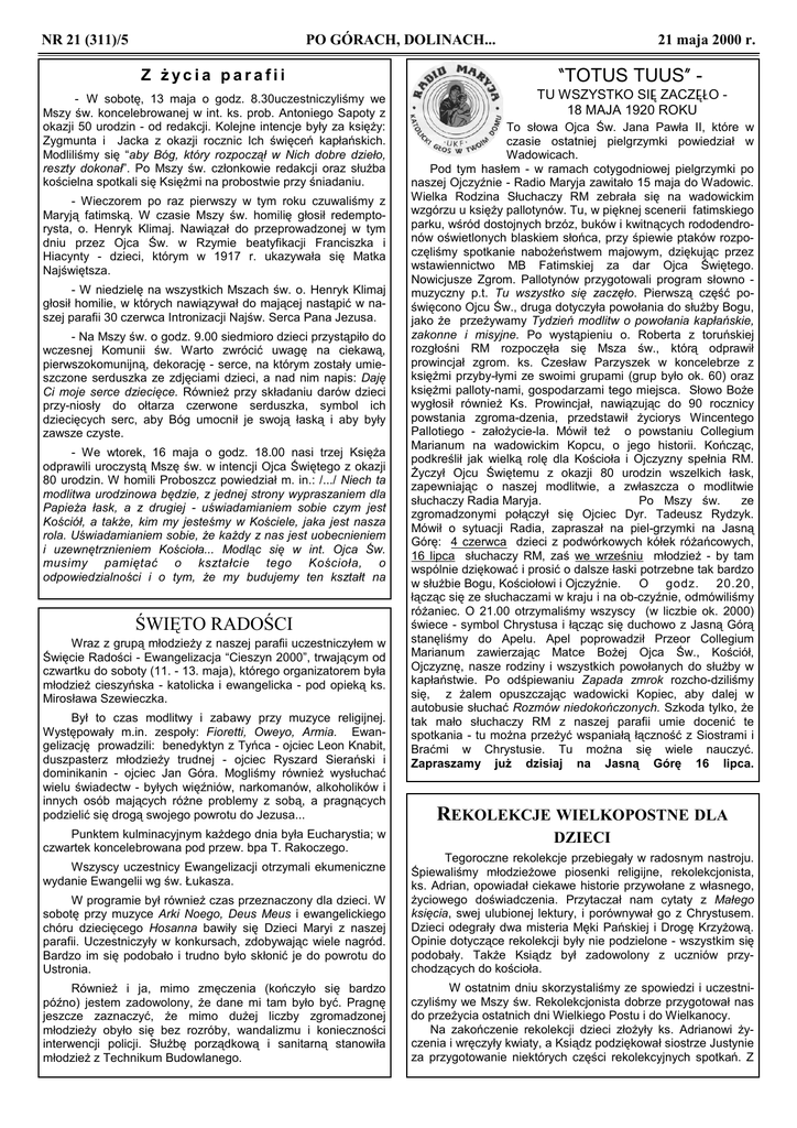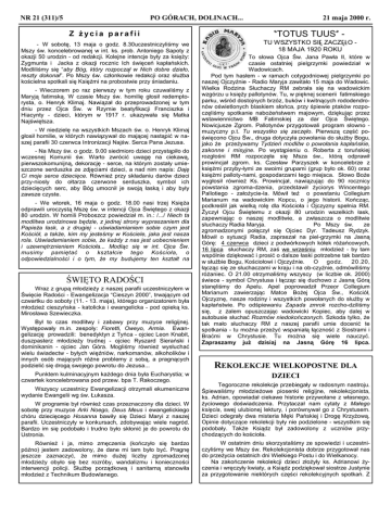 NR 21 (311)/5 PO GÓRACH, DOLINACH... 21 maja 2000 r. Z Ŝycia parafii “TOTUS TUUS” - - W sobotę, 13 maja o godz. 8.30uczestniczyliśmy we Mszy św. koncelebrowanej w int. ks. prob. Antoniego Sapoty z okazji 50 urodzin - od redakcji. Kolejne intencje były za księŜy: Zygmunta i Jacka z okazji rocznic Ich święceń kapłańskich. Modliliśmy się “aby Bóg, który rozpoczął w Nich dobre dzieło, reszty dokonał”. Po Mszy św. członkowie redakcji oraz słuŜba kościelna spotkali się KsięŜmi na probostwie przy śniadaniu. TU WSZYSTKO SIĘ ZACZĘŁO 18 MAJA 1920 ROKU - Wieczorem po raz pierwszy w tym roku czuwaliśmy z Maryją fatimską. W czasie Mszy św. homilię głosił redemptorysta, o. Henryk Klimaj. Nawiązał do przeprowadzonej w tym dniu przez Ojca Św. w Rzymie beatyfikacji Franciszka i Hiacynty - dzieci, którym w 1917 r. ukazywała się Matka Najświętsza. - W niedzielę na wszystkich Mszach św. o. Henryk Klimaj głosił homilie, w których nawiązywał do mającej nastąpić w naszej parafii 30 czerwca Intronizacji Najśw. Serca Pana Jezusa. - Na Mszy św. o godz. 9.00 siedmioro dzieci przystąpiło do wczesnej Komunii św. Warto zwrócić uwagę na ciekawą, pierwszokomunijną, dekorację - serce, na którym zostały umieszczone serduszka ze zdjęciami dzieci, a nad nim napis: Daję Ci moje serce dziecięce. RównieŜ przy składaniu darów dzieci przy-niosły do ołtarza czerwone serduszka, symbol ich dziecięcych serc, aby Bóg umocnił je swoją łaską i aby były zawsze czyste. - We wtorek, 16 maja o godz. 18.00 nasi trzej KsięŜa odprawili uroczystą Mszę św. w intencji Ojca Świętego z okazji 80 urodzin. W homili Proboszcz powiedział m. in.: /.../ Niech ta modlitwa urodzinowa będzie, z jednej strony wypraszaniem dla PapieŜa łask, a z drugiej - uświadamianiem sobie czym jest Kościół, a takŜe, kim my jesteśmy w Kościele, jaka jest nasza rola. Uświadamianiem sobie, Ŝe kaŜdy z nas jest uobecnieniem i uzewnętrznieniem Kościoła... Modląc się w int. Ojca Św. musimy pamiętać o kształcie tego Kościoła, o odpowiedzialności i o tym, Ŝe my budujemy ten kształt na ŚWIĘTO RADOŚCI Wraz z grupą młodzieŜy z naszej parafii uczestniczyłem w Święcie Radości - Ewangelizacja “Cieszyn 2000”, trwającym od czwartku do soboty (11. - 13. maja), którego organizatorem była młodzieŜ cieszyńska - katolicka i ewangelicka - pod opieką ks. Mirosława Szewieczka. Był to czas modlitwy i zabawy przy muzyce religijnej. Występowały m.in. zespoły: Fioretti, Oweyo, Armia. Ewangelizację prowadzili: benedyktyn z Tyńca - ojciec Leon Knabit, duszpasterz młodzieŜy trudnej - ojciec Ryszard Sierański i dominikanin - ojciec Jan Góra. Mogliśmy równieŜ wysłuchać wielu świadectw - byłych więźniów, narkomanów, alkoholików i innych osób mających róŜne problemy z sobą, a pragnących podzielić się drogą swojego powrotu do Jezusa... Punktem kulminacyjnym kaŜdego dnia była Eucharystia; w czwartek koncelebrowana pod przew. bpa T. Rakoczego. To słowa Ojca Św. Jana Pawła II, które w czasie ostatniej pielgrzymki powiedział w Wadowicach. Pod tym hasłem - w ramach cotygodniowej pielgrzymki po naszej Ojczyźnie - Radio Maryja zawitało 15 maja do Wadowic. Wielka Rodzina Słuchaczy RM zebrała się na wadowickim wzgórzu u księŜy pallotynów. Tu, w pięknej scenerii fatimskiego parku, wśród dostojnych brzóz, buków i kwitnących rododendronów oświetlonych blaskiem słońca, przy śpiewie ptaków rozpoczęliśmy spotkanie naboŜeństwem majowym, dziękując przez wstawiennictwo MB Fatimskiej za dar Ojca Świętego. Nowicjusze Zgrom. Pallotynów przygotowali program słowno muzyczny p.t. Tu wszystko się zaczęło. Pierwszą część poświęcono Ojcu Św., druga dotyczyła powołania do słuŜby Bogu, jako Ŝe przeŜywamy Tydzień modlitw o powołania kapłańskie, zakonne i misyjne. Po wystąpieniu o. Roberta z toruńskiej rozgłośni RM rozpoczęła się Msza św., którą odprawił prowincjał zgrom. ks. Czesław Parzyszek w koncelebrze z księŜmi przyby-łymi ze swoimi grupami (grup było ok. 60) oraz księŜmi palloty-nami, gospodarzami tego miejsca. Słowo BoŜe wygłosił równieŜ Ks. Prowincjał, nawiązując do 90 rocznicy powstania zgroma-dzenia, przedstawił Ŝyciorys Wincentego Pallotiego - załoŜycie-la. Mówił teŜ o powstaniu Collegium Marianum na wadowickim Kopcu, o jego historii. Kończąc, podkreślił jak wielką rolę dla Kościoła i Ojczyzny spełnia RM. śyczył Ojcu Świętemu z okazji 80 urodzin wszelkich łask, zapewniając o naszej modlitwie, a zwłaszcza o modlitwie słuchaczy Radia Maryja. Po Mszy św. ze zgromadzonymi połączył się Ojciec Dyr. Tadeusz Rydzyk. Mówił o sytuacji Radia, zapraszał na piel-grzymki na Jasną Górę: 4 czerwca dzieci z podwórkowych kółek róŜańcowych, 16 lipca słuchaczy RM, zaś we wrześniu młodzieŜ - by tam wspólnie dziękować i prosić o dalsze łaski potrzebne tak bardzo w słuŜbie Bogu, Kościołowi i Ojczyźnie. O godz. 20.20, łącząc się ze słuchaczami w kraju i na ob-czyźnie, odmówiliśmy róŜaniec. O 21.00 otrzymaliśmy wszyscy (w liczbie ok. 2000) świece - symbol Chrystusa i łącząc się duchowo z Jasną Górą stanęliśmy do Apelu. Apel poprowadził Przeor Collegium Marianum zawierzając Matce BoŜej Ojca Św., Kościół, Ojczyznę, nasze rodziny i wszystkich powołanych do słuŜby w kapłaństwie. Po odśpiewaniu Zapada zmrok rozcho-dziliśmy się, z Ŝalem opuszczając wadowicki Kopiec, aby dalej w autobusie słuchać Rozmów niedokończonych. Szkoda tylko, Ŝe tak mało słuchaczy RM z naszej parafii umie docenić te spotkania - tu moŜna przeŜyć wspaniałą łączność z Siostrami i Braćmi w Chrystusie. Tu moŜna się wiele nauczyć. Zapraszamy juŜ dzisiaj na Jasną Górę 16 lipca. REKOLEKCJE WIELKOPOSTNE DLA DZIECI W programie był równieŜ czas przeznaczony dla dzieci. W sobotę przy muzyce Arki Noego, Deus 