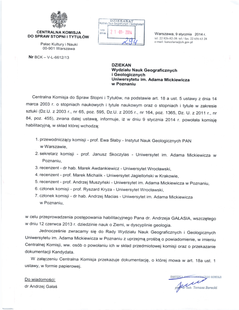 CENTRALNA KOM:SJA DO SPRAW STOPN‖ TYTUヒ OW Warszawa, 9 stycznia 2014 r. tel.22 826-82-38: tel./ fax. 22 656 63 28 e-mail : [email protected] Palac Kultury l Nauki 00‐ 901 VVarszawa Nr BcK― ∨‐L-6612/13 DZIEKAN Wydzialu Nauk Geograficznych iGeologicznych Uniwersytetu im. Adama Mickiewicza w Poznaniu Centralna Komisja do Spraw Stopni iTytulow, na podstawie art. 18 a ust.5 ustawy zdnia 14 marca 2003 r. o stopniach naukowych i tytule naukowym oraz o stopniach i tytule w zakresie sztuki (Dz.U. 22003 r., nr6s, poz. sgs, Dz.U. z2oo5 r., nr 164, poz. 1365, Dz. u.z2011 r., nr 84, poz. 455), zvtana dalej ustawa, informuje, iz w dniu 9 stycznia 2e14 r. powolala komisjq habilitacyjnq, w sklad ktorej wchodzq: 1. przewodniczqcy komisji - prof. Ewa Slaby - lnstytut Nauk Geologicznych pAN w Warszawie, 2. sekretarz komisji - prof. Janusz Skoczylas - Uniwersytet im. Adama Mickiewicza w Poznaniu, 3. recenzent - dr hab. Marek Awdankiewicz - Uniwersytet wroclawski, 4. recenzent - prof. Marek Michalik - Uniwersytet Jagielloflski w Krakowie, 5. recenzent - prof. Andrzej Muszynski - Uniwersytet im. Adama Mickiewicza w poznaniu, 6. czlonek komisji - prof. Ryszard Kryza - Uniwersytet wroclawski, 7. czlonek komisji - dr hab. Andrzej Macias - Uniwersytet im. Adama Mickiewicza w Poznaniu, w celu przeprowadzenia postgpowania habilitacyjnego Pana dr. Andrzeja GAI-ASlA, wszczqtego w dniu 12 czerwca 2013 r. dziedzinie nauk o ziemi, w dyscyplinie geologia. Jednocze6nie zwracamy siq do Rady Wydzialu Nauk Geograficznych i Geologicznych Uniwersytetu im. Adama Mickiewicza w Poznaniu z uprzejmq proSbq o powiadomienie, w imieniu Centralnej Komisji, ww. os6b o powolaniu ich w sklad przedmiotowej komisji oraz o przekazanie dokumentacil Kandydata. ⅥノzalaCZeniu centralna Komisia przekazule dOkumentaciQ, ustawy,w formie papierowei. Do wiadomoSci: dr Andrzel GalaS o ktorej mowa w art. 18a ust. 1