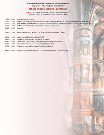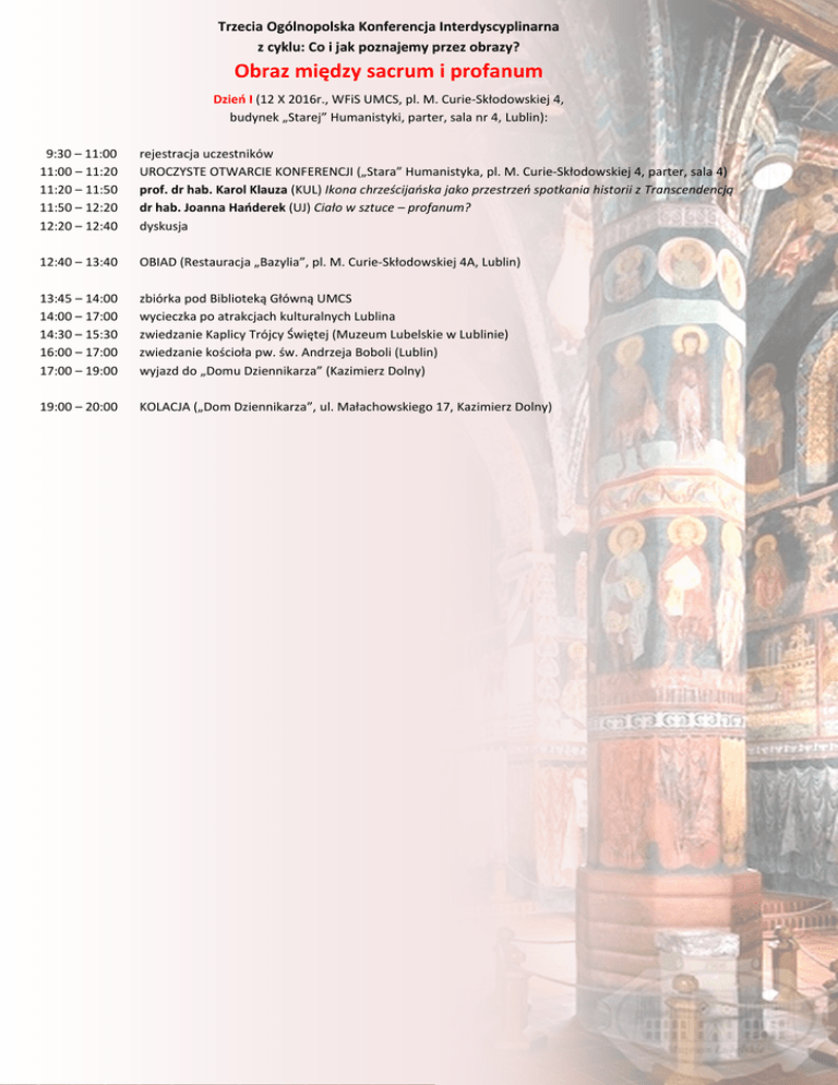 Trzecia Ogólnopolska Konferencja Interdyscyplinarna z cyklu: Co i jak poznajemy przez obrazy? O raz iędzy sa ru i profanum Dzień I (12 X 2016r., WFiS UMCS, pl. M. Curie-Skłodowskiej 4, udy ek „Starej” Hu a istyki, parter, sala r 4, Lublin): 9:30 – 11:00 11:00 – 11:20 11:20 – 11:50 11:50 – 12:20 12:20 – 12:40 rejestracja uczestników UROCZYSTE OTWARCIE KONFERENCJI („Stara” Hu a istyka, pl. M. Curie-Skłodowskiej 4, parter, sala 4) prof. dr hab. Karol Klauza (KUL) Iko a hrześ ijańska jako przestrzeń spotka ia historii z Tra s e de ją dr ha . Joa a Hańderek (UJ) Ciało w sztu e – profanum? dyskusja 12:40 – 13:40 OBIAD (Restauracja „Bazylia”, pl. M. Curie-Skłodowskiej 4A, Lublin) 13:45 – 14:00 14:00 – 17:00 14:30 – 15:30 16:00 – 17:00 17:00 – 19:00 z iórka pod Bi lioteką Głów ą UMCS wycieczka po atrakcjach kulturalnych Lublina zwiedza ie Kapli y Trój y Świętej Muzeu Lu elskie w Lu li ie zwiedzanie koś ioła pw. św. A drzeja Bo oli Lu li wyjazd do „Do u Dzie ikarza” Kazi ierz Dol y 19:00 – 20:00 KOLACJA „Do Dzie ikarza”, ul. Mała howskiego 17, Kazimierz Dolny) Trzecia Ogólnopolska Konferencja Interdyscyplinarna z cyklu: Co i jak poznajemy przez obrazy? O raz Dzień II (13 X 2016 r., „Do 8:00 – 9:00 iędzy sa ru Dzie i profanum ikarza”, ul. Mała howskiego 17, Kazimierz Dolny): ŚNIADANIE SALA A Pa el I prowadzą y: dr Ki ga Kiwała : 9:00 – 9:40 dr hab. Romuald Piekarski prof. nadzw. (UG) Idol a idolatria – uwagi pole i z e względe ko ep ji Jean-Luc Mariona 9:40 – 10:20 dr ha . Małgorzata Kowalewska prof. adzw. (UMCS) Ko iks w służ ie śred iowie z ej teologii 10:20 – 10:40 gr Urszula Opyr hał (UPJPII) Obraz i forma w modlitwie i medytacji 10:40 – 11:00 mgr Karina Gaik-Dudziak (KUL) Islam – (nie)zakazane obrazy 11:00 – 11:20 dyskusja 11:30 – 11:50 Pa el II prowadzą y: dr ha . Paweł Byt iewski : dr ha . Józef Dę owski prof. nadzw. (UWM) W kwestii prawdziwoś i/fałszywoś i dzieł sztuki dr hab. Mariola Kuszyk-Bytniewska (UMCS) Eliadego obrazowanie sacrum – symbol i obraz dr Beata Trochimska-Kubacka (UWr) Poję ie „o razu" w uję iu Ha sa Belti ga i Georgesa DidiHubermana gr Aleksa dra Żukowska (UG) Wizual e gry for ą – poszukiwa ie gra i iędzy sacrum i profanum lic Gabriel Bednarz (UJ) Desakralizacja i sakralizacja sztuki w koncepcjach estetycznych L. Chwistka i S.I. Witkiewicza dyskusja 12:00 – 12:30 PRZERWA KAWOWA SALA B 9:00 – 9:40 9:40 – 10:20 10:20 – 10:50 10:50 – 11:10 11:10 – 11:30 SALA A Panel III prowadzą y: dr hab. Maciej Kociuba): 12:30 – 13:10 prof. dr hab. Karol Klauza (KUL) Korespondencja sztuk wizualnych i audialnych w postrzeganiu sacrum 13:10 – 13:40 dr Ki ga Kiwała (Akademia Muzyczna w Krakowie) Wyrazić iewyrażal e. Fu k ja iszy w muzycznym doświad ze iu sa ru 13:40 – 14:10 dr Gabriela Kurylewicz (UW) Czy ko ie z ie trze a ówić o raza i? 14:10 – 14:30 mgr Katarzyna Kucia (UJ) „Saint François d'Assise” Oliviera Messiaena – mistyczny obraz (w) dźwięku 14:30 – 14:50 dyskusja SALA B Pa el IV prowadzą y: dr ha . Mariola Kuszyk-Bytniewska): 12:30 – 13:10 prof. dr ha . Jadwiga Mizińska (UMCS) Wąż w ogrodzie. Sakraliza ja profa u według Bru o S hulza 13:10 – 13:30 gr Re ata Łukiewi z-Kostro (UMCS) SZIR ha-SZIRIM Pieśń ajpięk iejsza . Obrazowanie za po o ą metafory. SACRUM i PROFANUM a przykładzie „Pieś i ad Pieś ia i” 13:30 – 13:50 mgr Magdalena Wdowiak (UJ) Alegory z e od zyta ie „Pieś i ad Pieś ia i” przez Oryge esa 13:50 – 14:10 dyskusja 15:00 – 16:00 OBIAD SALA A Pa el V prowadzą y: dr Jaroslaw Ja owski : 16:00 – 16:40 prof. dr hab. Urszula Mazurczak (KUL) Pięk o iała – rzydota iała. Pro le y z ieles oś ią i du howoś ią 16:40 – 17:20 dr ha . Do rosław Bagiński (UPH w Siedlcach) Ego i Ezo 17:20 – 17:50 dr Krzysztof Wał zyk SJ (Akademia Ignatianum w Krakowie) Motyw „ ogi i atki” w przedstawieniach prehistory z y h a hrześ ijańska „tro ują a ado a” 17:50 – 18:20 dr Paweł Ma iąg (ASP w Katowicach) Mozaiki Marko Rupnika i ich artystyczno-teologi z e przesła ie 18:20 – 18:40 dyskusja 19:00 – 20:00 UROCZYSTA KOLACJA Trzecia Ogólnopolska Konferencja Interdyscyplinarna z cyklu: Co i jak poznajemy przez obrazy? O raz Dzień III (14 X 2016 r., „Do 8:30 – 9:30 SALA A 9:30 – 10:10 10:10 – 10:40 10:40 – 11:10 11:10 – 11:40 11:40 – 12:00 iędzy sa ru Dzie i profanum ikarza”, ul. Mała howskiego 17, Kazi ierz Dol y): ŚNIADANIE Pa el VI prowadzą y: dr ha . Do rosław Bagiński : dr ha . Paweł Byt iewski (UMCS) Mit pierwszego obrazu dr A a Palusińska (KUL) Wie z ość w o razie dr Reet Otsason (KUL) Człowiek jako i ago Dei – iędzy y ie a odzwier iedle ie dr Jarosław Ja owski (UMCS) Imago Mundi – iędzy sa rum a profanum dyskusja SALA B Pa el VII prowadzą y: dr ha . Małgorzata Kowalewska prof. nadzw. UMCS): 9:30 – 10:10 dr hab. Maciej Kociuba (UMCS) Józef Mehoffer – „Św. Bar ara” jako struktura poliiko i z a 10:10 – 10:40 dr Karol Kollinger (PAN w Warszawie) Uży ie sań w o rzęda h pogrzebu na w zes ośred iowie z ej Rusi – w świetle źródeł iko ografi z y h 10:40 – 11:10 dr Bartło iej K osala (Polite h ika Śląska) Święta geo etria – mandale – kopuły geodezyj e. Buckminster Fuller jako mistyk 11:10 – 11:30 mgr Agnieszka Tes (Akademia Ignatianum w Krakowie) Współ zes e polskie alarstwo a strak yj e iędzy profa u a du howoś ią 11:30 – 11:50 dyskusja 12:00 – 12:30 PRZERWA KAWOWA SALA A Pa el VIII prowadzą y: dr A a Palusińska : 12:30 – 13:00 dr Paweł Graf (UAM) Futurystyczne sacrum – futurystyczne profanum. Na podstawie obrazów poetyckich i malarskich 13:00 – 13:30 dr Graży a Osika (Polite h ika Śląska) Wikiverse – iędzy sa ru i profa u świata zwizualizowa ej informacji 13:30 – 14:00 dr Ag ieszka Ku zyńska (UMCS) Fałsz pięk a. Georges Bataille i „Do u e ts” 14:00 – 14:30 dr Katarzyna Stad