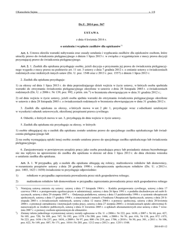 ©Kancelaria Sejmu s. 1/8 Dz.U. 2014 poz. 567 USTAWA z dnia 4 kwietnia 2014 r. o ustaleniu i wypłacie zasiłków dla opiekunów 1) Art. 1. Ustawa określa warunki nabywania oraz zasady ustalania i wypłacania zasiłków dla opiekunów osobom, które utraciły prawo do świadczenia pielęgnacyjnego z dniem 1 lipca 2013 r. w związku z wygaśnięciem z mocy prawa decyzji przyznającej prawo do świadczenia pielęgnacyjnego. Art. 2. 1. Zasiłek dla opiekuna przysługuje osobie, jeżeli decyzja o przyznaniu jej prawa do świadczenia pielęgnacyjnego wygasła z mocy prawa na podstawie art. 11 ust. 3 ustawy z dnia 7 grudnia 2012 r. o zmianie ustawy o świadczeniach rodzinnych oraz niektórych innych ustaw (Dz. U. poz. 1548 oraz z 2013 r. poz. 1557) z dniem 1 lipca 2013 r. 2. Zasiłek dla opiekuna przysługuje: 1) za okresy od dnia 1 lipca 2013 r. do dnia poprzedzającego dzień wejścia w życie ustawy, w których osoba spełniała warunki do otrzymania świadczenia pielęgnacyjnego określone w ustawie z dnia 28 listopada 2003 r. o świadczeniach rodzinnych (Dz. U. z 2006 r. Nr 139, poz. 992, z późn. zm. 2)) w brzmieniu obowiązującym w dniu 31 grudnia 2012 r.; 2) od dnia wejścia w życie ustawy, jeżeli osoba spełnia warunki do otrzymania świadczenia pielęgnacyjnego określone w ustawie z dnia 28 listopada 2003 r. o świadczeniach rodzinnych w brzmieniu obowiązującym w dniu 31 grudnia 2012 r. 3. Zasiłek dla opiekuna za okresy, o których mowa w ust. 2 pkt 1, przysługuje wraz z odsetkami ustalonymi w wysokości odsetek ustawowych, określonej przepisami prawa cywilnego. 4. Odsetki, o których mowa w ust. 3, przysługują do dnia wejścia w życie ustawy. 5. Zasiłek dla opiekuna nie przysługuje za okresy, w których: 1) osobie ubiegającej się o zasiłek dla opiekuna zostało ustalone prawo do specjalnego zasiłku opiekuńczego lub świadczenia pielęgnacyjnego lub 2) na osobę wymagającą opieki innej osobie zostało ustalone prawo do specjalnego zasiłku opiekuńczego lub świadczenia pielęgnacyjnego. 6. Zarejestrowanie w powiatowym urzędzie pracy jako osoba poszukująca pracy lub posiadanie statusu bezrobotnego nie ma wpływu na uprawnienie do zasiłku dla opiekuna w okresie od dnia 1 lipca 2013 r. do dnia złożenia wniosku o ustalenie zasiłku dla opiekuna. Art. 3. 1. W przypadku, gdy o zasiłek dla opiekuna ubiegają się rolnicy, małżonkowie rolników lub domownicy, w rozumieniu przepisów ustawy z dnia 20 grudnia 1990 r. o ubezpieczeniu społecznym rolników (Dz. U. z 2013 r. poz. 1403, 1623 i 1650) świadczenie to przysługuje odpowiednio: 1) rolnikom w przypadku zaprzestania prowadzenia przez nich gospodarstwa rolnego; 2) małżonkom rolników lub domownikom w przypadku zaprzestania prowadzenia przez nich gospodarstwa rolnego 1 ) 2 ) Niniejszą ustawą zmienia się ustawy: ustawę z dnia 17 listopada 1964 r. – Kodeks postępowania cywilnego, ustawę z dnia 17 czerwca 1966 r. o postępowaniu egzekucyjnym w administracji, ustawę z dnia 26 lipca 1991 r. o podatku dochodowym od osób fizycznych, ustawę z dnia 29 sierpnia 1997 r. – Ordynacja podatkowa, ustawę z dnia 13 października 1998 r. o systemie ubezpieczeń społecznych, ustawę z dnia 17 grudnia 1998 r. o emeryturach i rentach z Funduszu Ubezpieczeń Społecznych, ustawę z dnia 28 listopada 2003 r. o świadczeniach rodzinnych, ustawę z dnia 12 marca 2004 r. o pomocy społecznej, ustawę z dnia 20 kwietnia 2004 r. o promocji zatrudnienia i instytucjach rynku pracy, ustawę z dnia 27 sierpnia 2004 r. o świadczeniach opieki zdrowotnej finansowanych ze środków publicznych, ustawę z dnia 21 kwietnia 2005 r. o opłatach abonamentowych oraz ustawę z dnia 7 września 2007 r. o pomocy osobom uprawnionym do alimentów. Zmiany tekstu jednolitego wymienionej ustawy zostały ogłoszone w Dz. U. z 2006 r. Nr 222, poz. 1630, z 2007 r. Nr 64, poz. 427, Nr 105, poz. 720, Nr 109, poz. 747, Nr 192, poz. 1378 i Nr 200, poz. 1446, z 2008 r. Nr 70, poz. 416, Nr 138, poz. 872 i 875, Nr 223, poz. 1456 i Nr 237, poz. 1654, z 2009 r. Nr 97, poz. 800 i Nr 219, poz. 1706, z 2010 r. Nr 50, poz. 301, z 2011 r. Nr 106, poz. 622, Nr 149, poz. 887, Nr 171, poz. 1016 i Nr 205, poz. 1212 oraz z 2012 r. poz. 1255 i 1548. 2014-05-12 ©Kancelaria Sejmu s. 2/8 albo wykonywania przez nich pracy w gospodarstwie rolnym. 2. Zaprzestanie prowadzenia gospodarstwa rolnego lub zaprzestanie wykonywania pracy w gospodarstwie rolnym, o których mowa w ust. 1, potwierdza się stosownym oświadczeniem złożonym pod rygorem odpowiedzialności karnej za składanie fałszywych zeznań. Składający oświadczenie jest obowiązany do zawarcia w nim klauzuli następującej treści: „Jestem świadomy odpowiedzialności karnej za złożenie fałszywego oświadczenia.”. Klauzula ta zastępuje pouczenie organu o odpowiedzialności karnej za składanie fałszywych zeznań. Art. 4. Zasiłek dla opiekuna przysługuje w wysokości 520 zł miesięcznie. Art. 5. 1. Postępowanie w sprawie ustalenia prawa do zasiłku dla opiekuna organ ustalający prawo do świadczeń pielęgnacyjnych wszczyna na wniosek osoby ubiegającej się o zasiłek dla opiekuna. Wniosek może być złożony nie później niż w terminie 4 miesięcy od dnia wejścia w życie ustawy. 2. Jeżeli w okresie, o którym mowa w ust. 1, toczy się postępowanie o wydanie orzeczenia o niepełnosprawności lub orzeczenia o stopniu niepełnosprawności osobie, nad którą jest sprawowana opieka, wniosek może być złożony nie później niż w terminie 4 miesięcy od dnia wydania tego orzeczenia. 3. Ustalając prawo do zasiłku dla opiekuna, organ, o którym mowa w ust. 1, może odebrać oświadczenie o spełnianiu warunków do otrzymania świadczenia pielęgnacyjnego na podstawie ustawy z dnia 28 listopada 2003 r. o świadczeniach rodzinnych w brzmieniu obowiązującym w dniu 31 grudnia 2012 r., odpowiednio za okresy, o których mowa w art. 2 ust. 2 pkt 1, lub w dniu składania wniosku. 4. Oświa