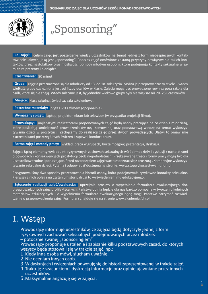 SCENARIUSZ ZAJĘĆ DLA UCZNIÓW SZKÓŁ PONADPODSTAWOWYCH „Sponsoring” Cel zajęć: celem zajęć jest poszerzenie wiedzy uczestników na temat jednej z form niebezpiecznych kontaktów seksualnych, jaką jest „sponsoring”. Podczas zajęć omówione zostaną przyczyny nawiązywania takich kontaktów przez nastolatków oraz możliwości pomocy młodym osobom, które podejmują kontakty seksualne w zamian za prezenty i pieniądze. Czas trwania: 90 minut Grupa: zajęcia przeznaczone są dla młodzieży od 13. do 18. roku życia. Można je przeprowadzać w szkole – wtedy wielkość grupy uzależniona jest od liczby uczniów w klasie. Zajęcia mogą być prowadzone również poza szkołą dla osób, które się nie znają. Wtedy zalecane jest, by jednolite wiekowo grupy były nie większe niż 20–25 uczestników. Miejsce: klasa szkolna, świetlica, sala szkoleniowa. Potrzebne materiały: płyta DVD z filmem (opcjonalnie). Wymagany sprzęt: laptop, projektor, ekran lub telewizor (w przypadku projekcji filmu). Prowadzący: najlepszymi realizatorami proponowanych zajęć będą osoby pracujące na co dzień z młodzieżą, które posiadają umiejętność prowadzenia dyskusji sterowanej oraz podstawową wiedzę na temat wykorzystywania dzieci w prostytucji. Zachęcamy do realizacji zajęć przez dwóch prowadzących. Ułatwi to omawianie z uczestnikami poszczególnych ćwiczeń i zapewni komfort pracy. Forma zajęć i metody pracy: wykład, praca w grupach, burza mózgów, prezentacja, dyskusja. Zajęcia łączą elementy wykładu nt. ryzykownych zachowań seksualnych wśród młodzieży i dyskusji z nastolatkami o powodach i konsekwencjach prostytucji osób niepełnoletnich. Przekazywane treści i formy pracy mogą być dla uczestników trudne i poruszające. Przed rozpoczęciem zajęć warto zapoznać się z broszurą „Komercyjne wykorzystywanie seksualne dzieci. Pytania i odpowiedzi”dostępną na stronie: www.stopwykorzystywaniu.fdn.pl Przygotowaliśmy dwa sposoby prezentowania historii osoby, która podejmowała ryzykowne kontakty seksualne. Pierwszy z nich polega na czytaniu historii, drugi to wyświetlenie filmu edukacyjnego. Zgłoszenie realizacji zajęć/ewaluacja: uprzejmie prosimy o wypełnienie formularza ewaluacyjnego dot. przeprowadzonych zajęć profilaktycznych. Państwa opinia będzie dla nas bardzo pomocna w tworzeniu kolejnych materiałów edukacyjnych. Po wypełnieniu formularza ewaluacyjnego będą mogli Państwo otrzymać zaświadczenie o przeprowadzeniu zajęć. Formularz znajduje się na stronie www.akademia.fdn.pl. I. Wstęp Prowadzący informuje uczestników, że zajęcia będą dotyczyły jednej z form ryzykownych zachowań seksualnych podejmowanych przez młodzież – potocznie zwanej „sponsoringiem”. Prowadzący proponuje ustalenie i zapisanie kilku podstawowych zasad, do których wszyscy będa stosowali się w trakcie zajęć, np.: 1.Kiedy inna osoba mówi, słucham uważnie. 2.Nie oceniam innych osób. 3.W dyskusjach i ćwiczeniach odwołuję się do historii zaprezentowanej w trakcie zajęć. 4.Traktuję z szacunkiem i dyskrecją informacje oraz opinie ujawniane przez innych uczestników. 5.Maksymalnie angażuję się w zajęcia. 1 II. Ćwiczenie: Definicja „sponsoringu” Forma pracy: praca w grupach Czas trwania: 10 minut Prowadzący dzieli uczestników na pięcioosobowe grupy. Zadaniem każdej z nich jest stworzenie definicji problemu „sponsoringu”, który dotyczy młodych osób. W definicji warto zawrzeć informacje, takie jak: kto podejmuje zachowania tego typu (wiek, płeć itp.), kim najczęściej są „sponsorzy” (wiek, płeć, motywacja), jak i gdzie dochodzi do spotkań, co może być zapłatą. Grupy mają na to zadanie 5 minut. Następnie każda z grup prezentuje na forum swoją pracę. III. Wykład Forma pracy: wykład Czas trwania: 10 minut Prowadzący przedstawia definicję problemu „sponsoringu”, który dotyczy młodych osób. Zjawisko „sponsoringu” ma miejsce wtedy, gdy młode osoby, bez względu na płeć, umawiają się na kontakty seksualne za tzw. prezenty czy pieniądze, najczęściej z dorosłymi. Takie spotkania mogą być aranżowane przez Internet, ale może dochodzić do nich również bez nawiązania wcześniejszego kontaktu, np. w galeriach handlowych. Stąd popularna nazwa „galerianki”, odnosząca się do dziewcząt, które szukają „sponsorów” w galeriach handlowych. Podczas podawania definicji warto zwrócić szczególną uwagę na fakt, że w tzw. „sponsoringu” zapłatą mogą być prezenty – czasem bardzo drogie czy ekskluzywne, np.: telefon komórkowy, perfumy, odtwarzacz muzyczny itp., a czasem tanie, np.: płyta, niedrogie ubrania i akcesoria, czy nawet błyszczyk. Niekiedy „sponsorzy” płacą po prostu pieniędzmi, a zdarza się i tak, że jednorazowe spotkania przeradzają się w układ, w którym młoda osoba jest utrzymywana przez „sponsora” w zamian za kontakty seksualne. „Sponsoring” wśród młodych osób nie jest zjawiskiem sporadycznym. Z badań Fundacji Dzieci Niczyje przeprowadzonych w 2010 roku na grupie 1000 osób w wieku 15–18 lat wynika, że aż jedna czwarta badanych nastolatków przyznała, że zna przynajmniej jedną osobę w podobnym wieku, która w ciągu ostatniego roku utrzymywała kontakty seksualne w zamian za pieniądze lub prezenty. Podejmowanie przez dorosłych kontaktów seksualnych z młodymi osobami za prezenty czy pieniądze uznawane jest za formę komercyjnego wykorzystania seksualnego. Ochrona przed tym zjawiskiem została zapisana w Konwencji o Prawach Dziecka ONZ, która stanowi zbiór przepisów prawnych, dotyczących wszystkich sfer życia młodych osób. Artykuł 19 1. Państwa – Strony będą podejmowały wszelkie właściwe kroki w dziedzinie ustawodawczej, administracyjnej, społecznej oraz wychowawczej dla ochrony dziecka przed wszelkimi formami przemocy fizycznej bądź psychicznej, krzywdy lub zaniedbania bądź złego