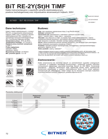 BiT RE-2Y(St)H TiMF Kable instrumentacyjne o wspólnym ekranie elektrostatycznym, powłoce bezhalogenowej oraz indywidualnie ekranowanych trójkach, 500V RoHS RoHS 2011/65/UE LVD 2014/35/UE EN 50288-7 Dane techniczne: Budowa: Kabel o żyłach wielodrutowych, o izolacji PE (2Y), o indywidualnie ekranowanych trójkach (TiMF) oraz o wspólnym ekranie elektrostatycznym (St), o powłoce ze specjalnego tworzywa bezhalogenowego (H), o konstrukcji trójkowej ośrodka Temperatura pracy: -40°C do 80°C Temperatura montażu: -5°C do 80°C Napięcie pracy (wartość szczytowa): U=500 V Próba napięciowa: żyła/żyła: 2000V żyła/ekran: 2000V Rezystancja izolacji: >5 GΩxkm Min. promień gięcia: 7,5 x Ø Żyły: żyły miedziane wielodrutowe klasy 2 wg PN-EN 60228 Izolacja: polietylen PE* Oznaczenie żył: jednobarwne z nadrukiem cyfrowym na żyle białej, żyła a – czarna; żyła b - biała; żyła c - czerwona; Ośrodek: żyły skręcone w trójki, na każdej trójce ekran elektrostatyczny – taśma poliestrowa pokryta aluminium, pod każdym ekranem żyła uziemiająca, ekranowane trójki skręcone w ośrodek. Ośrodek owinięty taśmą poliestrową. Ekran: taśma poliestrowa pokryta warstwą aluminium, pod ekranem żyła uziemiająca (linka miedziana ocynowana o przekroju 0,5mm2) Powłoka: specjalny polimer bezhalogenowy, samogasnący i nierozprzestrzeniający płomienia, odporny na UV Kolor powłoki: czarny, niebieski** * kable są dostępne również w wersji o izolacji z polietylenu usieciowanego XLPE - BiT RE-2X(St)H TiMF ** kable o powłoce w kolorze niebieskim posiadają rozszerzone numery katalogowe zakończone indeksem - 06. Np. Numer kat. dla kabla BiT RE-2Y(St)H TiMF 2x3x0,5 o powłoce czarnej to ID6270, Numer kat. dla kabla IB-BiT RE-2Y(St)H TiMF 2x3x0,5 o powłoce niebieskiej to ID6270.06 Zastosowanie: zastosowanie w przemyśle zastosowanie wnętrzowe Kable przeznaczone do transmisji danych za pośrednictwem sygnałów analogowych i cyfrowych, w systemach sterowania numerycznego i systemach przesyłu informacji numerycznych zapewniając optymalną transmisję danych do 200 KBit/s. Konstrukcja wewnętrzna - skręcone ekranowane trójki zapewniają bardzo dobry współczynnik tłumienności przenikowej, a wspólny elektrostatyczny ekran chroni przed wpływem zewnętrznych pól zakłócających. Kabel nadaje się do stosowania wewnątrz budynków w pomieszczeniach suchych i wilgotnych, powłoka odporna na UV. PN-EN 60332-1 UV IEC 60332-3 PN-EN 60332-3 transmisja danych odporność UV F B Cl niska emisja dymów bezhalogenowe Parametry elektryczne: Pojemność [nF/km] 0,5mm2 2 0,75mm 1,0mm2 1,3mm2 1,5mm2 72 100 100 100 100 100 Rezystancja żyły [Ω/km] Indukcyjność 1 mH/km L/R [μH/Ω] 36,7 25,0 18,5 14,2 12,3 25 25 25 40 40 BiT RE-2Y(St)H TiMF Kable instrumentacyjne o wspólnym ekranie elektrostatycznym, powłoce bezhalogenowej oraz indywidualnie ekranowanych trójkach, 500V Waga kabla [kg/km] Cu [kg/km] Nr kat. n x mm2 Średnica [mm] Waga kabla [kg/km] Cu [kg/km] 133 192 246 300 342 418 480 640 826 999 39 73 91 108 142 177 211 280 349 418 ID6295 ID6296 ID6297 ID6298 ID6299 10x3x1,0 12x3x1,0 16x3x1,0 20x3x1,0 24x3x1,0 25,3 26,1 29,7 33,0 37,1 631 729 975 1255 1516 330 395 525 655 785 12,9 15,2 16,8 18,3 20,6 23,8 24,8 28,2 31,3 35,2 160 245 305 373 427 524 616 823 1060 1282 54 104 128 153 203 252 302 401 500 599 ID6300 ID6301 ID6302 ID6303 ID6304 ID6305 ID6306 ID6307 ID6308 ID6309 2x3x1,3 4x3x1,3 5x3x1,3 6x3x1,3 8x3x1,3 10x3x1,3 12x3x1,3 16x3x1,3 20x3x1,3 24x3x1,3 14,1 17,0 18,7 20,7 23,2 26,8 27,9 31,6 35,1 39,4 214 346 431 537 627 770 906 1207 1546 1864 91 178 221 264 351 438 524 698 871 1044 13,5 16,0 17,6 19,5 21,9 184 285 356 446 514 70 135 167 200 265 ID6310 ID6311 ID6312 ID6313 ID6314 ID6315 ID6316 ID6317 ID6318 ID6319 2x3x1,5 4x3x1,5 5x3x1,5 6x3x1,5 8x3x1,5 10x3x1,5 12x3x1,5 16x3x1,5 20x3x1,5 24x3x1,5 15,0 17,8 19,6 21,6 24,3 28,1 29,2 33,2 36,8 41,4 235 368 459 574 667 819 964 1286 1651 1991 97 190 236 282 375 467 560 745 930 1115 Średnica [mm] Nr kat. n x mm2 ID6270 ID6271 ID6272 ID6273 ID6274 ID6275 ID6276 ID6277 ID6278 ID6279 2x3x0,5 4x3x0,5 5x3x0,5 6x3x0,5 8x3x0,5 10x3x0,5 12x3x0,5 16x3x0,5 20x3x0,5 24x3x0,5 11,8 13,7 15,3 16,7 18,7 21,7 22,4 25,4 28,2 31,7 ID6280 ID6281 ID6282 ID6283 ID6284 ID6285 ID6286 ID6287 ID6288 ID6289 2x3x0,75 4x3x0,75 5x3x0,75 6x3x0,75 8x3x0,75 10x3x0,75 12x3x0,75 16x3x0,75 20x3x0,75 24x3x0,75 ID6290 ID6291 ID6292 ID6293 ID6294 2x3x1,0 4x3x1,0 5x3x1,0 6x3x1,0 8x3x1,0 Zakłady Kablowe BITNER zastrzegają sobie prawo do zmiany specyfikacji bez wcześniejszego uprzedzenia. Istnieje możliwość wykonania przewodów o innych przekrojach lub o innej liczbie żył niż podane w katalogu. 73