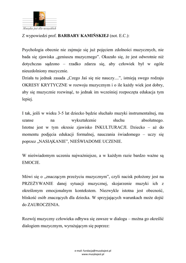 Z wypowiedzi prof. BARBARY KAMIŃSKIEJ (not. E.C.): Psychologia obecnie nie zajmuje się już pojęciem zdolności muzycznych, nie bada się zjawiska „geniuszu muzycznego”. Okazało się, że jest odwrotnie niż dotychczas sądzono – rzadko zdarza się, aby człowiek był w ogóle nieuzdolniony muzycznie. Działa tu jednak zasada „Czego Jaś się nie nauczy....”, istnieją swego rodzaju OKRESY KRYTYCZNE w rozwoju muzycznym i o ile każdy wiek jest dobry, aby się muzycznie rozwinąć, to jednak im wcześniej rozpoczęta edukacja tym lepiej. I tak, jeśli w wieku 3-5 lat dziecko będzie słuchało muzyki instrumentalnej, ma szanse na wykształcenie słuchu absolutnego. Istotne jest w tym okresie zjawisko INKULTURACJI. Dziecko – aż do momentu podjęcia edukacji formalnej, nauczania świadomego – uczy się poprzez „NASIĄKANIE”, NIEŚWIADOME UCZENIE. W nieświadomym uczeniu najważniejsze, a w każdym razie bardzo ważne są EMOCJE. Mówi się o „znaczącym przeżyciu muzycznym”, czyli nacisk położony jest na PRZEŻYWANIE danej sytuacji muzycznej, skojarzenie muzyki ich z określonym emocjonalnym kontekstem. Niezwykle istotna jest obecność, bliskość osób znaczących dla dziecka. W sprzyjających warunkach może dojść do ZAUROCZENIA. Rozwój muzyczny człowieka odbywa się zawsze w dialogu – można go określić dialogiem muzycznym, wyrażającym się poprzez: e-mail: [email protected] www.muzykajest.pl - wspólne słuchanie - śpiewanie z osobą znaczącą - dzielenie przeżyć i dzielenie się przeżyciami Pierwszymi i najlepszymi nauczycielami dla dziecka są zawsze rodzice. To z nimi dziecko nawiązuje pierwszy dialog werbalny i z nimi także powinien zdarzyć się dialog muzyczny. Ważne jest szczególnie śpiewanie i zachęcanie do śpiewu. Niekoniecznie częste. OKRES PŁODOWY: Trzeba podkreślić, że muzyka jest dziedziną sztuki, której percepcja zaczyna się najwcześniej. Receptory muzyczne kształtują się między 16 a 20 tygodniem życia płodu – w tym okresie rejestruje się pierwsze reakcje na bodźce dźwiękowe. Po pięciu miesiącach ucho środkowe i wewnętrzne mają wielkość porównywalną z wielkością u dorosłego człowieka. Już okresie płodowym kształtuje się poczucie rytmu i pulsu (choćby poprzez słuchanie bicia serca, odczucie ruchu itd.). Można stwierdzić odmienność reakcji płodu na muzykę stymulującą i uspokajającą. W tym też okresie kształtuje się więź emocjonalna dziecka z matką – uczucia matki są także odbierane przez płód. Rodzaje muzyki, najlepiej tolerowane we wczesnym okresie, także w fazie płodu: - klasyczna - tańce renesansowe - aranżacje muzyki folkowej - wybrane inne utwory e-mail: [email protected] www.muzykajest.pl WAŻNE, aby była to muzyka NIE ZA GŁOŚNA i aby nie była puszczana bez przerwy (np. niedopuszczalne jest na okrągło włączone radio)! Przerwy, cisza są niezwykle istotne. W ciąży w trakcie słuchania można głaskać brzuch, klepać go, kołysać, można też grać blisko brzucha, ale nie za głośno, a także delikatnie tańczyć. Dziecko po urodzeniu, jeśli było stymulowane muzycznie i głosowo nie tylko rozpoznaje głos matki, ale także reaguje na utwory słuchane w okresie płodowym. Co ciekawe, niezależnie od ich charakteru, mają one na dziecko działanie uspokajające! OKRES DO 1,5 roku życia: W tym okresie następuje rozwój wrażliwości sensoryczno-emocjonalnej na muzykę. Pojawiają sie pierwsze zauważalne reakcje emocjonalne oraz momenty koncentracji uwagi na muzyce. Czasami dzieci reagują ruchem. Trzeba jednak podkreślić, że NIC NIE JEST TAK FASCYNUJĄCE dla dziecka w tym okresie, jak GŁOS i ŚPIEW! dzieci, którym się śpiewa także lepiej gaworzą, wydają z siebie bardziej zróżnicowane dźwięki. Co więcej, dzieci, którym się śpiewa, nawet w żłobkach (!) mają zaspokojone potrzeby emocjonalne. Ale, jak we wszystkim ważny jest umiar – chodzi o to, aby nie przesadzić ze stymulacją, czyli istotne jest, aby nie były to zbyt duże dawki śpiewu i muzyki naraz, nie cały czas. Śpiewając należy zatem: e-mail: [email protected] www.muzykajest.pl - obserwować nastrój dziecka i dostosowywać rodzaj oraz charakter piosenki do potrzeb - nie przesadzać z bodźcami, czyli nie za dużo różnych bodźców naraz (np. i ruch i intensywny rytm i melodia), ale też nie za silne i nie za długo OKRES ,5-3 roku życia: W tym okresie następuje rozwój spontanicznej reakcji na muzykę i spontanicznego śpiewania. Z dotychczasowego doświadczenia koncertów, które odbywały się w Bydgoszczy wynika także, że już w tym wieku można zaobserwować różnice w charakterze dzieci i ich reakcji na muzykę. Zasadniczo można wskazać dwa typy: zasłuchane i „zabawowe”. Wiele także zależy od samych rodziców, w jaki sposób oni sami reagują i jak stymulują dziecko. Jeśli ich reakcja jest ruchowa, dziecko może to przejąć, ale w zasadzie wtedy przestaje słuchać, zaczyna się zabawa. Niektóre dzieci jednak same z siebie zaczynają się ruszać lub reagują zasłuchaniem. Oczywiście także w tym wieku niezmiernie ważne jest śpiewanie dziecku i z dzieckim. PIOSENKI DOBRE DLA DZIECI: - te, o sprawdzonej przez pokolenia wartości - te, które dziecko pamięta (jeśli nie pamięta, to znaczy, że wybraliśmy niewłaściwą piosenkę) - im prostsza tym lepsza - krótkie frazy - rytm zachęcający do ruchu e-mail: [email protected] www.muzykajest.pl - melodia bez dużych skoków - nie za szeroki ambitus Łatwe piosenki dają szansę na odkrywanie własnego głosu przez dziecko, umożliwiają właściwe zaśpiewanie usłyszanej melodii oraz opanowanie czystej intonacji. Można nawet, we wczesnym okresie ograniczyć się do śpiewania-gaworzenia [jeśli dobrze rozumiem, chodzi o taki rodzaj śpiewu, w którym nie codzi o konkretną piosenkę, ale, jak w gaworzeniu – powtarzanie prostych następstw dźwięków, wyrwanych z kontekst