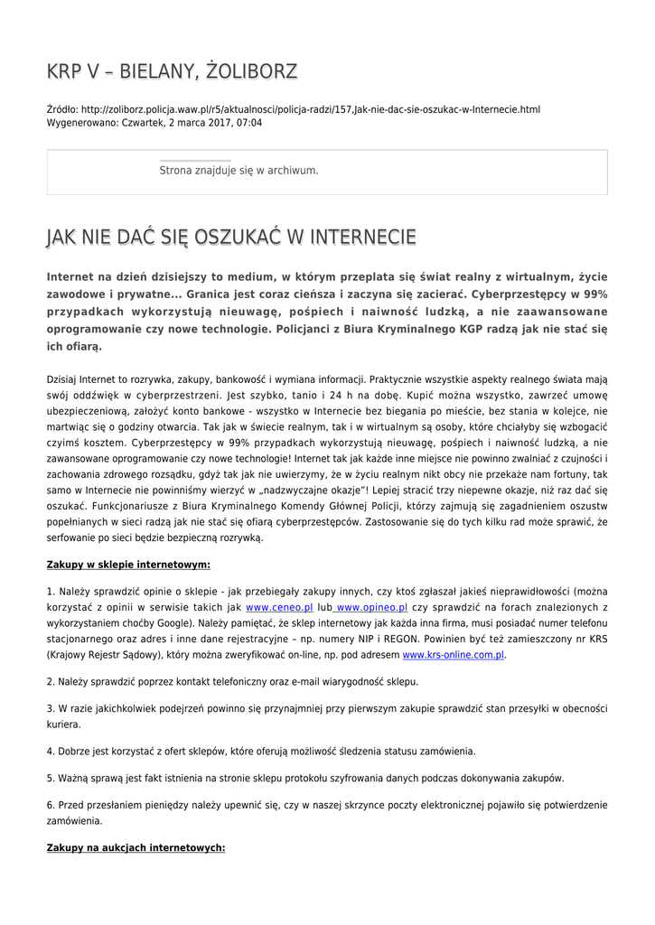 KRP V – BIELANY, ŻOLIBORZ Źródło: http://zoliborz.policja.waw.pl/r5/aktualnosci/policja-radzi/157,Jak-nie-dac-sie-oszukac-w-Internecie.html Wygenerowano: Czwartek, 2 marca 2017, 07:04 Strona znajduje się w archiwum. JAK NIE DAĆ SIĘ OSZUKAĆ W INTERNECIE Internet na dzień dzisiejszy to medium, w którym przeplata się świat realny z wirtualnym, życie zawodowe i prywatne... Granica jest coraz cieńsza i zaczyna się zacierać. Cyberprzestępcy w 99% przypadkach wykorzystują nieuwagę, pośpiech i naiwność ludzką, a nie zaawansowane oprogramowanie czy nowe technologie. Policjanci z Biura Kryminalnego KGP radzą jak nie stać się ich ofiarą. Dzisiaj Internet to rozrywka, zakupy, bankowość i wymiana informacji. Praktycznie wszystkie aspekty realnego świata mają swój oddźwięk w cyberprzestrzeni. Jest szybko, tanio i 24 h na dobę. Kupić można wszystko, zawrzeć umowę ubezpieczeniową, założyć konto bankowe - wszystko w Internecie bez biegania po mieście, bez stania w kolejce, nie martwiąc się o godziny otwarcia. Tak jak w świecie realnym, tak i w wirtualnym są osoby, które chciałyby się wzbogacić czyimś kosztem. Cyberprzestępcy w 99% przypadkach wykorzystują nieuwagę, pośpiech i naiwność ludzką, a nie zawansowane oprogramowanie czy nowe technologie! Internet tak jak każde inne miejsce nie powinno zwalniać z czujności i zachowania zdrowego rozsądku, gdyż tak jak nie uwierzymy, że w życiu realnym nikt obcy nie przekaże nam fortuny, tak samo w Internecie nie powinniśmy wierzyć w „nadzwyczajne okazje”! Lepiej stracić trzy niepewne okazje, niż raz dać się oszukać. Funkcjonariusze z Biura Kryminalnego Komendy Głównej Policji, którzy zajmują się zagadnieniem oszustw popełnianych w sieci radzą jak nie stać się ofiarą cyberprzestępców. Zastosowanie się do tych kilku rad może sprawić, że serfowanie po sieci będzie bezpieczną rozrywką. Zakupy w sklepie internetowym: 1. Należy sprawdzić opinie o sklepie - jak przebiegały zakupy innych, czy ktoś zgłaszał jakieś nieprawidłowości (można korzystać z opinii w serwisie takich jak www.ceneo.pl lub www.opineo.pl czy sprawdzić na forach znalezionych z wykorzystaniem choćby Google). Należy pamiętać, że sklep internetowy jak każda inna firma, musi posiadać numer telefonu stacjonarnego oraz adres i inne dane rejestracyjne – np. numery NIP i REGON. Powinien być też zamieszczony nr KRS (Krajowy Rejestr Sądowy), który można zweryfikować on-line, np. pod adresem www.krs-online.com.pl. 2. Należy sprawdzić poprzez kontakt telefoniczny oraz e-mail wiarygodność sklepu. 3. W razie jakichkolwiek podejrzeń powinno się przynajmniej przy pierwszym zakupie sprawdzić stan przesyłki w obecności kuriera. 4. Dobrze jest korzystać z ofert sklepów, które oferują możliwość śledzenia statusu zamówienia. 5. Ważną sprawą jest fakt istnienia na stronie sklepu protokołu szyfrowania danych podczas dokonywania zakupów. 6. Przed przesłaniem pieniędzy należy upewnić się, czy w naszej skrzynce poczty elektronicznej pojawiło się potwierdzenie zamówienia. Zakupy na aukcjach internetowych: 1. Zawsze przed transakcją należy przejrzeć komentarze użytkownika portalu aukcyjnego, należy również pamiętać, że nie liczy się tylko duża ilość pozytywnych komentarzy, które mogą być celowo „wypracowane” poprzez zakupy przedmiotów o znikomej wartości, ale też ich statystyka – na przykład kilka ostatnio dodanych negatywnych komentarzy może świadczyć o przejęciu konta uczciwie handlującego użytkownika przez dokonującego oszustwa przestępcę. 2. Należy pamiętać, że nie ma „super okazji” – zbyt niska cena też może sugerować ryzyko oszustwa. 3. O fakcie czy bierzemy udział w nieuczciwej aukcji, może powiedzieć opis aukcji lub załączone do niej zdjęcia. Pamiętać należy, że jeżeli zdjęcia nie są wykonane przez sprzedającego, tylko pochodzą np. ze strony producenta lub innej aukcji, może to świadczyć, iż sprzedający nie jest w posiadaniu wystawianego na sprzedaż towaru. 4. Jakiekolwiek podejrzenia, powinny skutkować odstąpieniem od transakcji. 5. Przed dokonaniem zapłaty powinno się skontaktować ze sprzedawcą – im więcej informacji o sobie udostępnia (np. adres i telefon) tym lepiej. 6. W wypadku przedpłaty na konto należy wybierać tylko doświadczonych pozytywnie opiniowanych sprzedawców. 7. Nie należy dokonywać transakcji przez tzw. „kupowanie poza aukcją”. (Oszuści najczęściej traktują serwis aukcyjny jako sposób pozyskania ofiary. Przestępca proponuje nieświadomej zagrożenia osobie zakup po niższej cenie, ale bez pośrednictwa serwisu – choćby po to, by uniknąć opłat pobieranych przez serwis aukcyjny. Należy wziąć pod uwagę, że późniejsze dochodzenie swoich roszczeń, jak i postępowanie dowodowe jest bardzo utrudnione). 8. Po zakończonej aukcji należy odczekać kilka godzin i skontaktować się samemu ze sprzedającym w celu potwierdzenia danych potrzebnych do dokonania przelewu, pamiętając że błyskawicznie otrzymany po zakończonej aukcji e-mail może być spreparowany przez oszusta. 9. Jeśli pojawia się choć cień niepewności odnośnie sprzedającego, a istnieje taka możliwość, należy wybrać funkcję depozytową portalu, unikając transakcji z osobami, które nie chcą się zgodzić na taką formę płatności. 10. Jeżeli przesyłkę przesłano za zaliczeniem pocztowym – można otworzyć paczkę przy pracowniku poczty lub kurierze i w przypadku ujawnienia oszustwa, należy spisać protokół i złożyć zawiadomienie na policji. 11. Jeżeli po aukcji zakończonej sprzedażą (przeważnie niespodziewanie wysoką kwotą) okaże się, że kupujący pochodzi z zagranicy (najczęściej z Afryki), nie należy wysyłać towaru, dopóki pieniądze nie zostaną zaksięgowane na koncie, nie reagując na e-mail’e, że pieniądze zostały chwilowo wstrzym