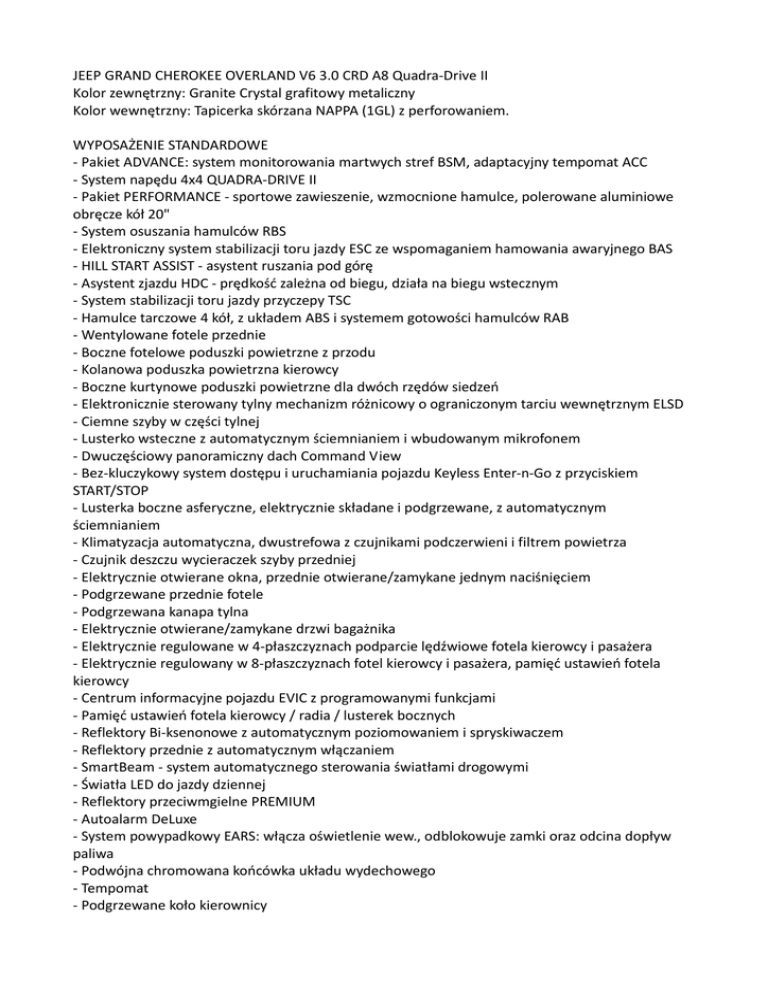 JEEP GRAND CHEROKEE OVERLAND V6 3.0 CRD A8 Quadra-Drive II Kolor zewnętrzny: Granite Crystal grafitowy metaliczny Kolor wewnętrzny: Tapicerka skórzana NAPPA (1GL) z perforowaniem. WYPOSAŻENIE STANDARDOWE - Pakiet ADVANCE: system monitorowania martwych stref BSM, adaptacyjny tempomat ACC - System napędu 4x4 QUADRA-DRIVE II - Pakiet PERFORMANCE - sportowe zawieszenie, wzmocnione hamulce, polerowane aluminiowe obręcze kół 20" - System osuszania hamulców RBS - Elektroniczny system stabilizacji toru jazdy ESC ze wspomaganiem hamowania awaryjnego BAS - HILL START ASSIST - asystent ruszania pod górę - Asystent zjazdu HDC - prędkość zależna od biegu, działa na biegu wstecznym - System stabilizacji toru jazdy przyczepy TSC - Hamulce tarczowe 4 kół, z układem ABS i systemem gotowości hamulców RAB - Wentylowane fotele przednie - Boczne fotelowe poduszki powietrzne z przodu - Kolanowa poduszka powietrzna kierowcy - Boczne kurtynowe poduszki powietrzne dla dwóch rzędów siedzeń - Elektronicznie sterowany tylny mechanizm różnicowy o ograniczonym tarciu wewnętrznym ELSD - Ciemne szyby w części tylnej - Lusterko wsteczne z automatycznym ściemnianiem i wbudowanym mikrofonem - Dwuczęściowy panoramiczny dach Command View - Bez-kluczykowy system dostępu i uruchamiania pojazdu Keyless Enter-n-Go z przyciskiem START/STOP - Lusterka boczne asferyczne, elektrycznie składane i podgrzewane, z automatycznym ściemnianiem - Klimatyzacja automatyczna, dwustrefowa z czujnikami podczerwieni i filtrem powietrza - Czujnik deszczu wycieraczek szyby przedniej - Elektrycznie otwierane okna, przednie otwierane/zamykane jednym naciśnięciem - Podgrzewane przednie fotele - Podgrzewana kanapa tylna - Elektrycznie otwierane/zamykane drzwi bagażnika - Elektrycznie regulowane w 4-płaszczyznach podparcie lędźwiowe fotela kierowcy i pasażera - Elektrycznie regulowany w 8-płaszczyznach fotel kierowcy i pasażera, pamięć ustawień fotela kierowcy - Centrum informacyjne pojazdu EVIC z programowanymi funkcjami - Pamięć ustawień fotela kierowcy / radia / lusterek bocznych - Reflektory Bi-ksenonowe z automatycznym poziomowaniem i spryskiwaczem - Reflektory przednie z automatycznym włączaniem - SmartBeam - system automatycznego sterowania światłami drogowymi - Światła LED do jazdy dziennej - Reflektory przeciwmgielne PREMIUM - Autoalarm DeLuxe - System powypadkowy EARS: włącza oświetlenie wew., odblokowuje zamki oraz odcina dopływ paliwa - Podwójna chromowana końcówka układu wydechowego - Tempomat - Podgrzewane koło kierownicy - Zestaw 9 głośników Alpine Premium, subwoofer, wzmacniacz o mocy 506 W, Matrix Surround Sound - Sterowanie radiem w kole kierownicy - System multimedialny Smartouch 4 z Nawigacja i ekranem dotykowym 8.4" z DAB + CD - System komunikacji bezprzewodowej UConnect Phone - Port USB - Koło kierownicy - połączenie drewna i skóry - Zawieszenie pneumatyczne Quadra-Lift - Kolumna kierownicy regulowana elektrycznie w dwóch płaszczyznach, z pamięcią ustawień - Stalowe koło zapasowe - Aluminiowe obręcze kół 20" X 8.0" - System zarządzania trakcją Selec-Terrain (5 trybów: Auto, Sport, Śnieg, Piasek/Błoto, Skały) - Kamera podglądu drogi cofania ParkView - Asystent parkowania przodem/tyłem ParkSense - System monitorowania martwego pola BSD - Łopatki zmiany biegów przy kierownicy - Skórzane obszycie deski rozdzielczej, podłokietników w drzwiach i centralnego podłokietnika - Monitorowanie ciśnienia kół z wyświetlaczem WYPOSAŻENIE DODATKOWE - lakier metalizowany OFERTA SPECJALNA 265 500,- BRUTTO