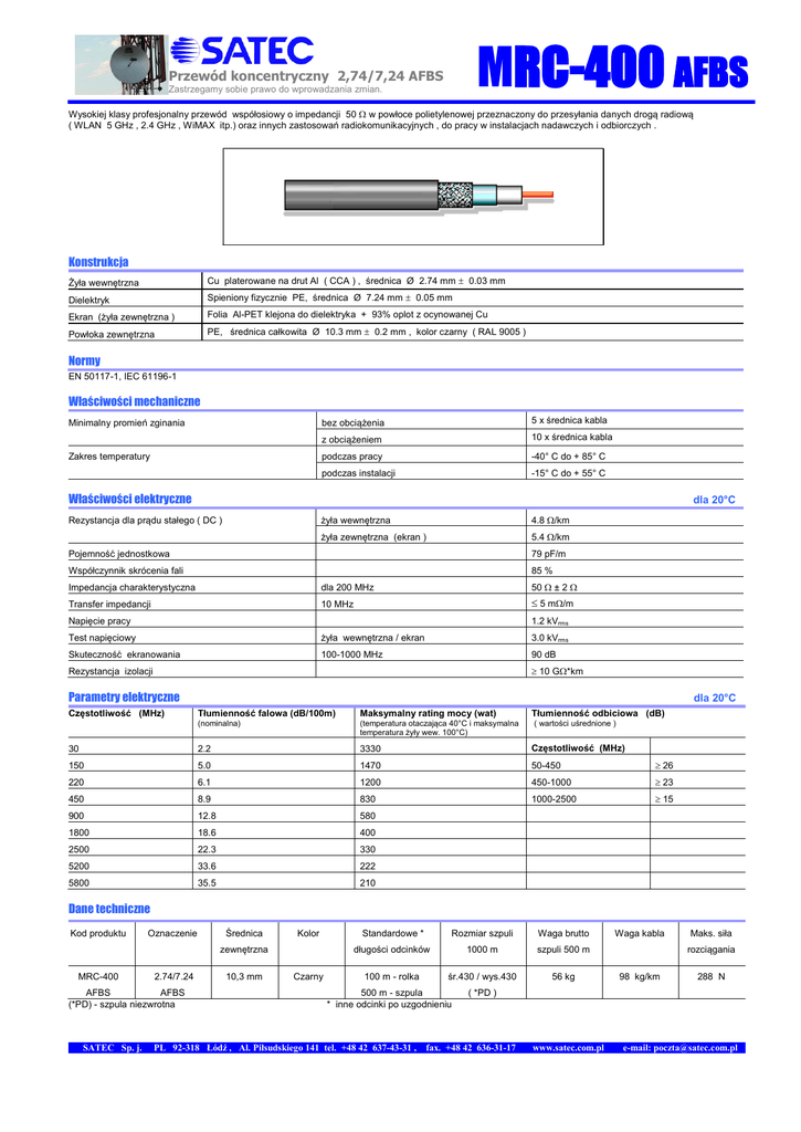 MRC-400 AFBS Przewód koncentryczny 2,74/7,24 AFBS Zastrzegamy sobie prawo do wprowadzania zmian. Wysokiej klasy profesjonalny przewód współosiowy o impedancji 50 w powłoce polietylenowej przeznaczony do przesyłania danych drogą radiową ( WLAN 5 GHz , 2.4 GHz , WiMAX itp.) oraz innych zastosowań radiokomunikacyjnych , do pracy w instalacjach nadawczych i odbiorczych . Konstrukcja Żyła wewnętrzna Cu platerowane na drut Al ( CCA ) , średnica Ø 2.74 mm 0.03 mm Dielektryk Spieniony fizycznie PE, średnica Ø 7.24 mm 0.05 mm Ekran (żyła zewnętrzna ) Folia Al-PET klejona do dielektryka + 93% oplot z ocynowanej Cu Powłoka zewnętrzna PE, średnica całkowita Ø 10.3 mm 0.2 mm , kolor czarny ( RAL 9005 ) Normy EN 50117-1, IEC 61196-1 Właściwości mechaniczne Minimalny promień zginania Zakres temperatury bez obciążenia 5 x średnica kabla z obciążeniem 10 x średnica kabla podczas pracy -40° C do + 85° C podczas instalacji -15° C do + 55° C Właściwości elektryczne dla 20°C Rezystancja dla prądu stałego ( DC ) żyła wewnętrzna 4.8 /km żyła zewnętrzna (ekran ) 5.4 /km Pojemność jednostkowa 79 pF/m Współczynnik skrócenia fali 85 % Impedancja charakterystyczna dla 200 MHz 50 ± 2 Transfer impedancji 10 MHz 5 m/m Napięcie pracy 1.2 kVrms Test napięciowy żyła wewnętrzna / ekran 3.0 kVrms Skuteczność ekranowania 100-1000 MHz 90 dB 10 G*km Rezystancja izolacji Parametry elektryczne Częstotliwość (MHz) dla 20°C Tłumienność falowa (dB/100m) Maksymalny rating mocy (wat) Tłumienność odbiciowa (dB) (nominalna) (temperatura otaczająca 40°C i maksymalna temperatura żyły wew. 100°C) 30 2.2 3330 Częstotliwość (MHz) 150 5.0 1470 50-450 26 220 6.1 1200 450-1000 23 450 8.9 830 1000-2500 15 900 12.8 580 1800 18.6 400 2500 22.3 330 5200 33.6 222 5800 35.5 210 ( wartości uśrednione ) Dane techniczne Kod produktu Oznaczenie Średnica Kolor zewnętrzna MRC-400 2.74/7.24 AFBS AFBS (*PD) - szpula niezwrotna SATEC Sp. j. 10,3 mm Czarny Standardowe * Rozmiar szpuli Waga brutto długości odcinków 1000 m szpuli 500 m 100 m - rolka śr.430 / wys.430 56 kg 500 m - szpula * inne odcinki po uzgodnieniu PL 92-318 Łódź , Al. Piłsudskiego 141 tel. +48 42 637-43-31 , Waga kabla Maks. siła rozciągania 98 kg/km 288 N ( *PD ) fax. +48 42 636-31-17 www.satec.com.pl e-mail: [email protected]