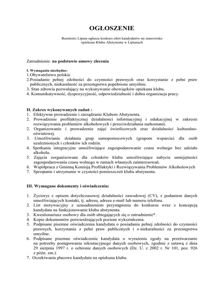 OGŁOSZENIE Burmistrz Lipian ogłasza konkurs ofert kandydatów na stanowisko opiekuna Klubu Abstynenta w Lipianach Zatrudnienie: na podstawie umowy zlecenia I. Wymagania niezbędne: 1.Obywatelstwo polskie 2.Posiadanie pełnej zdolności do czynności prawnych oraz korzystanie z pełni praw publicznych, niekaralność za przestępstwa popełnione umyślnie. 3. Stan zdrowia pozwalający na wykonywanie obowiązków opiekuna klubu. 4. Komunikatywność, dyspozycyjność, odpowiedzialność i dobra organizacja pracy. II. Zakres wykonywanych zadań : 1. Efektywne prowadzenie i zarządzanie Klubem Abstynenta. 2. Prowadzenie profilaktycznej działalności informacyjnej i edukacyjnej w zakresie rozwiązywania problemów alkoholowych i przeciwdziałania narkomanii. 2. Organizowanie i prowadzenie zajęć świetlicowych oraz działalności kulturalnooświatowej. 3. UmoŜliwianie działania grup samopomocowych (grupom wsparcia) dla osób uzaleŜnionych i członków ich rodzin. 4. Spotkania integracyjne umoŜliwiające zagospodarowanie czasu wolnego bez udziału alkoholu. 5. Zajęcia zorganizowane dla członków klubu umoŜliwiające nabycie umiejętności zagospodarowania czasu wolnego w ramach własnych zainteresowań. 6. Współpraca z Gminną Komisją Profilaktyki i Rozwiązywania Problemów Alkoholowych 7. Sprzątanie i utrzymanie w czystości pomieszczeń klubu abstynenta. III. Wymagane dokumenty i oświadczenia: 1. śyciorys z opisem dotychczasowej działalności zawodowej (CV), z podaniem danych umoŜliwiających kontakt, tj. adresu, adresu e-mail lub numeru telefonu. 2. List motywacyjny z uzasadnieniem przystąpienia do konkursu wraz z koncepcją kandydata na funkcjonowanie klubu abstynenta. 3. Kwestionariusz osobowy dla osób ubiegających się o zatrudnienie*. 4. Kopie dokumentów potwierdzających poziom wykształcenia. 5. Podpisane pisemne oświadczenia kandydata o posiadaniu pełnej zdolności do czynności prawnych, korzystaniu z pełni praw publicznych i o niekaralności za przestępstwa umyślne. 6. Podpisane pisemne oświadczenie kandydata o wyraŜeniu zgody na przetwarzanie na potrzeby postępowania rekrutacyjnego danych osobowych, zgodnie z ustawą z dnia 29 sierpnia 1997 r. o ochronie danych osobowych (Dz. U. z 2002 r. Nr 101, poz. 926 z późn. zm.). 7. Oczekiwania płacowe kandydata na opiekuna klubu. IV. Informacje dodatkowe: 1.Zatrudnienie na podstawie umowy zlecenia obejmującej minimum 60 godzin pracy miesięcznie. 2. Planowany okres zatrudnienia: kwiecień– grudzień 2013 r. V. Termin i miejsce składania dokumentów Wymagane dokumenty naleŜy składać w sekretariacie Urzędu lub przesłać pocztą na adres: Urząd Miejski w Lipianach, Plac Wolności 1, 74-240 Lipiany w terminie do dnia 24 stycznia 2013 r. w zamkniętych kopertach z napisem: „Konkurs ofert na stanowisko opiekuna Klubu Abstynenta”. Liczy się data wpływu oferty do sekretariatu Urzędu Miejskiego w Lipianach. Oferty nadesłane po terminie ich składania nie będą rozpatrywane. Nadesłanych dokumentów nie zwracamy. Zakwalifikowani kandydaci zostaną powiadomieni o terminie i miejscu rozmowy kwalifikacyjnej, a informacja o wynikach konkursu umieszczona zostanie na stronie internetowej BIP. VI. Regulacje końcowe 1. Burmistrz Lipian zastrzega sobie prawo uniewaŜnienia konkursu bez podania przyczyny lub przesunięcia terminu składania ofert. 2. Dodatkowe informacje moŜna uzyskać pod numerem telefonu 915641049 wew. 104. * Kwestionariusz osobowy dla osoby ubiegającej się o zatrudnienie, stanowi załącznik Nr 1 do rozporządzenia Ministra Pracy i Polityki Socjalnej z dnia 28 maja 1996 r. w sprawie zakresu prowadzenia przez pracodawców dokumentacji w sprawach związanych ze stosunkiem pracy oraz sposobu prowadzenia akt osobowych pracownika (Dz.U. Nr 62, poz. 286 z późn. zm.).