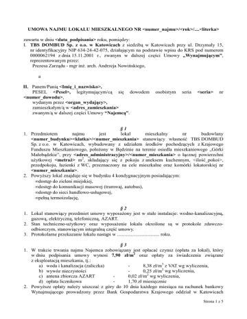 UMOWA NAJMU LOKALU MIESZKALNEGO NR <numer_najmu>/<rok>/....<literka> zawarta w dniu <data_podpisania> URNXSRPL G]\ I. TBS DOMBUD Sp. z o.o. w Katowicach ] VLHG]LE Z .DWRZLFDFK SU]\ XO 'U]\PDá\ nr identyfikacyjny NIP 634-24-42-G]LDáDMF\PQDSRdstawie wpisu do KRS pod numerem 0000062194 z dnia U ]ZDQ\P Z GDOV]HM F] FL 8PRZ\ Ä:\QDMPXMF\P´, reprezentowanym przez: 3UH]HVD=DU]GX-PJULQ*DUFK$QGU]HMD1RZLVNLHJR a II. 3DQHP3DQL,PL BLBQD]ZLVNR! PESEL <Pesel>, OHJLW\PXMF\PF VL GRZRGHP RVRELVW\P VHULD <seria> <numer_dowodu>, wydanym przez RUJDQBZ\GDMF\! ]DPLHV]NDá\PZ<adres_zamieszkania> ]ZDQ\PZGDOV]HMF] FL8PRZ\³1DMHPF´. nr §1 1. Przedmiotem najmu jest lokal mieszkalny nr budowlany <numer_budynku><klatka>/<numer_mieszkania> VWDQRZLF\ ZáDVQRü 7%6 DOMBUD Sp. z RR Z .DWRZLFDFK Z\EXGRZDQ\ ] XG]LDáHP URGNyZ SRFKRG]F\FK ] Krajowego )XQGXV]X 0LHV]NDQLRZHJR SRáR*RQ\ Z % G]LQLH QD WHUHQLH RVLHGOD PLHV]NDQLRZHJR Ä*yUNL 0DáREG]NLH´ SU]\ <adres_administracyjny>/<numer_mieszkania> R áF]QHM SRZLHU]FKQL X*\WNRZHM PHWUD*! m2 VNáDGDMF\ VL ] SRNRMX ] DQHNVHP NXFKHQQ\P LORüBSRNRL! SU]HGSRNRMX áD]LHQNL ] WC, przeznaczony na cele mieszkalne oraz komórki lokatorskiej nr <numer_mieszkania>. 2. 3RZ\*V]\ORNDO]QDMGXMHVL ZEXG\QNXNRQG\JQDF\MQ\PSRVLDGDMF\P • GRVW SGR]LHOHQLPLHMVNLHM • GRVW SGRNRPXQLNDFMLPDVRZHMWUDPZDMDXWREXV • GRVW SGRVLHFLKDQGORZR-XVáXJRZHM • SHáQWHUPRL]RODFM §2 1. /RNDOVWDQRZLF\SU]HGPLRWXPRZ\Z\SRVD*RQ\MHVWZVWDáHLQVWDODFMHwodno-NDQDOL]DF\MQ JD]RZHOHNWU\F]QWHOHIRQLF]Q$=$57 2. Stan techniczno-X*\WNRZ\ RUD] Z\SRVD*HQLH ORNDOX RNUHORQH V Z SURWRNROH ]GDZF]RRGELRUF]\PVWDQRZLF\PLQWHJUDOQF] üXPRZ\ 3. 3URWRNRODUQHSU]HND]DQLHORNDOXQDVWSLZ............. roku. §3 1. : WUDNFLH WUZDQLD QDMPX 1DMHPFD ]RERZL]DQ\ MHVW RSáDFDü F]\QV] RSáDWD ]D ORNDO NWyU\ w dniu podpisania umowy wynosi 7,90 ]áP2 RUD] RSáDW\ ]D ZLDGF]HQLD ]ZL]DQH z HNVSORDWDFMPLHV]NDQLDWM a) woda i kanalizacja (zaliczka) ]áP3 z VAT wg wyliczenia, b) Z\Zy]QLHF]\VWRFL ]áP2 wg wyliczenia, c) antena zbiorcza AZART ]áP2 wg wyliczenia, d) RSáDWDOLF]QLNRZD ]áPLHVL F]QLH 2. 3RZ\*V]H RSáDW\ QDOH*\ XLV]F]Dü ] JyU\ GR GQLD ND*GHJR PLHVLFD QD UDFKXQHN EDQNRZ\ :\QDMPXMFHJR SURZDG]RQ\ SU]H] %DQN *RVSRGDUVWZD .UDMRZHJR RGG]LDá Z .DWRZLFDFK Strona 1 z 5 nr 35 1130 1091 8300 0000 0001 8541,SRF]ZV]\RGSD(G]LHUQLNDURNX. 3. =DGDW ]DSáDW\XZD*DVL GDW ZSá\ZXURGNyZILQDQVRZ\FKQDNRQWR:\QDMPXMFHJR 4. : UD]LH ]ZáRNL Z UHJXORZDQLX RSáDW :\QDMPXMF\ QDOLF]Dü E G]LH RGVHWNL XVWDZRZH ]D ]ZáRN 5. : UD]LH JG\ 1DMHPFD Z\ND*H Z GHNODUDFML R NWyUHM PRZD Z GRFKRG\ SU]HNUDF]DMFH Z\VRNRüRNUHVORQZDUWXVWSNWXVWDZ\]GQLDSD(G]LHUQLNa 1995 r. o niektórych formach poperania budownictwa mieszkaniowego (Dz.U. 2000, nr 98, poz. 1070 ze zm.), :\QDMPXMF\ PR*H Z\SRZLHG]LHü XPRZ QDMPX Z F] FL GRW\F]FHM F]\QV]X L ]DVWRVRZDü czynsz wolny. §4 1. :\QDMPXMF\PR*HSRGZ\*V]\üOXEREQL*\üF]\QV]Z\SRZLDGDMFGRW\FKF]DVRZZ\VRNRü F]\QV]XQDMSy(QLHMQDPLHVLFQDSU]yGQDNRQLHFPLHVLFDNDOHQGDU]RZHJR 2. =PLDQD Z\VRNRFL F]\QV]X L SR]RVWDá\FK RSáDW QDVW SXMH ] GQLHP -JR QDVW SQHJR PLHVLFD po ]DZLDGRPLHQLX 1DMHPF\ SU]H] :\QDMPXMFHJR QD SRGVWDZLe pisemnego zawiadomienia o QRZHMLFKZ\VRNRFLZ\GUXNNRPSXWHURZ\ §5 1. 1DMHPFDQLHPR*HRGGDZDüSU]HGPLRWXQDMPXZSRGQDMHPOXEQLHRGSáDWQHX*\ZDQLHRVRERP WU]HFLPEH]]JRG\:\QDMPXMFHJR 2. 1DMHPFD ]RERZL]DQ\ MHVW XWU]\P\ZDü ORNDO ZH ZáDFLZ\P VWDQLH Wechnicznym i sanitarnym RUD]SU]HVWU]HJDüSRVWDQRZLH5HJXODPLQXSRU]GNXGRPRZHJRL]DVDGZVSyá*\FLDQDMHPFyZ ORNDOL Z EXG\QNDFK PLHV]NDOQ\FK VWDQRZLF\FK ZáDVQRü 7%6 '20%8' 6S ] RR w .DWRZLFDFK 5HJXODPLQX SU]\G]LDáX PLHV]ND ZFKRG]F\FK Z VNáDG ]DVRbów PLHV]NDQLRZ\FK 7%6 '20%8' 6S ] RR Z .DWRZLFDFK RUD] 8PRZ\ VSyáNL ] RJUDQLF]RQ RGSRZLHG]LDOQRFL ] GQLD U SRZRáXMFHM GR *\FLD 7%6 '20%8' 6S ] RR w Katowicach. 3. 1DMHPFD ]RERZL]DQ\ MHVW SRQDGWR GEDü L FKURQLü SU]HG XV]NRG]HQLHP OXE GHZDVWDFM F] FL EXG\QNX SU]H]QDF]RQH GR ZVSyOQHJR X*\WNX MDN NODWNL VFKRGRZH NRU\WDU]H L LQQH SRPLHV]F]HQLD RJyOQH L JRVSRGDUF]H RUD] RWRF]HQLH EXG\QNX ]LHOHFH FKRGQLNL SDUNLQJL place, drzewa, itp.). 4. 1DMHPFD SRZLQLHQ QDW\FKPLDVW XGRVW SQLü Z\QDMPXMFHPX ORNDO Z UD]LH DZDULL SRZRGXMFHM V]NRG OXE]DJUD*DMFHMEH]SRUHGQLRSRZVWDQLHPV]NRG\ 5. 1DMHPFDSRZLQLHQXGRVW SQLüORNDOZWHUPLQDFKSRGDQ\FKSU]H]Z\QDMPXMFHJRZFHOX a) GRNRQDQLD RNUHVRZHJR OXE GRUD(QHJR SU]HJOGX VWDQX LQVWDODFML L Z\SRVD*HQLD tHFKQLF]QHJRORNDOXRUD]XVWDOHQLD]DNUHVXQLH]E GQ\FKSUDFDWDN*HLFKZ\NRQDQLD b) ]DVW SF]HJR Z\NRQDQLD SU]H] :\QDMPXMFHJR SUDF REFL*DMF\FK 1DMHPF Z\NRQDQLD URF]Q\FKSU]HJOGyZLQVWDODFMLLXU]G]H 6. 1DMHPFDPR*H]D]JRG:\QDMPXMFHJRQDZáDVQ\NRV]WZSURZDG]LüZORNDOXXOHSV]HQLD §6 1. : ]DNUHVLH SUDZ L RERZL]NyZ 1DMHPF\ ]ZL]DQ\FK ] XWU]\PDQLHP QDOH*\WHJR VWDQX WHFKQLF]QHJR ORNDOX VWRVXMH VL RGRZLHGQLR SU]HSLV\ ZHZQ WU]QH GRW\F]DFH QDMHPFyZ w ORNDODFKVWDQRZLF\FKZáDVQRü7%6'20%8'6S]RR. w Katowicach. 2. 1DMHPFD]RERZL]DQ\MHVWZV]F]HJyOQRFLGR a) QDSUDZ\NRQVHUZDFMLLZ\PLDQ\XU]G]HVWDQRZLF\FKZ\SRVD*HQLHORNDOXVDQLWDUQ\FK ZUD]]DUPDWXUJD]RZ\FKRUD]HOHNWU\F]Q\FKZUD]]RVSU] WHP b) naprawy, konserwacji i wymiany instalacji wodocLJRZHM RG ]DZRUX RGFLQDMFHJR mieszkanie w pionie oraz naprawy i oczyszczania kanalizacji na odcinkach od odbiornika NUDWNLFLHNRZHMGRSLRQXNDQDOL]DFML c) QDSUDZ\ NRQVHUZDFML L SRQRV]HQLD RSáDW ]ZLD]DQ\FK ] OHJDOL]DFM XU]G]H VáX*F\FK do pomiaru ilRFL]X*\WHMZRG\ Strona 2 z 5 d) naprawy, konserwacji i wymiany instalacji elektrycznej od tablicy bezpiecznikowej w mieszkaniu, e) QDSUDZ\NRQVHUZDFMLLZ\PLDQ\SU]HZRGyZLQVWDODFMLJD]RZHMRG]ZRUyZRGFLQDMF\FK GRSá\ZJD]XGRXU]DG]HRGELRUF]\FKZUD]]NRQVHUZDFMXU]G]HRGELRUF]\FK f) QDSUDZ\ NRQVHUZDFML L SRQRV]HQLD RSáDW ]ZL]DQ\FK ] OHJDOL]DFM XU]G]H VáX*F\FK do SRPLDUXLORFL]X*\WHMZRG\ g) GRNRQ\ZDQLD ZV]HONLFK QDSUDZ RNLHQ L GU]ZL ZUD] ] QDSUDZ OXE Z\PLDQ ]DPNyZ oraz RNXüRNLHQQ\FKLGU]ZLRZ\FK h) naprawy i Z\PLDQ\SRGáyJSRVDG]HNZ\NáDG]LQSRGáRJRZ\FKZUD]]REOLVWZRZDQLHP i) QDSUDZ\ L NRQVHUZDFML SU]HZRGyZ RGSá\ZRZ\FK XU]G]H VDQLWDUQ\FK D* GR SLRQyZ ]ELRUF]\FKZW\PQLH]ZáRF]QHXVXZDQLHLFKQLHGUR*QRFL j) odnawianie lokalu poprzez: malowanie (tapetowanie) 
