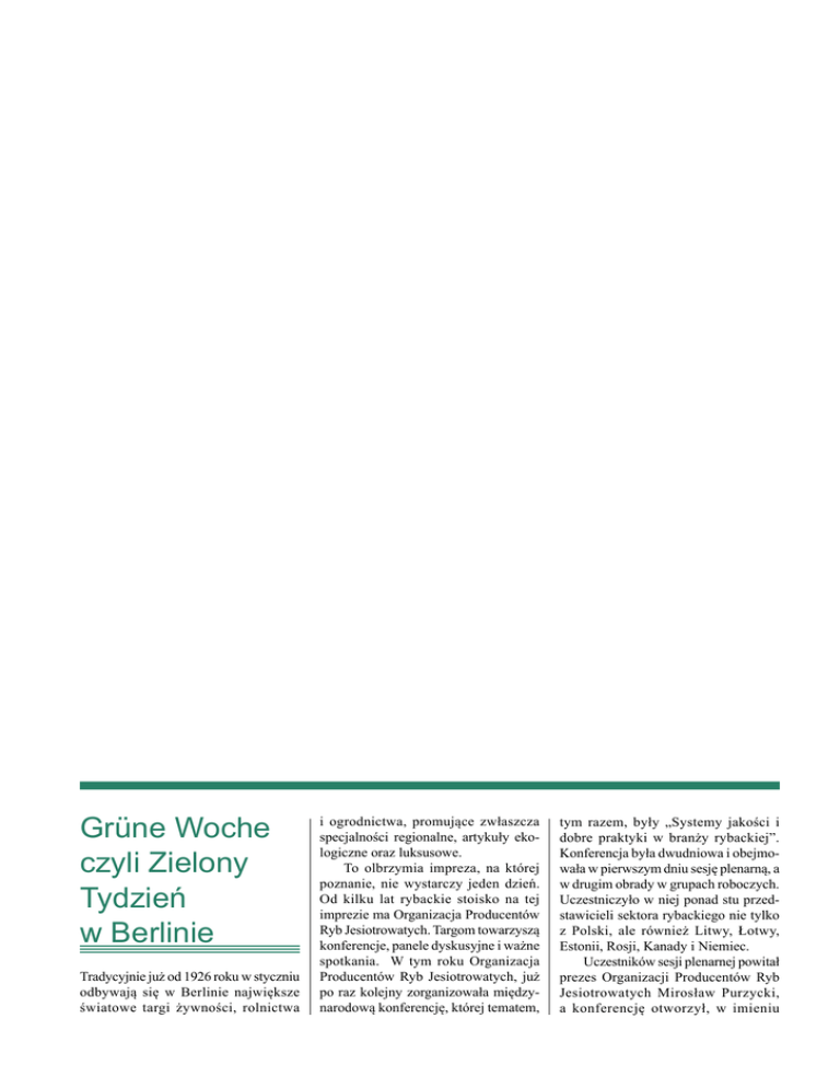 Grüne Woche czyli Zielony Tydzień w Berlinie Tradycyjnie już od 1926 roku w styczniu odbywają się w Berlinie największe światowe targi żywności, rolnictwa i ogrodnictwa, promujące zwłaszcza specjalności regionalne, artykuły ekologiczne oraz luksusowe. To olbrzymia impreza, na której poznanie, nie wystarczy jeden dzień. Od kilku lat rybackie stoisko na tej imprezie ma Organizacja Producentów Ryb Jesiotrowatych. Targom towarzyszą konferencje, panele dyskusyjne i ważne spotkania. W tym roku Organizacja Producentów Ryb Jesiotrowatych, już po raz kolejny zorganizowała międzynarodową konferencję, której tematem, tym razem, były „Systemy jakości i dobre praktyki w branży rybackiej”. Konferencja była dwudniowa i obejmowała w pierwszym dniu sesję plenarną, a w drugim obrady w grupach roboczych. Uczestniczyło w niej ponad stu przedstawicieli sektora rybackiego nie tylko z Polski, ale również Litwy, Łotwy, Estonii, Rosji, Kanady i Niemiec. Uczestników sesji plenarnej powitał prezes Organizacji Producentów Ryb Jesiotrowatych Mirosław Purzycki, a konferencję otworzył, w imieniu ministra Kazimierza Plocke, dyrektor Departamentu Rybołówstwa Tomasz Nawrocki. W swym wystąpieniu podkreślił, że Międzynarodowe Targi „Zielony Tydzień” (Grüne Woche) i towarzyszące im konferencje już od kilku lat, stanowią dla Polski platformę wymiany informacji na temat problematyki wykorzystywania funduszy europejskich, jak również prezentacji specyfiki polskiego rybactwa, jego zróżnicowania, zasad funkcjonowania i kierunków rozwoju. To także okazja do przedstawienia efektów współpracy międzynarodowej i platforma współpracy między nauką, gospodarką, organizacjami pozarządowymi i administracją. W tego rodzaju wydarzeniu nie mogło zabraknąć Organizacji Producentów Ryb Jesiotrowatych. Organizacja ta jest wiodącą jednostką chowu, hodowli i restytucji jesiotrów w Polsce, dzięki zaangażowaniu i przygotowaniu merytorycznemu zatrudnionych ichtiologów, nowoczesnej bazie produkcyjnej oraz szeroko zakrojonej współpracy. Współpraca ta z pewnością przyczynia się do rozwoju rybactwa oraz odbudowy zasobów ryb. Kończąc swoje wystąpienie dyrektor T. Nawrocki pogratulował organizatorom tak licznego uczestnictwa w konferencji i życzył wszystkim owocnych obrad. Część merytoryczną Konferencji rozpoczął Marcin Ruciński, z Polskiego Przedstawicielstwa przy UE z Brukseli, przedstawił informację o postępie prac nad Europejskim Funduszu Morsko-Rybackim. W zasadzie można ją podsumować unijnym stwierdzeniem „kiedy wszystko nie jest uzgodnione, nic nie jest uzgodnione”. Dyskusje nad Funduszem nadal trwają, bo osiągnięcie porozumienia pomiędzy Parlamentem Europejskim i Radą nie jest łatwe i można spodziewać się, że jeszcze trochę czasu upłynie, zanim strony znajdą kompromisowe rozwiązania. Realny termin to raczej koniec lutego i dlatego należy uzbroić się w cierpliwość. Niemniej jednak, widać już pewne ogólne kierunki nowego funduszu: będzie on podporządkowany celom reformy Wspólnej Polityki Rybackiej, większy nacisk zostanie położony na powiązanie rybołówstwa z ochroną środowiska Powitanie uczestników przez M. Purzyckiego Konferencję otworzył dyr. Tomasz Nawrocki Marcin Ruciński Prof. Tomasz Linkowski oraz działania wspólne, będzie mniej swobody programowania i więcej obowiązków przy dowodzeniu, że finansowane projekty wpisują się w ogólną unijną strategię (najnowsze informacje Prof. R. Kolman o EFMR znajdą Czytelnicy w odrębnym artykule M. Rucińskiego). O „Aktualnej sytuacji restytucji jesiotra w basenie Morza Bałtyckiego” mówił prof. Ryszard Kolman z Instytutu Rybactwa Śródlądowego w Olsztynie. Ten bardzo interesujący eksperyment rozwija się pozytywnie, a zarybianie jesiotrem przynosi bardzo ciekawe rezultaty i informacje nie tylko o wzroście tego gatunku, ale także jego wędrówkach. Ale, aby jesiotr na stałe mógł zadomowić się w Morzu Bałtyckim, potrzebna jest bliska współpraca z rybakami. Mówił o tym dr Jörn Gessner (Niemcy), podkreślając, że rybacy muszą zrozumieć, że aby populacja tego wolno rosnącego gatunku mogła się odrodzić i osiągnąć w miarę bezpieczną wielkość, konieczne jest wyrzucanie obecnie złowionych jesiotrów za burtę. Jest to wyzwanie, z którym należy się zmierzyć. Dr Cornel Capa z Kanady przedstawił bardzo ciekawą informację na temat działalności jego firmy zajmującej się przetwórstwem dzikich jesiotrów w Kanadzie. To raczej ewenement na kontynencie amerykańskim, bowiem tylko w Kanadzie udało się zachować dziką populację jesiotra i w sposób rozsądny ją eksploatować. Głównym otrzymywanym produktem jest oczywiście kawior, ale ważne jest również maksymalne wykorzystanie mięsa jesiotra i budowanie rynku dla tych produktów. Skala produkcji nie jest masowa i firma przetwarza rocznie około 350 jesiotrów, bo tylko taka kwota jest dostępna, biorąc pod uwagę zarządzanie ich zasobami. Ważną działalnością firmy jest również produkcja narybku jesiotra do zarybień, zarówno hodowlanych jak i wód otwartych. „Główne problemy polskiego rybołówstwa bałtyckiego z podkreśleniem zagadnień połowów, zbytu i jakości surowca dorsza” to tytuł prezentacji przedstawionej przez prof. Tomasza Linkowskiego z Morskiego Instytutu Rybackiego-Państwowego Instytutu Badawczego. Zwrócił on uwagę na poważne zagrożenie, w szczególności dla rybołówstwa przybrzeżnego, jakie niesie nadmierny rozwój populacji fok na Bałtyku, skutkujący nie tylko bezpośrednimi szkodami w rybołówstwie łososiowym, ale także rosnącym zapasożyceniem dorsza larwami nicieni, których żywicielem ostatecznym są foki. Omówił on również problemy związane z niewykorzystywaniem polskiej kwoty połowowej dorszy i opłacalnością połowów tego gatunku. Jerzy Safader – prezes Polskiego Stowarzyszenia 