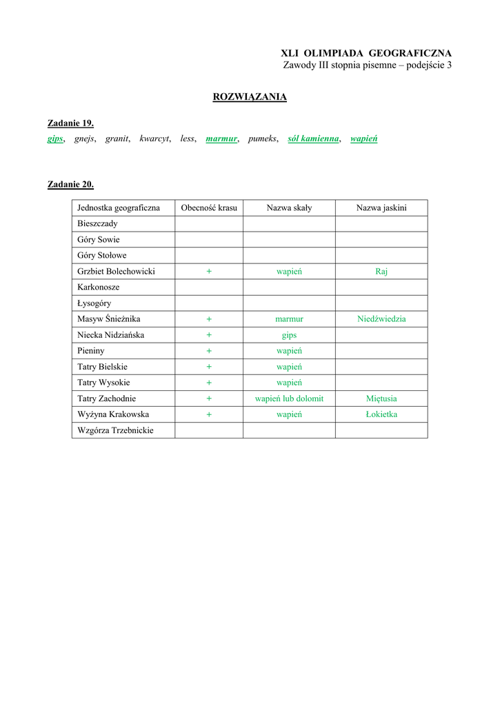 -3r/1- XLI OLIMPIADA GEOGRAFICZNA Zawody III stopnia pisemne – podejście 3 ROZWIĄZANIA Zadanie 19. gips, gnejs, granit, kwarcyt, less, marmur, pumeks, sól kamienna, wapień Zadanie 20. Obecność krasu Nazwa skały Nazwa jaskini + wapień Raj Masyw Śnieżnika + marmur Niedźwiedzia Niecka Nidziańska + gips Pieniny + wapień Tatry Bielskie + wapień Tatry Wysokie + wapień Tatry Zachodnie + wapień lub dolomit Miętusia Wyżyna Krakowska + wapień Łokietka Jednostka geograficzna Bieszczady Góry Sowie Góry Stołowe Grzbiet Bolechowicki Karkonosze Łysogóry Wzgórza Trzebnickie -3r/2- Zadanie 21. Istotny wpływ na ukształtowanie powierzchni ziemi wywierają zjawiska wulkaniczne. Magma może zastygać pod powierzchnią ziemi, tworząc (batolity / megality / petroglify), zbudowane najczęściej z (bazaltów / granitów / łupków krystalicznych). Lawa może wydobywać się na powierzchnię bądź punktowo (dajkami / kominami wulkanicznymi / sillami), bądź też z długich szczelin (wylewy linearne / wylewy pasożytnicze / wylewy subdukcyjne). Ten drugi typ wylewów powszechny był w minionych epokach geologicznych. W ten sposób powstały np. rozległe pokrywy lawowe na Dekanie, zwane tam (ghatami / thabat dhabat / trapami). Obecnie są one rzadko spotykane, w czasach nowożytnych miały miejsce na (Islandii / Tristan da Cunha / Wyspach Zielonego Przylądka) na Atlantyku oraz w Afryce na terenie (Rowu Środkowoafrykańskiego / wyżyny Adamawa w Kamerunie / zapadliska Afar). Współcześnie zdecydowanie przeważa wulkanizm centralny (punktowy). Powstają wówczas różne formy terenu. Rozległe tarcze wulkaniczne (typ hawajski) związane są z wylewami (law zasadowych o małej lepkości / law kwaśnych o dużej lepkości). Natomiast (lawy zasadowe o małej lepkości / lawy kwaśne o dużej lepkości) tworzą stożki o znacznej nawet stromości stoków. Z naprzemianległych warstw (law zasadowych i kwaśnych / pokryw lawowych i materiałów piroklastycznych) zbudowane są stratowulkany (np. Etna na Sycylii). Natomiast kaldery to rozległe obniżenia, zwykle otoczone wałem, (powstałe w wyniku zapadnięcia górnej części wzniesienia wulkanicznego po opróżnieniu zbiornika magmowego / połączenia kilku kominów wulkanicznych / procesu przekształcania wulkanizmu szczelinowego w centralny). Wybuchom wulkanów towarzyszą niekiedy chmury gorejące i spływy piroklastyczne. W skali globalnej chmury gorejące i spływy piroklastyczne powodują (znacznie więcej / znacznie mniej) ofiar śmiertelnych niż potoki lawowe. Na wyspach Morza Śródziemnego czynne wulkany występują nie tylko na Sycylii, ale także na: (Elbie / Wyspach Liparyjskich / Sardynii) oraz na (Balearach / Cykladach / Wyspach Jońskich). -3r/3- Zadanie 22. A. Poniżej przedstawiono przykładowe poprawne odpowiedzi. rów tektoniczny synklina 3 3 3 2 2 4 3 2 2 1 1 1 1 monoklina uskok normalny 3 4 3 2 3 1 2 6 5 2 1 1 zrąb tektoniczny antyklina 3 2 3 3 4 2 3 2 1 2 1 1 1 B. Którą literą – A, B, czy C – oznaczono na szkicu odcinek równy miąższości warstwy? A B C C B A -3r/4- Zadanie 23. A. Fronty atmosferyczne rozdzielają masy powietrza o różnej temperaturze. W którym punkcie na mapie „a” występuje najcieplejsza masa powietrza? X Y Z B. Na której mapie synoptycznej przedstawiono warunki, w których średnia prędkość wiatru w Polsce była najmniejsza? na mapie „a” na mapie „b” na mapie „c” C. W sytuacji meteorologicznej przedstawionej na mapie „c”, w którym mieście można spodziewać się największego zachmurzenia? w Madrycie w Rzymie w Budapeszcie w Moskwie D. Na której mapie synoptycznej przedstawiono warunki sprzyjające powstaniu wiatru halnego w Tatrach? na mapie „a” na mapie „b” na mapie „c” Zadanie 24. A. Peryferyjna część wyżu barycznego, w której izobary przyjmują kształt litery „U”, to klin. B. Rodzaj cyrkulacji atmosferycznej typowej dla niżów barycznych to cyklon. C. Układ baryczny cechujący się występowaniem dwóch wyżów i dwóch niżów barycznych ułożonych na krzyż to siodło. Zadanie 25. Zwierzę Góry Argali Goryl górski Guanako Kozica Ałtaj Wirunga Andy Alpy Graickie Kozioł śnieżny (koza śnieżna) Alaska Niedźwiedź himalajski (tybetański) Sichote-Aliń Roślina Cedr atlantycki Espelecje Sekwoja wiecznie zielona Sosna długowieczna Szarotka alpejska Złocień Zawadzkiego Góry Atlas Andy Góry Nadbrzeżne (Kalifornia/Oregon) Góry Białe (Kalifornia) Tatry Zachodnie Pieniny
