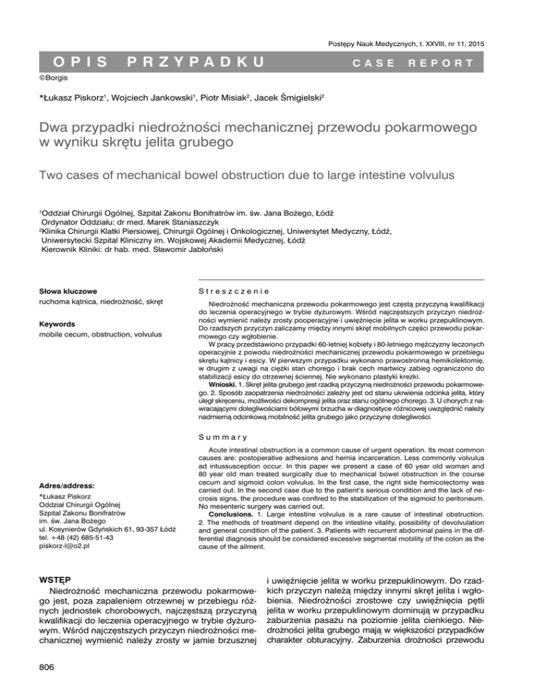 Postępy Nauk Medycznych, t. XXVIII, nr 11, 2015 OPIS PRZYPADKU CASE REPORT ©Borgis *Łukasz Piskorz1, Wojciech Jankowski1, Piotr Misiak2, Jacek Śmigielski2 Dwa przypadki niedrożności mechanicznej przewodu pokarmowego w wyniku skrętu jelita grubego Two cases of mechanical bowel obstruction due to large intestine volvulus 1 Oddział Chirurgii Ogólnej, Szpital Zakonu Bonifratrów im. św. Jana Bożego, Łódź Ordynator Oddziału: dr med. Marek Staniaszczyk 2 Klinika Chirurgii Klatki Piersiowej, Chirurgii Ogólnej i Onkologicznej, Uniwersytet Medyczny, Łódź, Uniwersytecki Szpital Kliniczny im. Wojskowej Akademii Medycznej, Łódź Kierownik Kliniki: dr hab. med. Sławomir Jabłoński Słowa kluczowe Streszczenie ruchoma kątnica, niedrożność, skręt Niedrożność mechaniczna przewodu pokarmowego jest częstą przyczyną kwalifikacji do leczenia operacyjnego w trybie dyżurowym. Wśród najczęstszych przyczyn niedrożności wymienić należy zrosty pooperacyjne i uwięźnięcie jelita w worku przepuklinowym. Do rzadszych przyczyn zaliczamy między innymi skręt mobilnych części przewodu pokarmowego czy wgłobienie. W pracy przedstawiono przypadki 60-letniej kobiety i 80-letniego mężczyzny leczonych operacyjnie z powodu niedrożności mechanicznej przewodu pokarmowego w przebiegu skrętu kątnicy i esicy. W pierwszym przypadku wykonano prawostronną hemikolektomię, w drugim z uwagi na ciężki stan chorego i brak cech martwicy zabieg ograniczono do stabilizacji esicy do otrzewnej ściennej. Nie wykonano plastyki krezki. Wnioski. 1. Skręt jelita grubego jest rzadką przyczyną niedrożności przewodu pokarmowego. 2. Sposób zaopatrzenia niedrożności zależny jest od stanu ukrwienia odcinka jelita, który uległ skręceniu, możliwości dekompresji jelita oraz stanu ogólnego chorego. 3. U chorych z nawracającymi dolegliwościami bólowymi brzucha w diagnostyce różnicowej uwzględnić należy nadmierną odcinkową mobilność jelita grubego jako przyczynę dolegliwości. Keywords mobile cecum, obstruction, volvulus Summary Adres/address: *Łukasz Piskorz Oddział Chirurgii Ogólnej Szpital Zakonu Bonifratrów im. św. Jana Bożego ul. Kosynierów Gdyńskich 61, 93-357 Łódź tel. +48 (42) 685-51-43 [email protected] Acute intestinal obstruction is a common cause of urgent operation. Its most common causes are: postoperative adhesions and hernia incarceration. Less commonly volvulus ad intussusception occur. In this paper we present a case of 60 year old woman and 80 year old man treated surgically due to mechanical bowel obstruction in the course cecum and sigmoid colon volvulus. In the first case, the right side hemicolectomy was carried out. In the second case due to the patient’s serious condition and the lack of necrosis signs, the procedure was confired to the stabilization of the sigmoid to peritoneum. No mesenteric surgery was carried out. Conclusions. 1. Large intestine volvulus is a rare cause of intestinal obstruction. 2. The methods of treatment depend on the intestine vitality, possibility of devolvulation and general condition of the patient. 3. Patients with recurrent abdominal pains in the differential diagnosis should be considered excessive segmental mobility of the colon as the cause of the ailment. WSTĘP Niedrożność mechaniczna przewodu pokarmowego jest, poza zapaleniem otrzewnej w przebiegu różnych jednostek chorobowych, najczęstszą przyczyną kwalifikacji do leczenia operacyjnego w trybie dyżurowym. Wśród najczęstszych przyczyn niedrożności mechanicznej wymienić należy zrosty w jamie brzusznej 806 i uwięźnięcie jelita w worku przepuklinowym. Do rzadkich przyczyn należą między innymi skręt jelita i wgłobienia. Niedrożności zrostowe czy uwięźnięcia pętli jelita w worku przepuklinowym dominują w przypadku zaburzenia pasażu na poziomie jelita cienkiego. Niedrożności jelita grubego mają w większości przypadków charakter obturacyjny. Zaburzenia drożności przewodu Dwa przypadki niedrożności mechanicznej przewodu pokarmowego w wyniku skrętu jelita grubego pokarmowego w przebiegu skrętu lub wgłobienia mogą dotyczyć zarówno jelita cienkiego, jak i grubego. Skręt jelita grubego jest rzadką przyczyną niedrożności. Zaobserwowano różnice geograficzne w częstości występowania skrętu jelita grubego – częstsze występowanie w krajach Bliskiego Wschodu i w Afryce. By doszło do skrętu, muszą zaistnieć sprzyjające warunki anatomiczne w postaci dużej mobilności jelita w wyniku długiej krezki. Najczęściej skręceniu ulega esica, rzadko kątnica i poprzecznica. Wśród czynników sprzyjających wymienia się dietę bogatoresztkową. W diagnostyce poza badaniem klinicznym wykorzystuje się badania obrazowe: przeglądowe zdjęcie jamy brzusznej w pozycji stojącej, na którym stwierdzić można obraz typu pętli omega, tomografia komputerowa jamy brzusznej. Metody leczenia podzielić można na metody endoskopowe i operacyjne. Sposób postępowania zależny jest w dużej mierze od stanu chorego i prezentowanych objawów klinicznych. OPIS PIERWSZEGO PRZYPADKU Chora lat 60, przyjęta do oddziału z powodu objawów niedrożności przewodu pokarmowego. Retrospektywna ocena chorego Chora od wielu lat pod opieką poradni gastroenterologicznej z powodu nawracających dolegliwości bólowych brzucha z towarzyszącym wzdęciem brzucha, zatrzymaniem gazów i stolca. Z tego powodu wykonano u chorej dwukrotnie kolonoskopię. Podczas badania poza trzema polipami hiperplastycznymi średnicy 3, 4 i 4 mm (usuniętymi drogą endoskopową) nie stwierdzono patologii. Na podstawie przeprowadzonych badań rozpoznano zespół jelita drażliwego. W wywiadzie: choroba niedokrwienna serca, nadkomorowe zaburzenia rytmu, refluks żółciowy i zapalenie błony śluzowej żołądka. Z tego powodu chora leczona: Setalem, Metocardem PPI, Duspatalinem. Wywiad rodzinny w kierunku chorób nowotworowych przewodu pokarmowego negatywny.