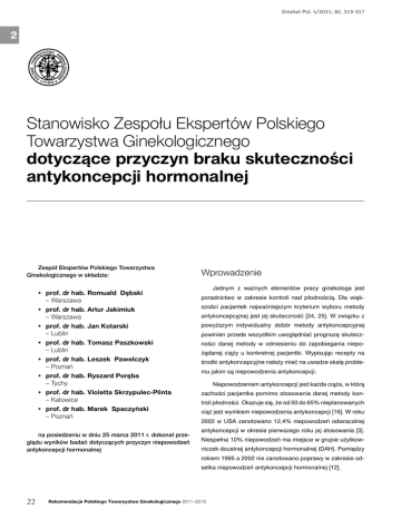 Ginekol Pol. 4/2011, 82, 313-317 2 Stanowisko Zespołu Ekspertów Polskiego Towarzystwa Ginekologicznego dotyczące przyczyn braku skuteczności antykoncepcji hormonalnej Zespół Ekspertów Polskiego Towarzystwa Ginekologicznego w składzie: • prof. dr hab. Romuald Dębski – Warszawa • prof. dr hab. Artur Jakimiuk – Warszawa • prof. dr hab. Jan Kotarski – Lublin • prof. dr hab. Tomasz Paszkowski – Lublin • prof. dr hab. Leszek Pawelczyk – Poznań • prof. dr hab. Ryszard Poręba – Tychy • prof. dr hab. Violetta Skrzypulec-Plinta – Katowice • prof. dr hab. Marek Spaczyński – Poznań na posiedzeniu w dniu 25 marca 2011 r. dokonał przeglądu wyników badań dotyczących przyczyn niepowodzeń antykoncepcji hormonalnej Wprowadzenie Jednym z ważnych elementów pracy ginekologa jest poradnictwo w zakresie kontroli nad płodnością. Dla większości pacjentek najważniejszym kryterium wyboru metody antykoncepcyjnej jest jej skuteczność [24, 25]. W związku z powyższym indywidualny dobór metody antykoncepcyjnej powinien przede wszystkim uwzględniać prognozę skuteczności danej metody w odniesieniu do zapobiegania niepożądanej ciąży u konkretnej pacjentki. Wypisując recepty na środki antykoncepcyjne należy mieć na uwadze skalę problemu jakim są niepowodzenia antykoncepcji. Niepowodzeniem antykoncepcji jest każda ciąża, w którą zachodzi pacjentka pomimo stosowania danej metody kontroli płodności. Okazuje się, że od 50 do 65% nieplanowanych ciąż jest wynikiem niepowodzenia antykoncepcji [16]. W roku 2002 w USA zanotowano 12,4% niepowodzeń odwracalnej antykoncepcji w okresie pierwszego roku jej stosowania [3]. Niespełna 10% niepowodzeń ma miejsce w grupie użytkowniczek doustnej antykoncepcji hormonalnej (DAH). Pomiędzy rokiem 1995 a 2002 nie zanotowano poprawy w zakresie odsetka niepowodzeń antykoncepcji hormonalnej [12]. 22 Rekomendacje Polskiego Towarzystwa Ginekologicznego 2011–2015 Ginekol Pol. 4/2011, 82, 313-317 Stanowisko Zespołu Ekspertów PTG dotyczące przyczyn braku skuteczności antykoncepcji hormonalnej. Ryzyko niepowodzenia antykoncepcji jest największe w następujących grupach pacjentek [9]: – kobiety niezamężne, – kobiety z niskim statusem socjoekonomicznym, – kobiety przed 25 r. ż. Ryzyko niepowodzenia antykoncepcji zależy głównie od metody kontroli nad płodnością. W badaniu przeprowadzonym we Francji najwyższy odsetek kobiet zachodzących w ciążę w 1-szym roku jej stosowania dotyczył użytkowniczek środków plemnikobójczych (21,7%), podczas gdy najniższy zaobserwowano w grupie pacjentek z wkładką wewnątrzmaciczną (1,1%) [15]. W badaniu tym odsetek zachodzących w ciążę użytkowniczek doustnej antykoncepcji hormonalnej wynosił 2,4%. W innym badaniu analizującym ten sam parametr również najgorszy wskaźnik dotyczył spermicidów (26% pacjentek doświadczających niepowodzenia antykoncepcji podczas pierwszych 12 m-cy stosowania tej metody) [9]. W tym z kolei badaniu aż 8% pacjentek stosujących tabletkę antykoncepcyjną zachodziło w ciążę w ciągu roku od rozpoczęcia stosowania tej metody. Oba cytowane powyżej badania nie uwzględniały w analizie porównawczej nowoczesnych metod antykoncepcji hormonalnej o przedłużonym działaniu takich jak plaster czy pierścień dopochwowy. W odniesieniu do obu powyższych metod procent kobiet zachodzących w ciążę w pierwszym roku ich stosowania waha się między 0,5 a 0,8 [20, 27]. Wśród przyczyn niepowodzenia antykoncepcji należy wyróżnić przyczyny zależne od lekarza, pacjentki i wreszcie od samej metody. Przykładem jatrogennych przyczyn niepowodzenia antykoncepcji może być nieprawidłowe założenie wkładki wewnątrzmacicznej lub zbyt schematyczne zalecanie metody kontroli płodności bez stosowania zasady indywidualizacji. Niepowodzenia antykoncepcji bezpośrednio zależne od stosowanej metody mają na ogół złożony charakter. Najpowszechniej stosowaną miarą niezawodności metody jest wskaźnik Pearl’a zdefiniowany przed ponad 70 laty jako wskaźnik niepowodzeń w grupie 100 kobiet stosujących daną metodę przez 12 miesięcy. Należy pamiętać o tym, że wskaźnik Pearl’a podawany przez producentów środków antykoncepcyjnych dotyczy na ogół sytuacji perfekcyjnego stosowania danej metody. Ponieważ u podłoża wielu niepowodzeń antykoncepcji leżą błędy użytkowniczki, w odniesieniu do większości metod antykoncepcji istnieją znaczne różnice miedzy wskaźnikiem Pearl’a dla perfekcyjnego i realnego tj. uwzględniającego błędy użytkowniczki, stosowania danej metody. Wskaźnik Pearl’a dla doustnej antykoncepcji hormonalnej po uwzględnieniu błędów użytkowniczki jest według różnych Autorów od 3 do 30 razy wyższy aniżeli w warunkach perfekcyjnego stosowania tej metody [2, 23]. A zatem stwierdzenie, iż doustna antykoncepcja hormonalna charakteryzuje się bardzo wysoką skutecznością jest prawdziwe, ale jedynie przy założeniu bezbłędnego stosowania tej metody przez pacjentkę. © Wielkopolskie Towarzystwo Onkologii Ginekologicznej 2 Rozpiętość „widełek” wartości Indeksu Pearl’a między perfekcyjnym i nie perfekcyjnym stosowaniem danej metody jest zdecydowanie mniejsza w odniesieniu do metod antykoncepcji hormonalnej o przedłużonym działaniu, które nie wymagają codziennej aplikacji a ponadto charakteryzują się dość szerokim marginesem bezpieczeństwa po błędzie użytkowniczki. Dla hormonalnej antykoncepcji transdermalnej nawet po uwzględnieniu błędów użytkowniczki wskaźnik Pearl’a różni się zaledwie o 25-30% od tego jaki charakteryzuje tę metodę przy perfekcyjnym jej stosowaniu [4, 23, 27]. Z kolei w odniesieniu do pierścienia dopochwowego Indeks Pearl’a uwzględniający błędy użytkowniczki wzrasta o 53% [7]. Okazuje się, że skala zjawiska w postaci błędów użytkowniczek doustnej antykoncepcji hormonalnej jest bardzo duża. Niepr